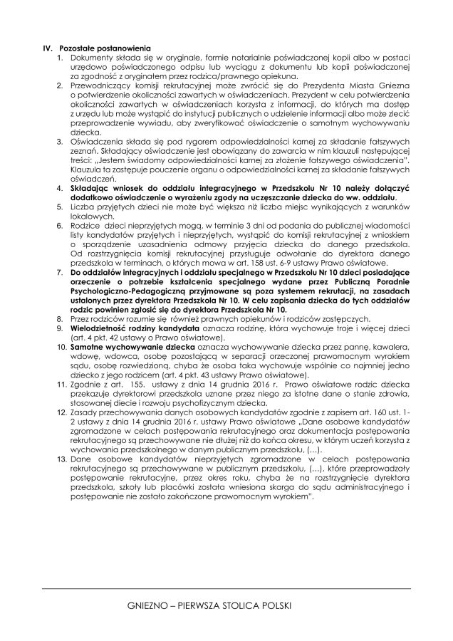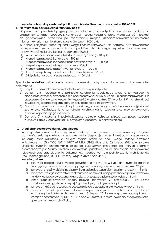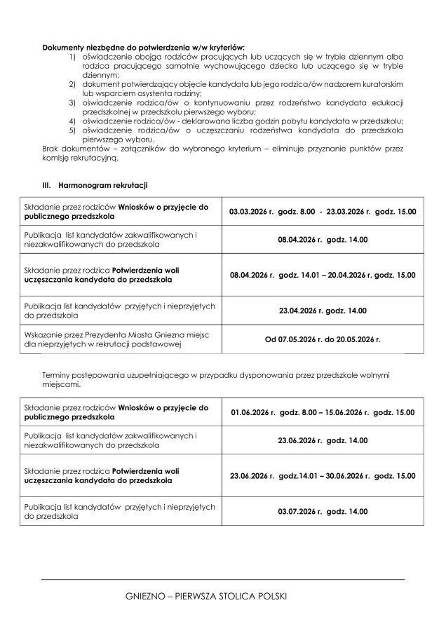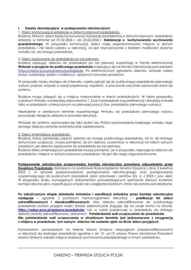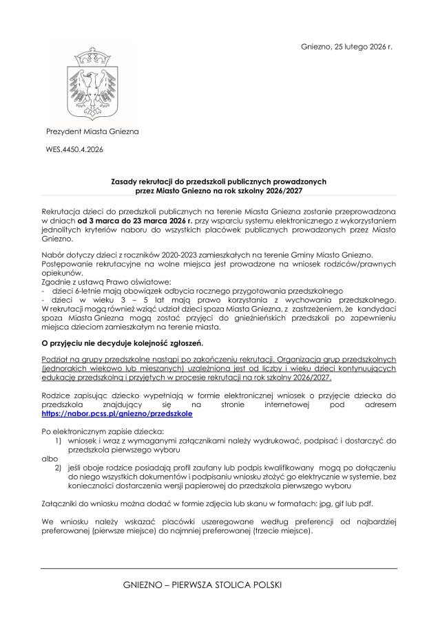 Zasady rekrutacji do przedszkoli publicznych prowadzonych przez Miasto Gniezno na rok szkolny 2026/2027