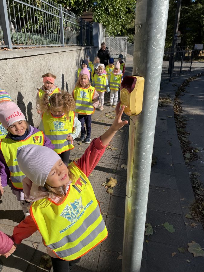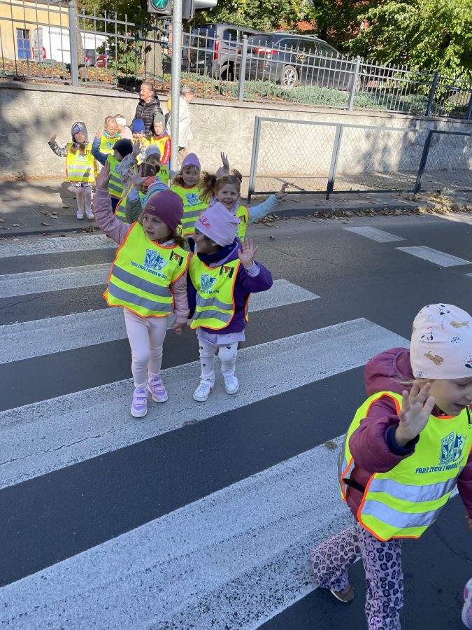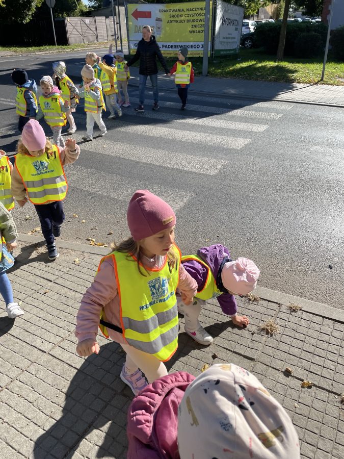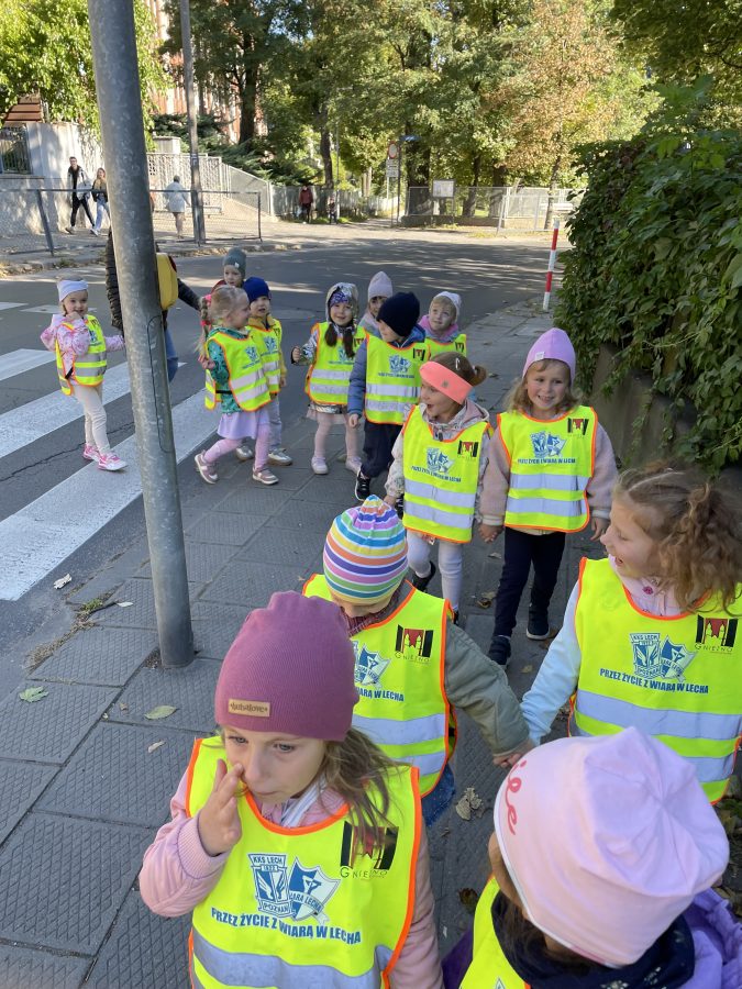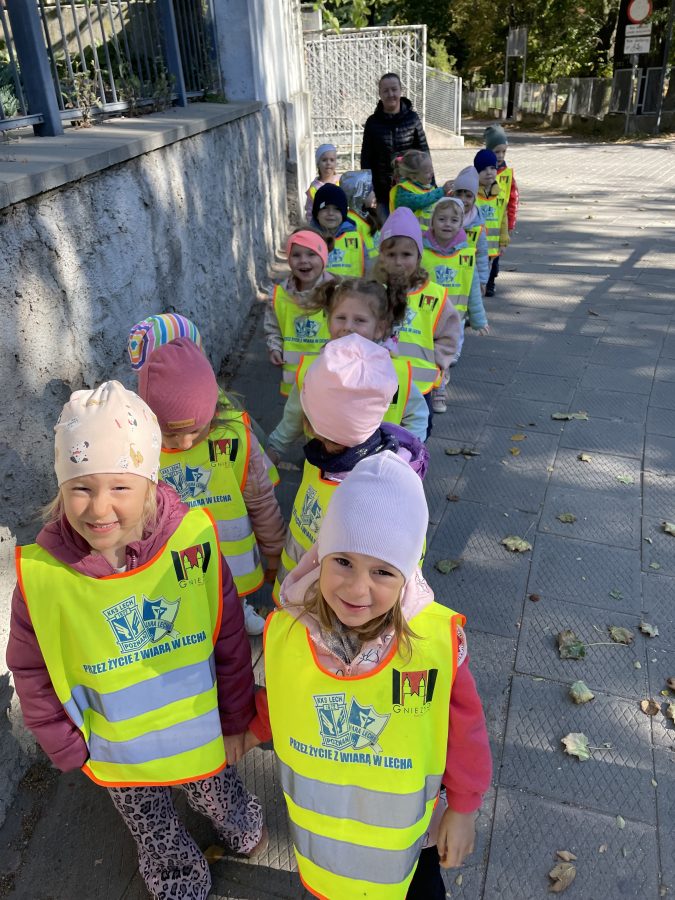 W ramach akcji „Bezpieczny przedszkolak”  dzieci z grupy Czerwone Plastusie wybrały się na spacer ulicami Gniezna.  Oczywiście obowiązkowo w kamizelkach odblaskowych. Poszukiwaliśmy znaków drogowych, przyglądaliśmy się pojazdom i sygnalizatorom świetlnym. Następnie dzieci przechodziły przez przejścia dla pieszych. To była bardzo ważna lekcja o bezpieczeństwie.