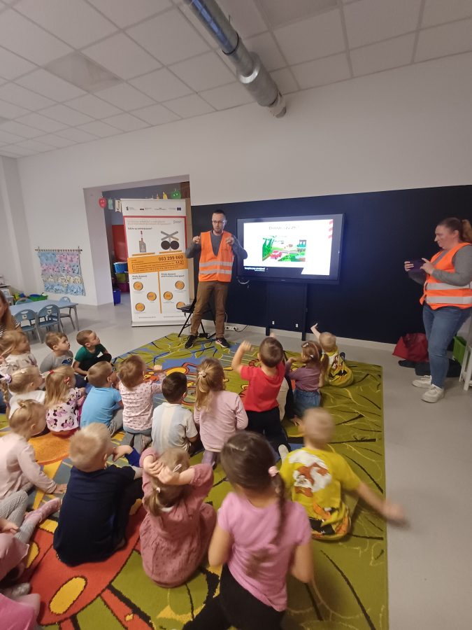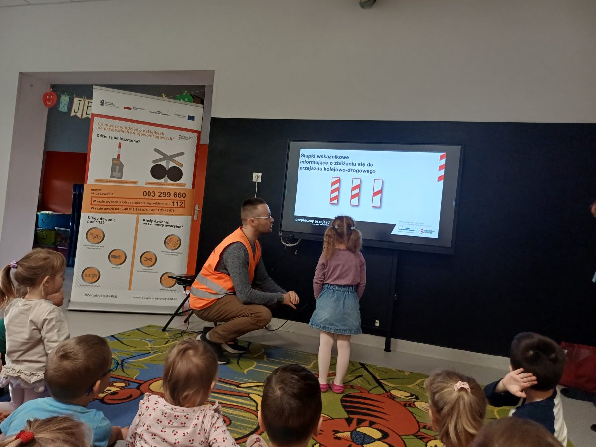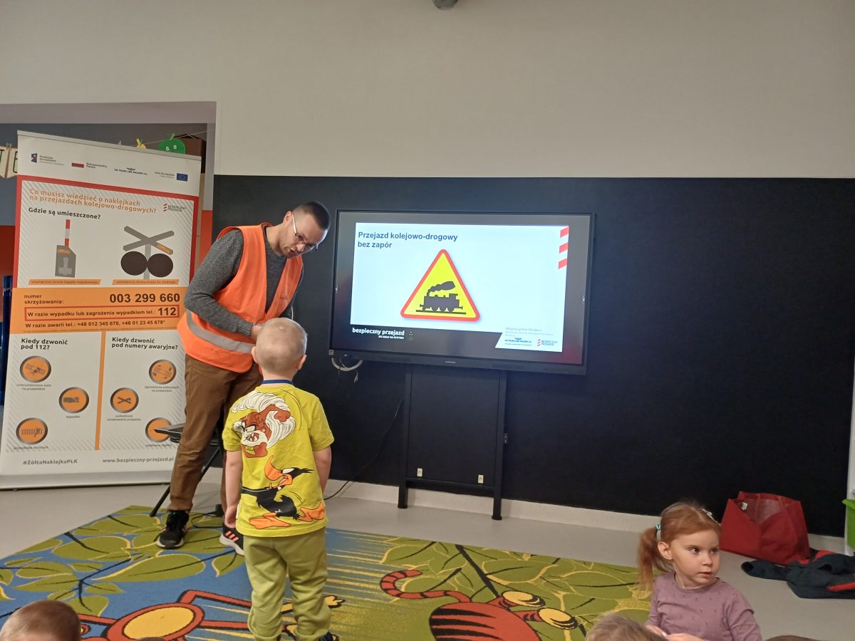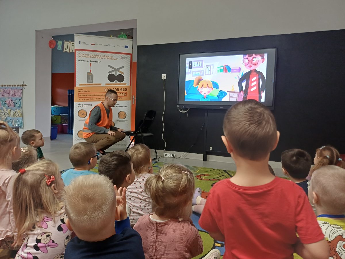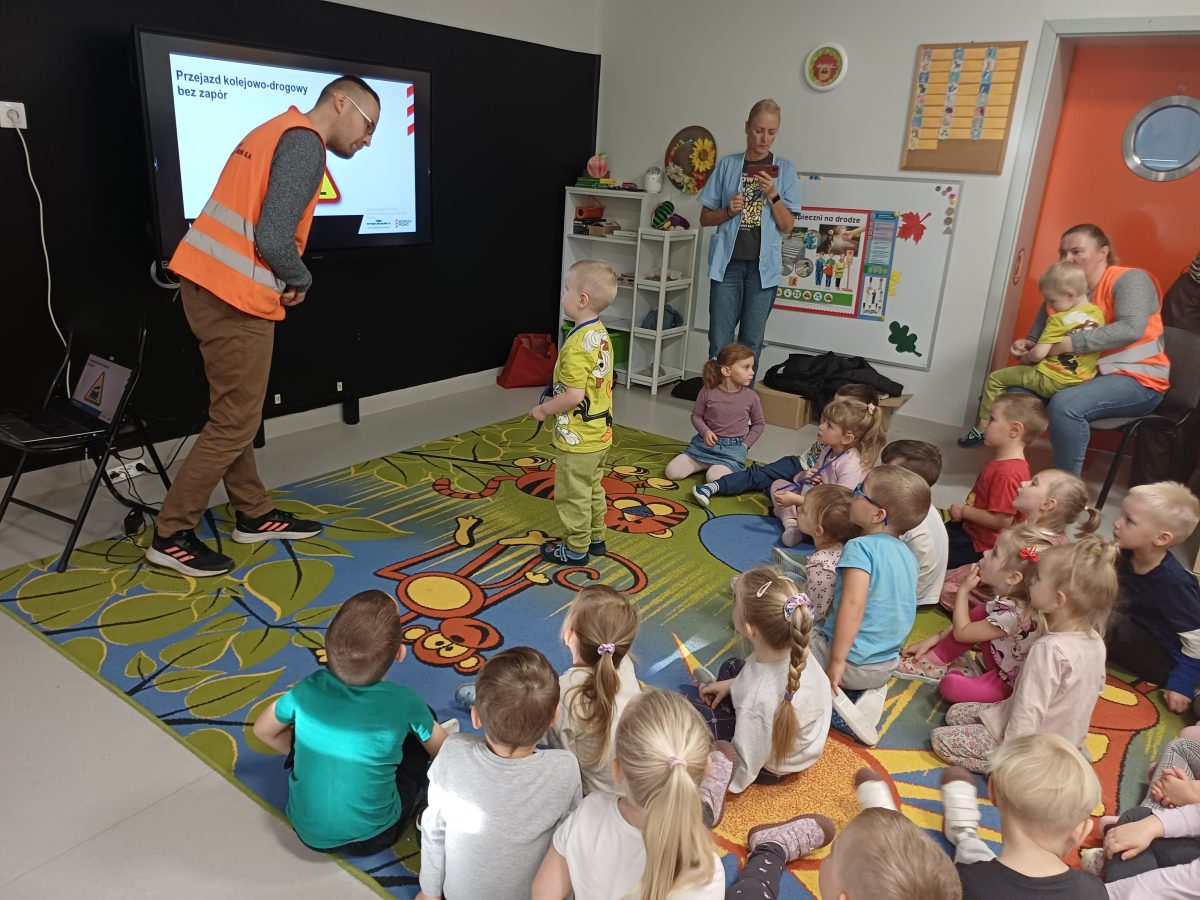 Podczas wizyty dzieci miały okazję poznać pracę kolejarza i dowiedzieć się, jak ważną rolę odgrywa kolej w codziennym życiu. Przedszkolaki z dużym zainteresowaniem słuchały opowieści o pociągach, dworcach i sygnałach kolejowych. Dzięki specjalnym materiałom edukacyjnym i filmikom dowiedziały się, jak bezpiecznie zachowywać się w pobliżu torów i przejazdów kolejowych. Dzieci mogły zadawać pytania, rozwiązywać zagadki o pociągach oraz bezpieczeństwie. Na zakończenie każdy przedszkolak otrzymał pamiątkowy odblask i kolorowankę z motywem kolejowym. Dziękujemy mamie oraz babci Oliwiera za organizację wydarzenia.