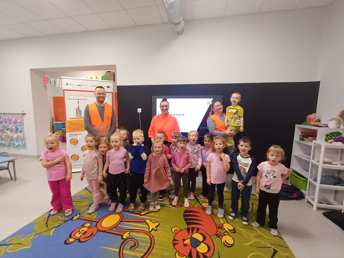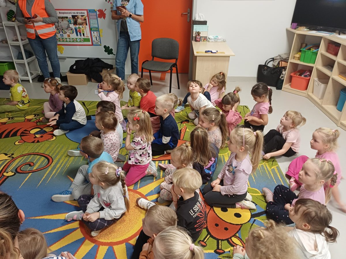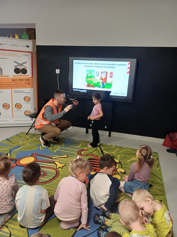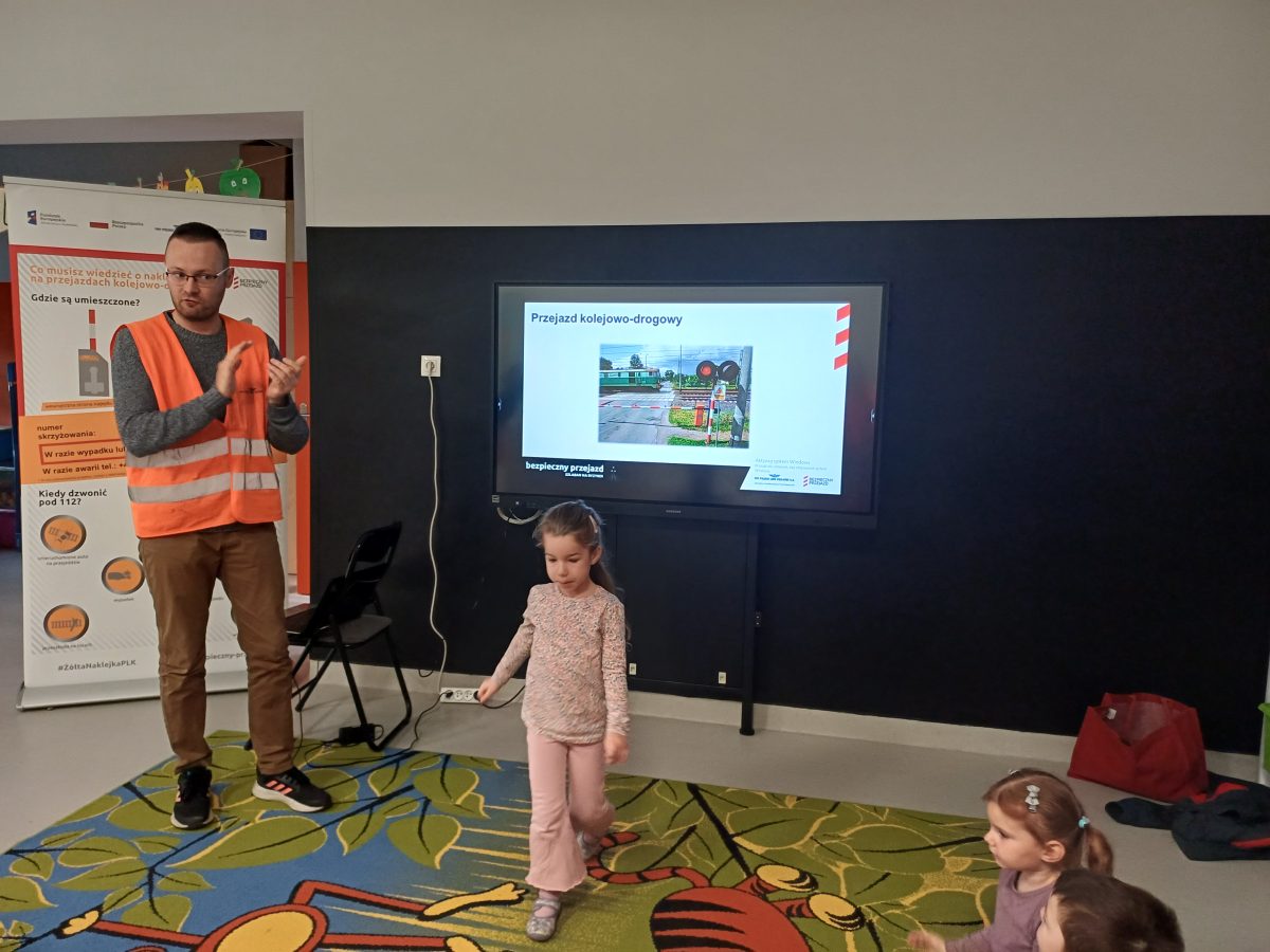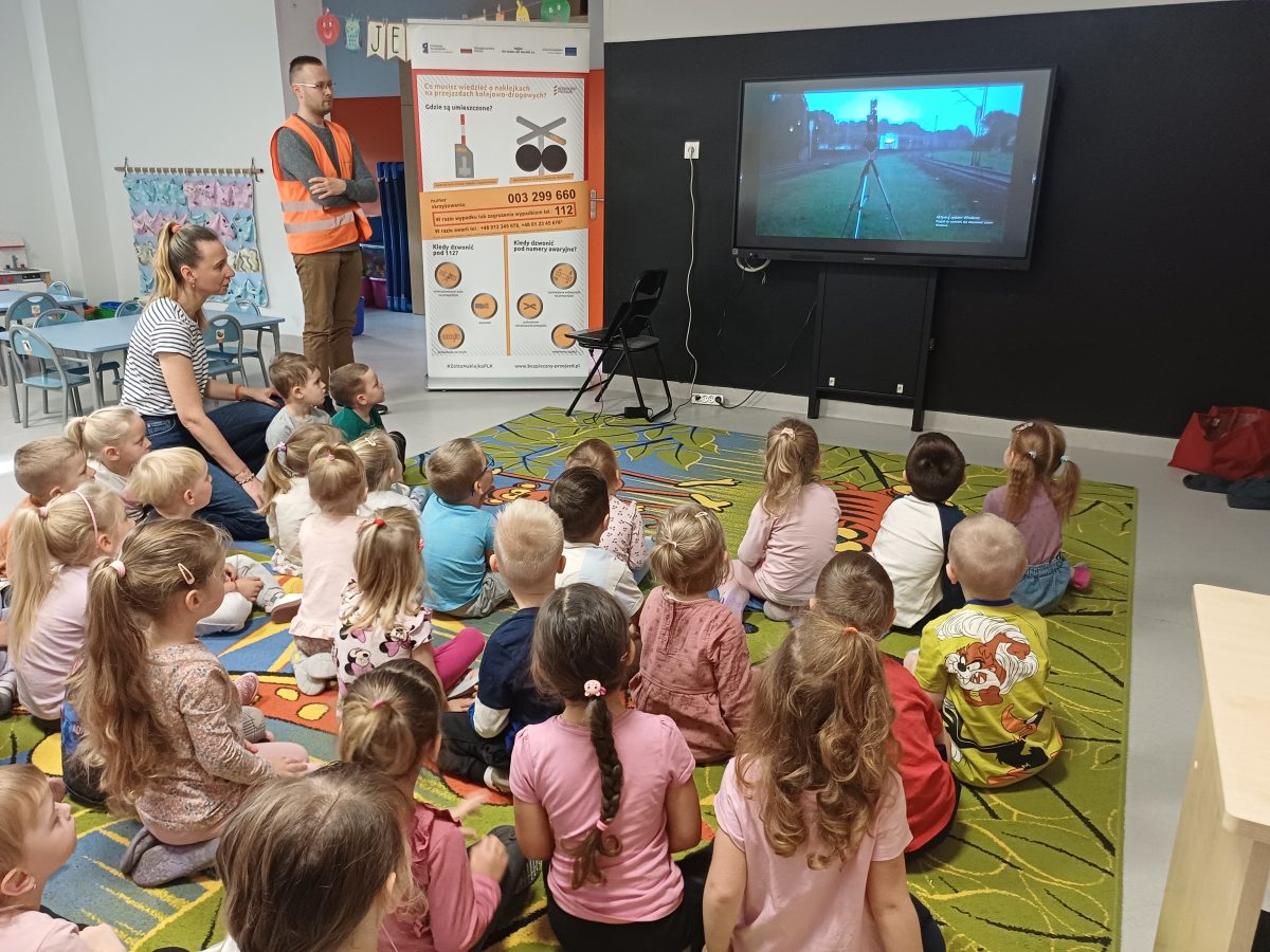 Podczas wizyty dzieci miały okazję poznać pracę kolejarza i dowiedzieć się, jak ważną rolę odgrywa kolej w codziennym życiu. Przedszkolaki z dużym zainteresowaniem słuchały opowieści o pociągach, dworcach i sygnałach kolejowych. Dzięki specjalnym materiałom edukacyjnym i filmikom dowiedziały się, jak bezpiecznie zachowywać się w pobliżu torów i przejazdów kolejowych. Dzieci mogły zadawać pytania, rozwiązywać zagadki o pociągach oraz bezpieczeństwie. Na zakończenie każdy przedszkolak otrzymał pamiątkowy odblask i kolorowankę z motywem kolejowym. Dziękujemy mamie oraz babci Oliwiera za organizację wydarzenia.