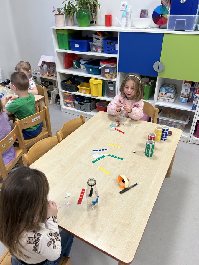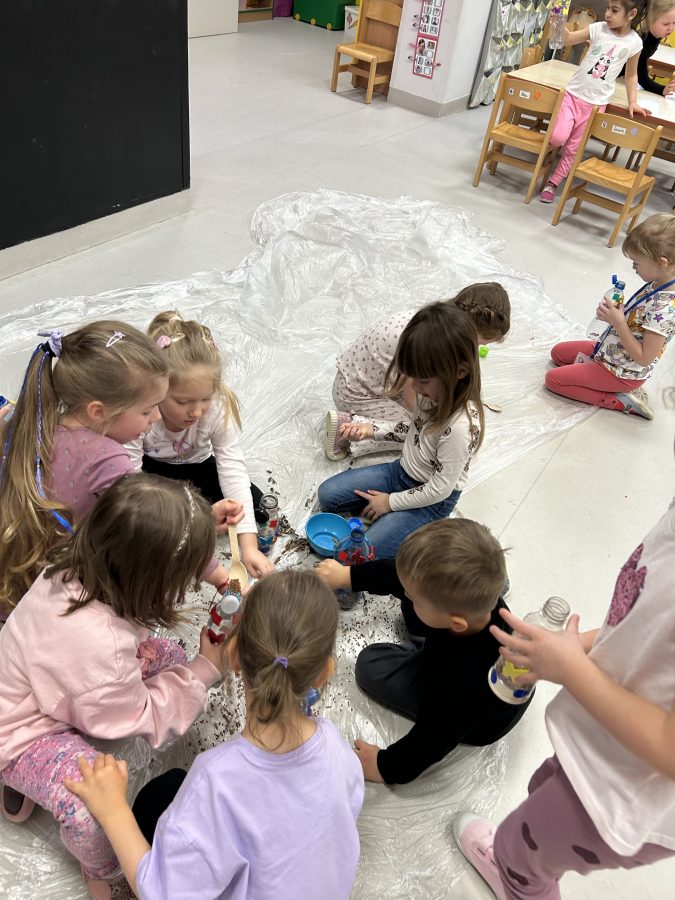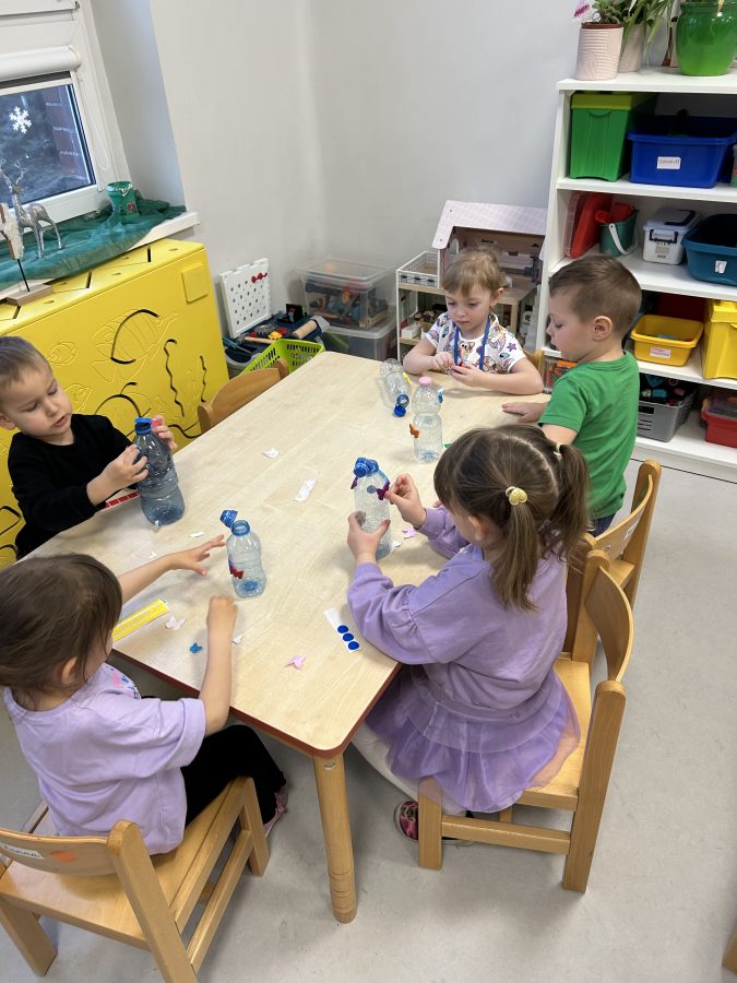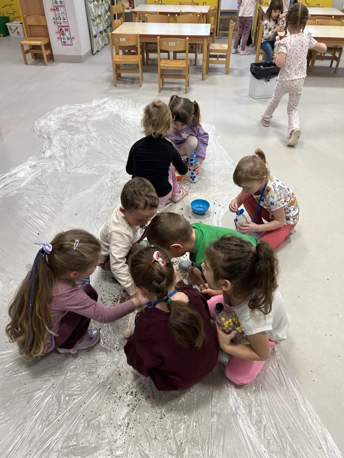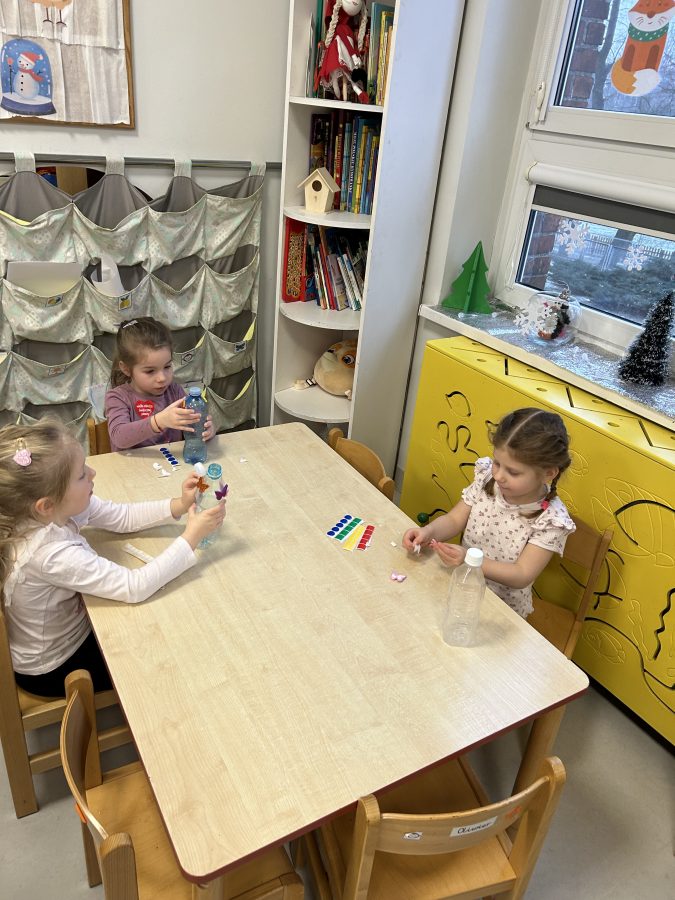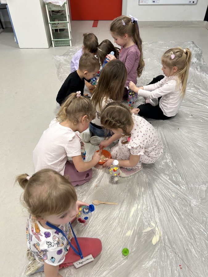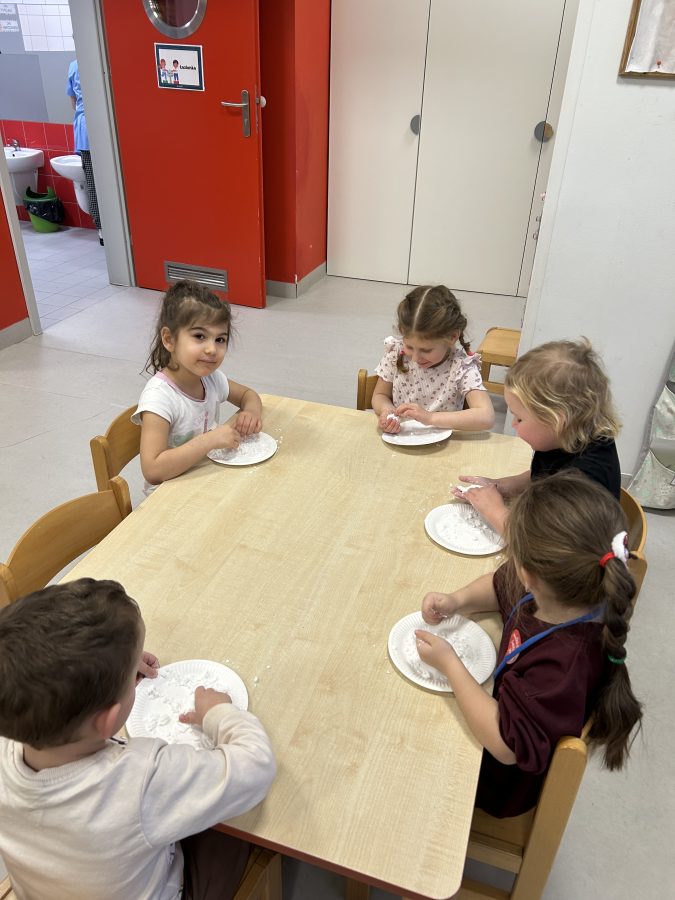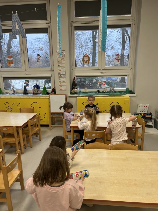 Czerwone Plastusie uczestniczyły w zimowych zajęciach sensorycznych, podczas których rozwijały zmysł słuchu. Dzieci wsłuchiwały się w dźwięki zimy, naśladowały je ruchem i głosem oraz tworzyły własną „zimową orkiestrę”. Zajęcia przyniosły wiele radości i wspierały rozwój koncentracji oraz uwagi słuchowej. 🎶❄️