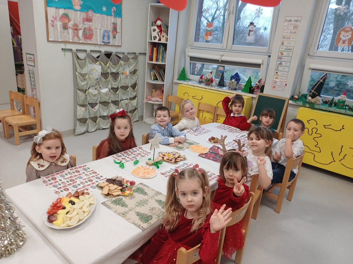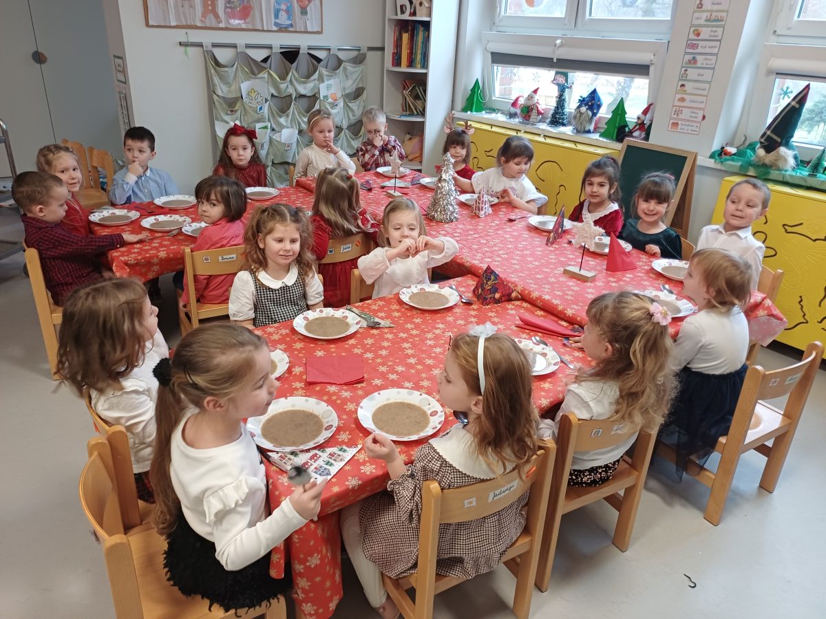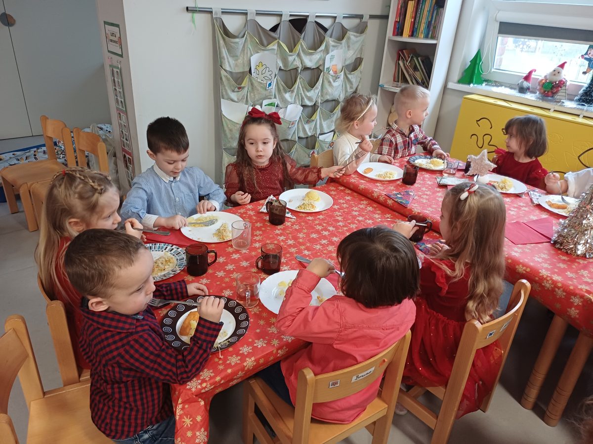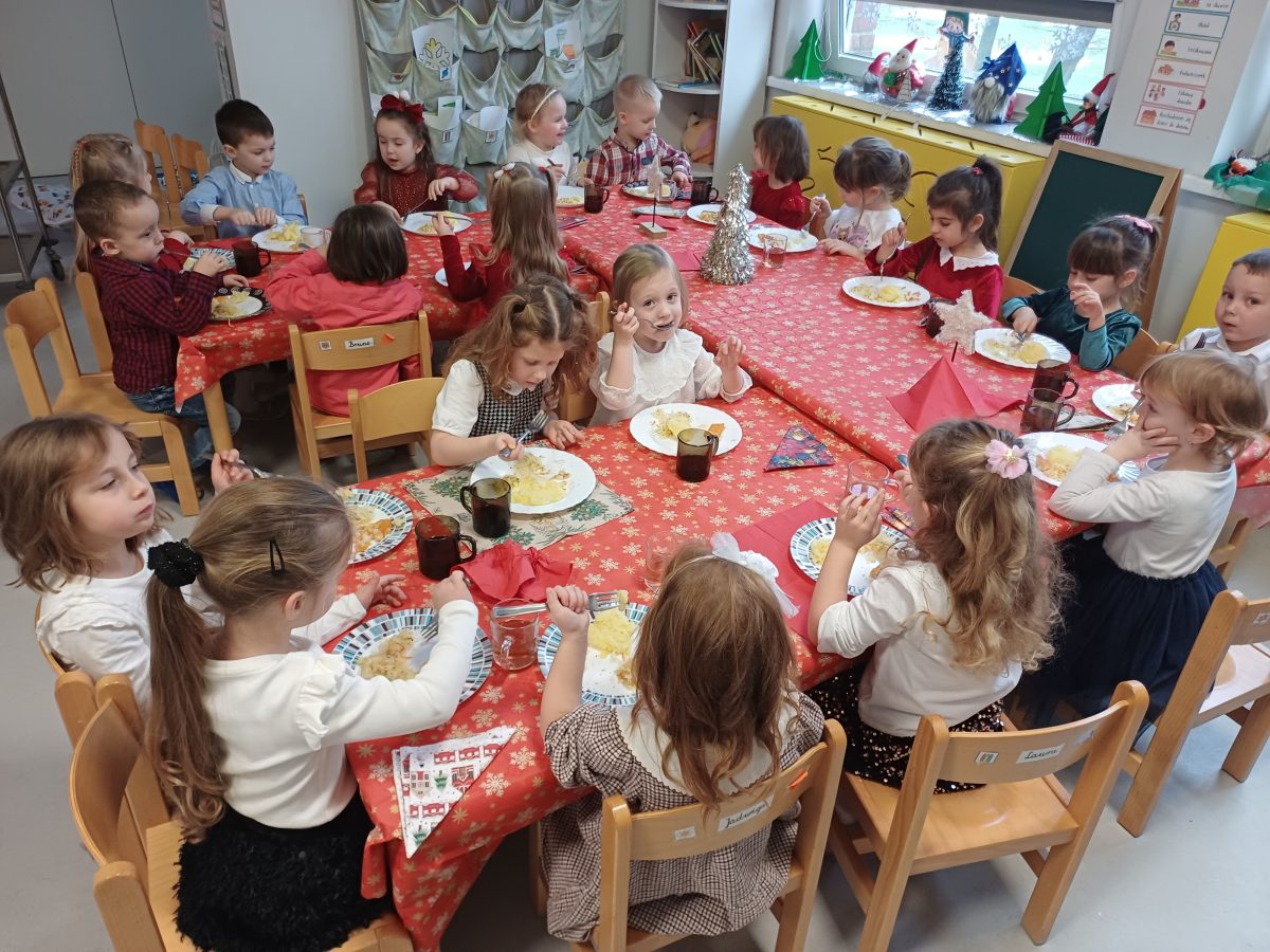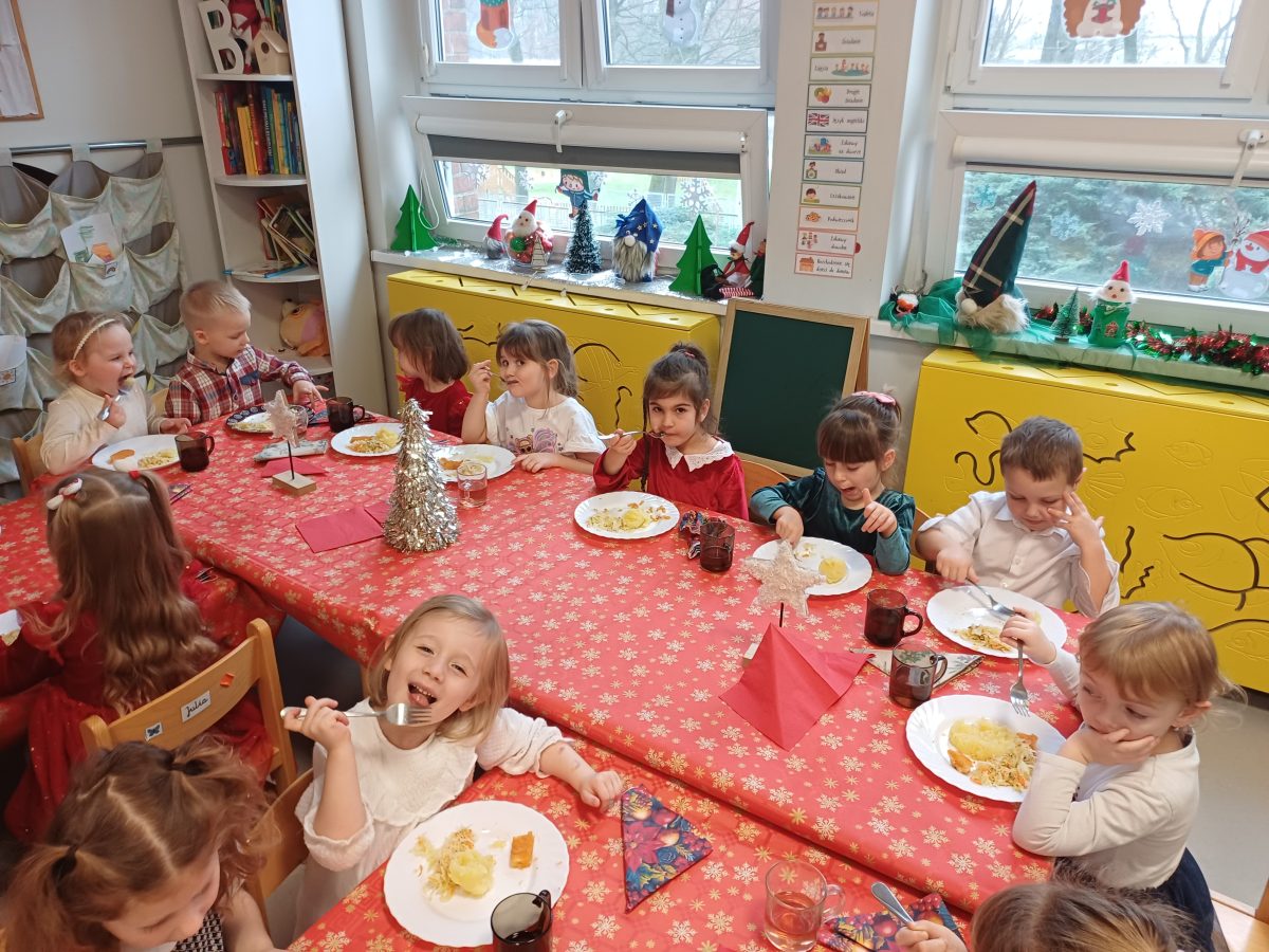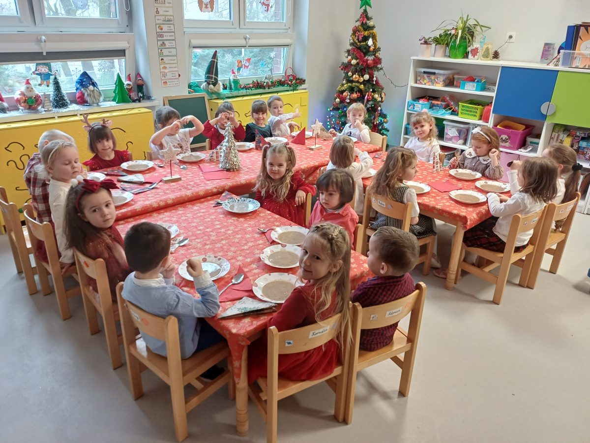 Nasze przedszkolaki zanim rozpoczęły święta w rodzinnym gronie to zasiadły do uroczystej Wigilii w przedszkolu. Najpierw odbyło się wspólne kolędowanie, później obiad – zupa grzybowa i rybka. Dzieci podzieliły się opłatkiem, ucząc się przy tym składać życzenia.