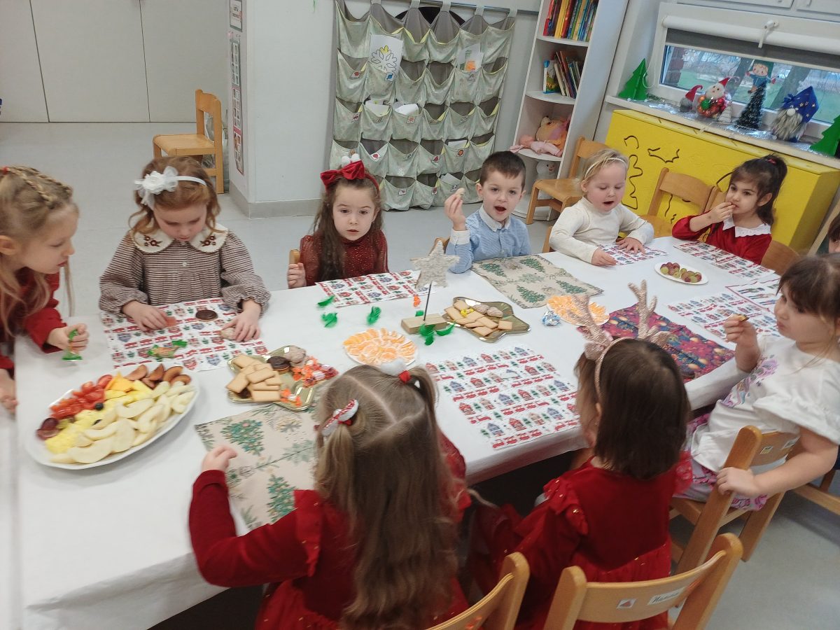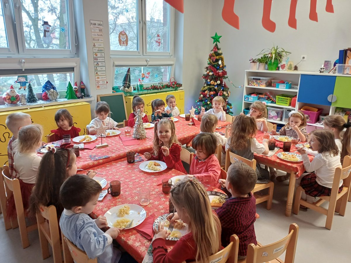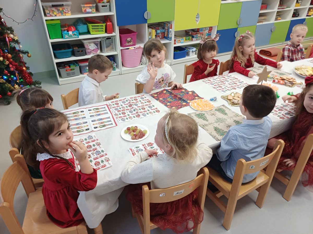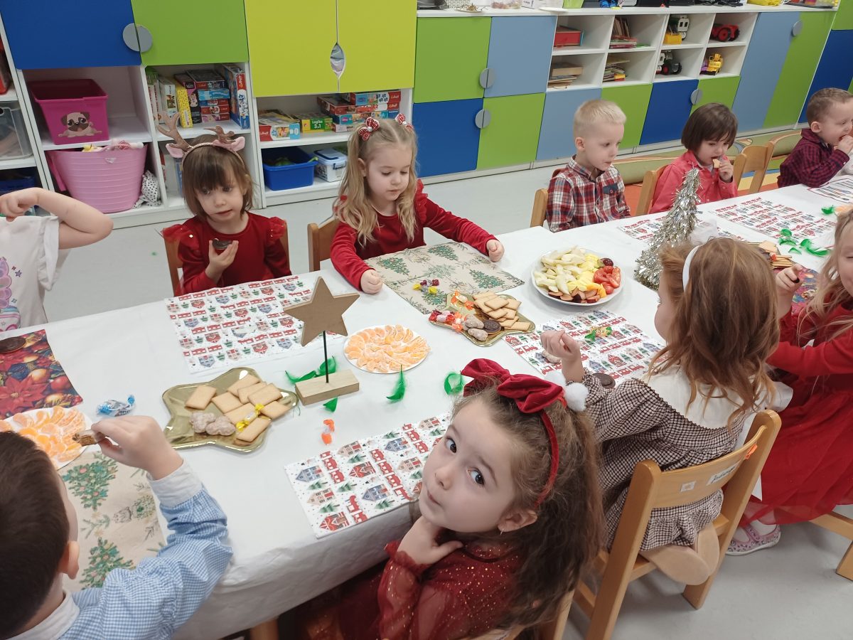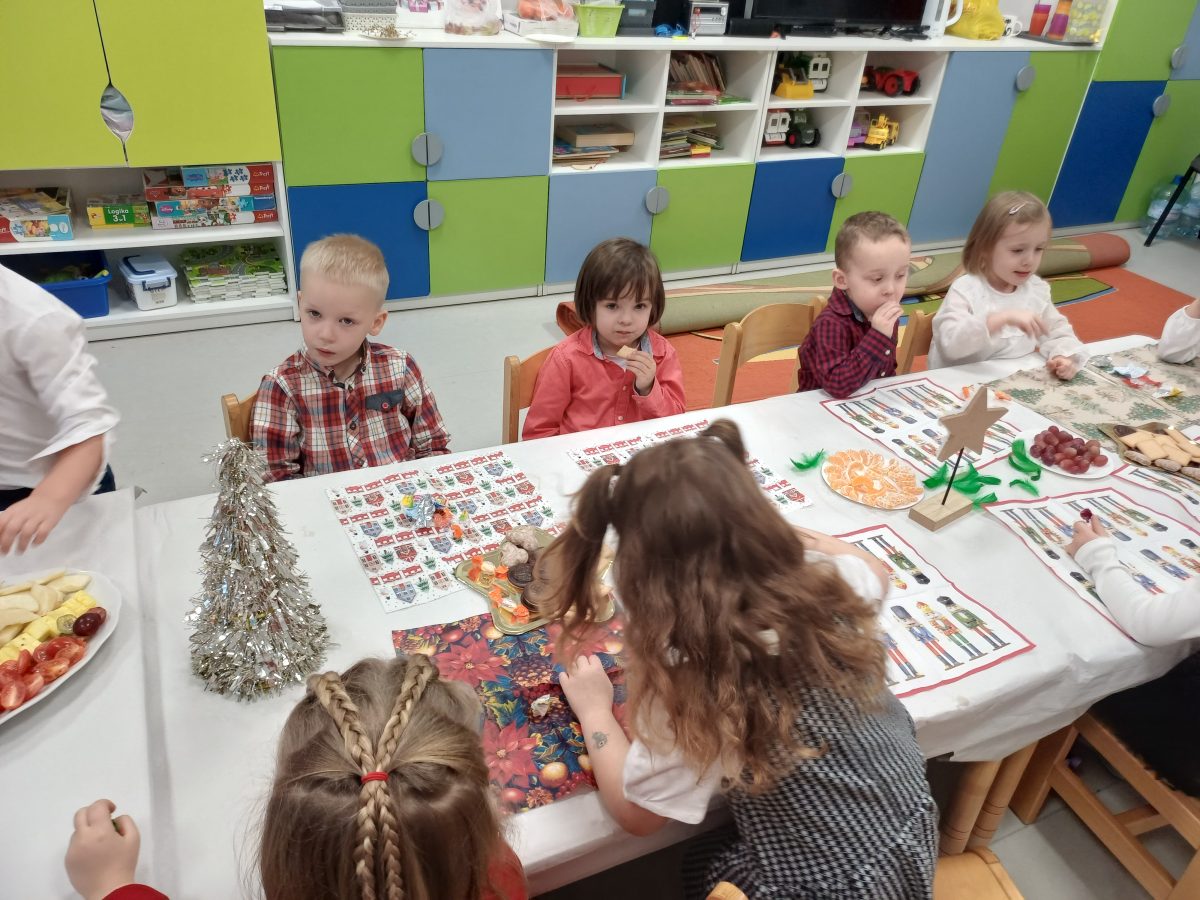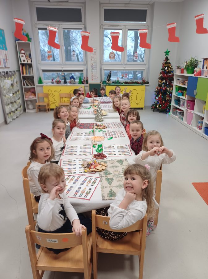 Nasze przedszkolaki zanim rozpoczęły święta w rodzinnym gronie to zasiadły do uroczystej Wigilii w przedszkolu. Najpierw odbyło się wspólne kolędowanie, później obiad – zupa grzybowa i rybka. Dzieci podzieliły się opłatkiem, ucząc się przy tym składać życzenia.