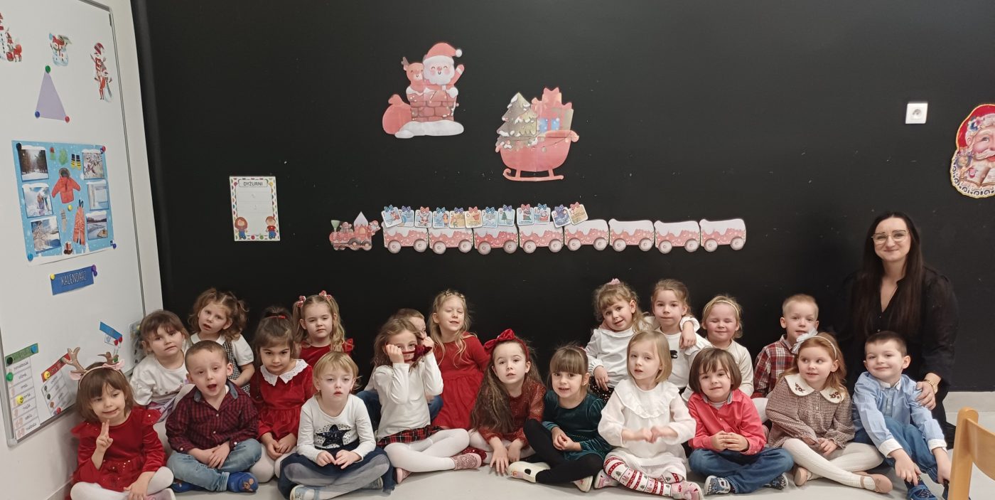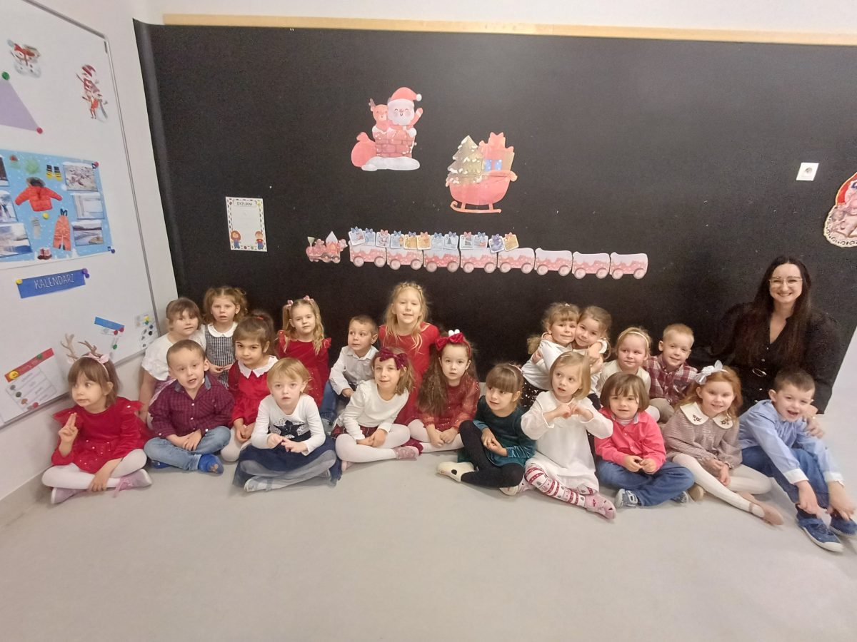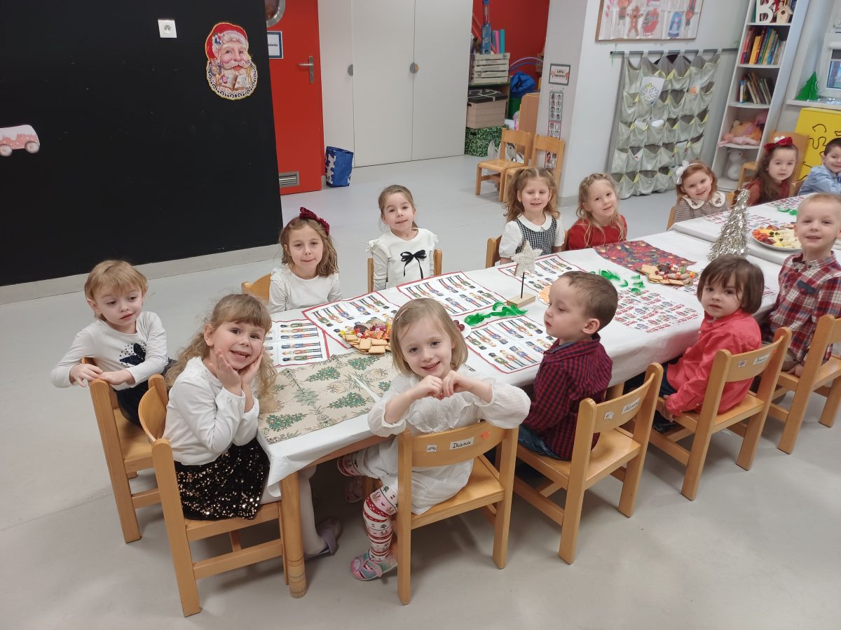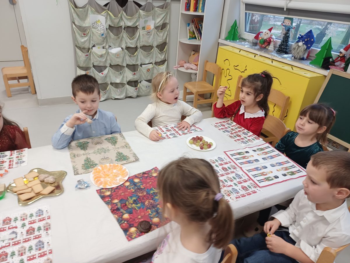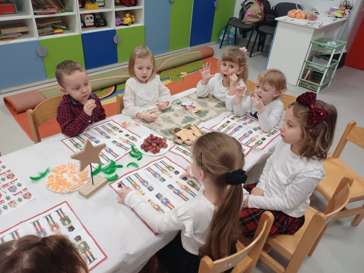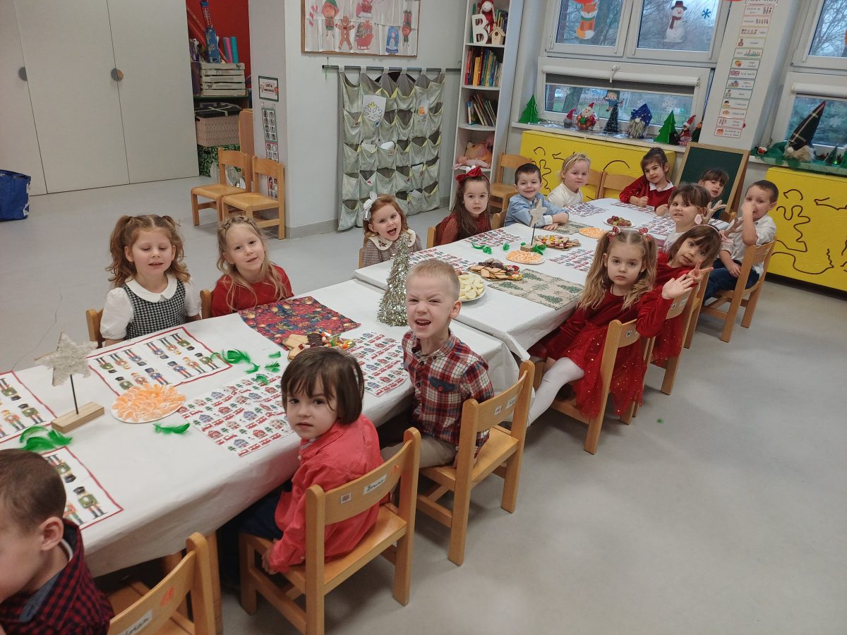 Nasze przedszkolaki zanim rozpoczęły święta w rodzinnym gronie to zasiadły do uroczystej Wigilii w przedszkolu. Najpierw odbyło się wspólne kolędowanie, później obiad – zupa grzybowa i rybka. Dzieci podzieliły się opłatkiem, ucząc się przy tym składać życzenia.