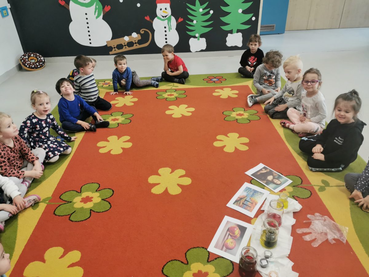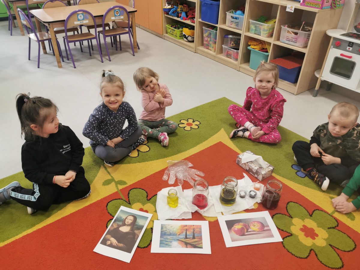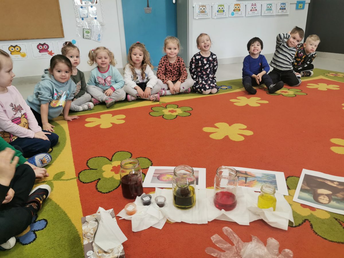 Dziś dzieci z grupy Morskie Plastusie uczestniczyły w zajęciach badawczych, które dotyczyły  kolorów podstawowych i pochodnych a także sposobów ich uzyskiwania.