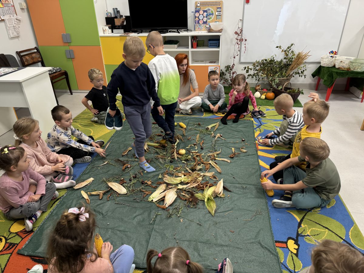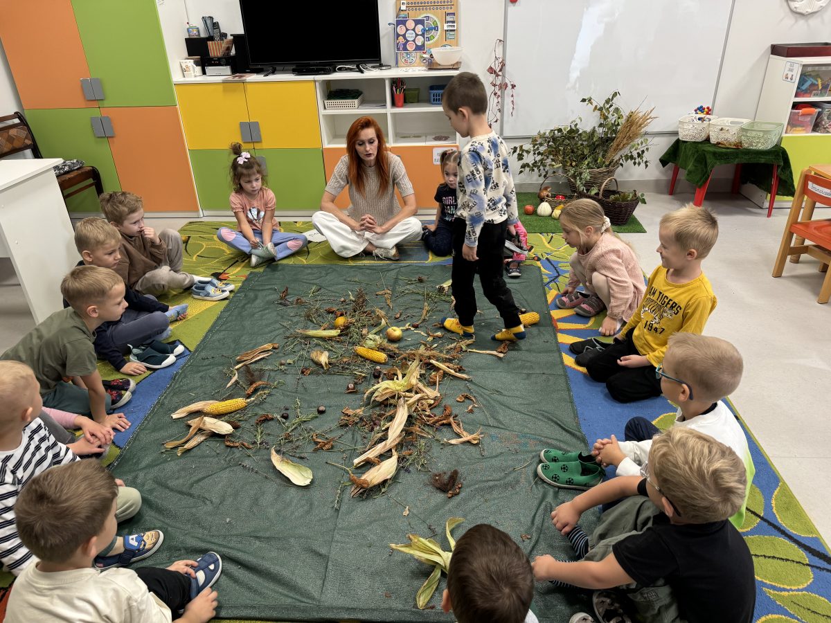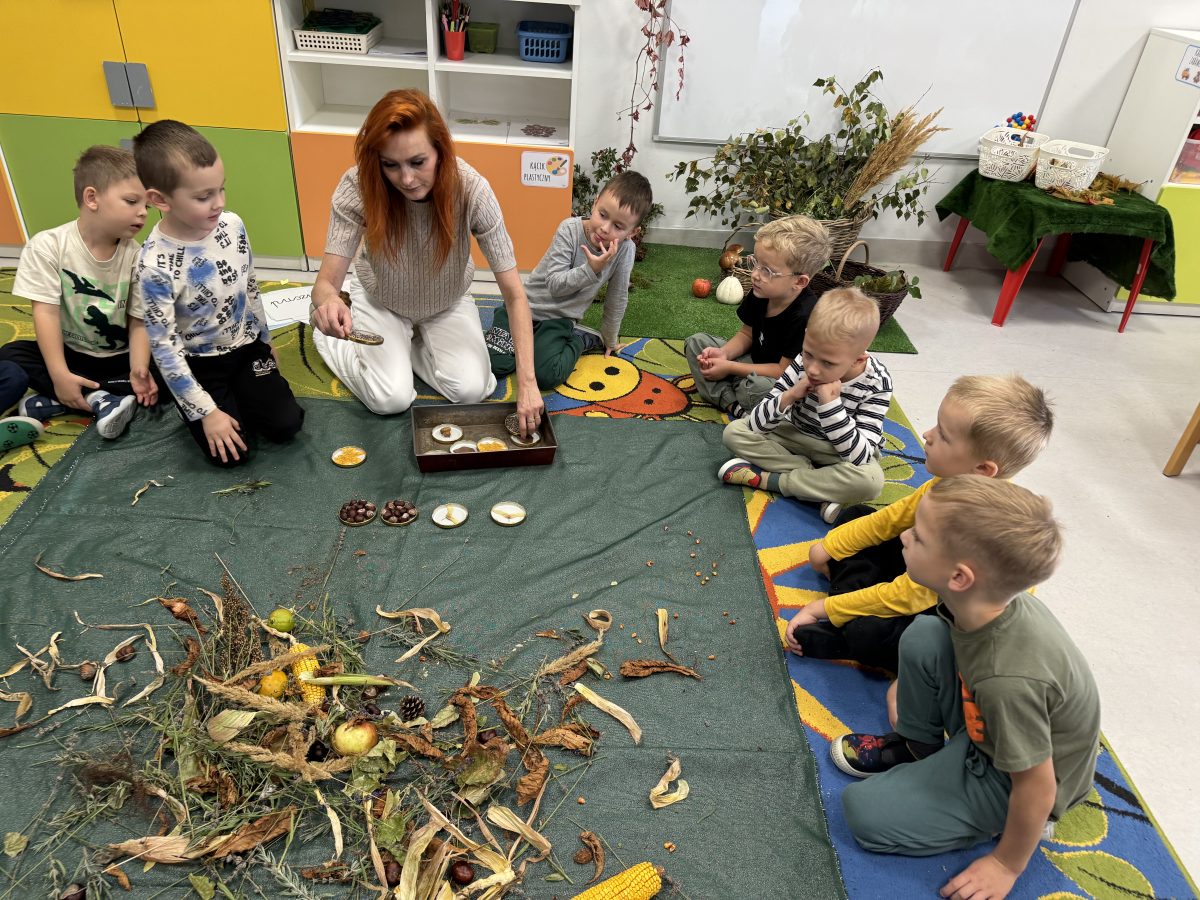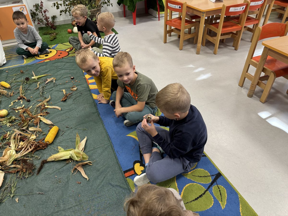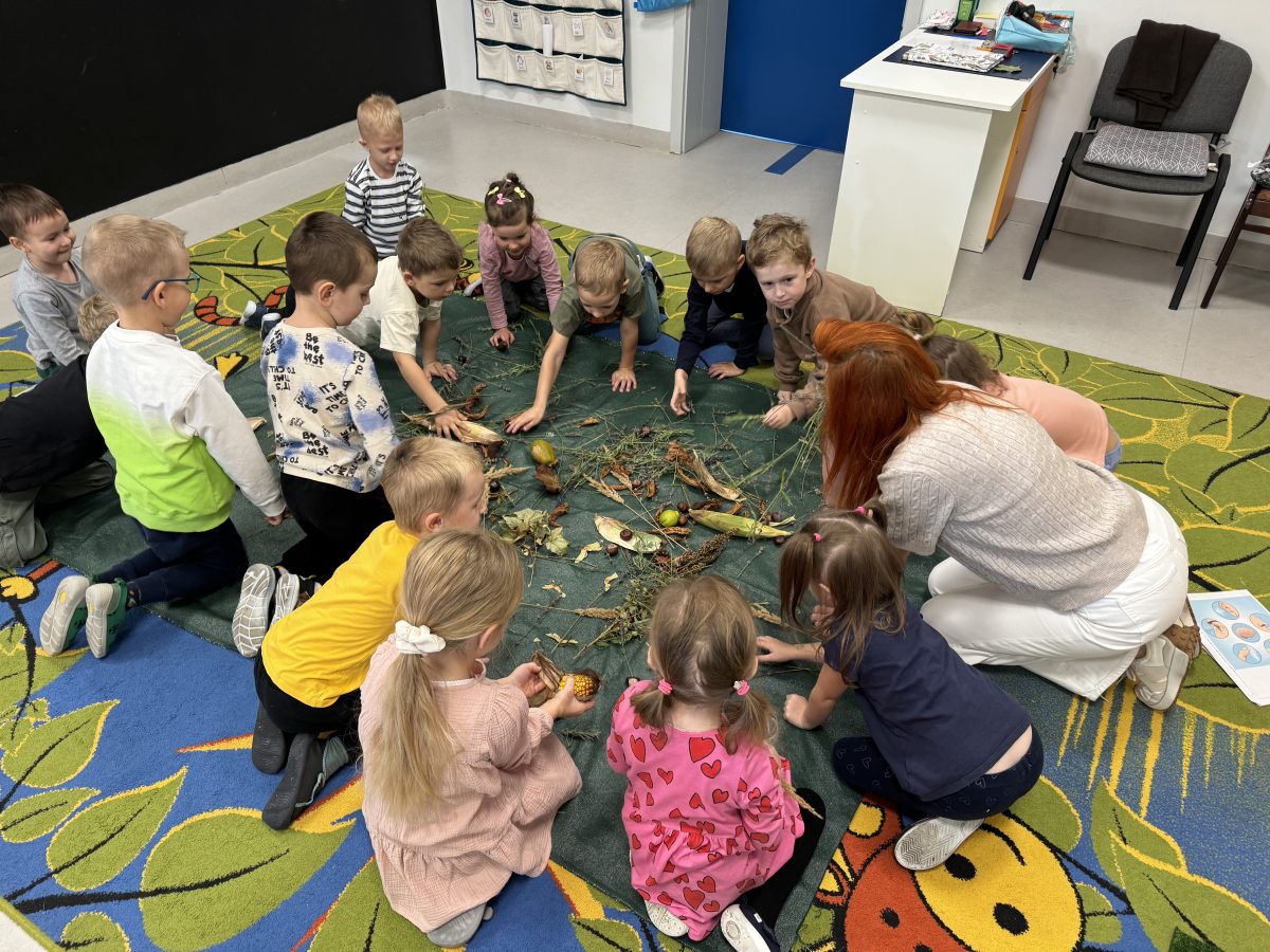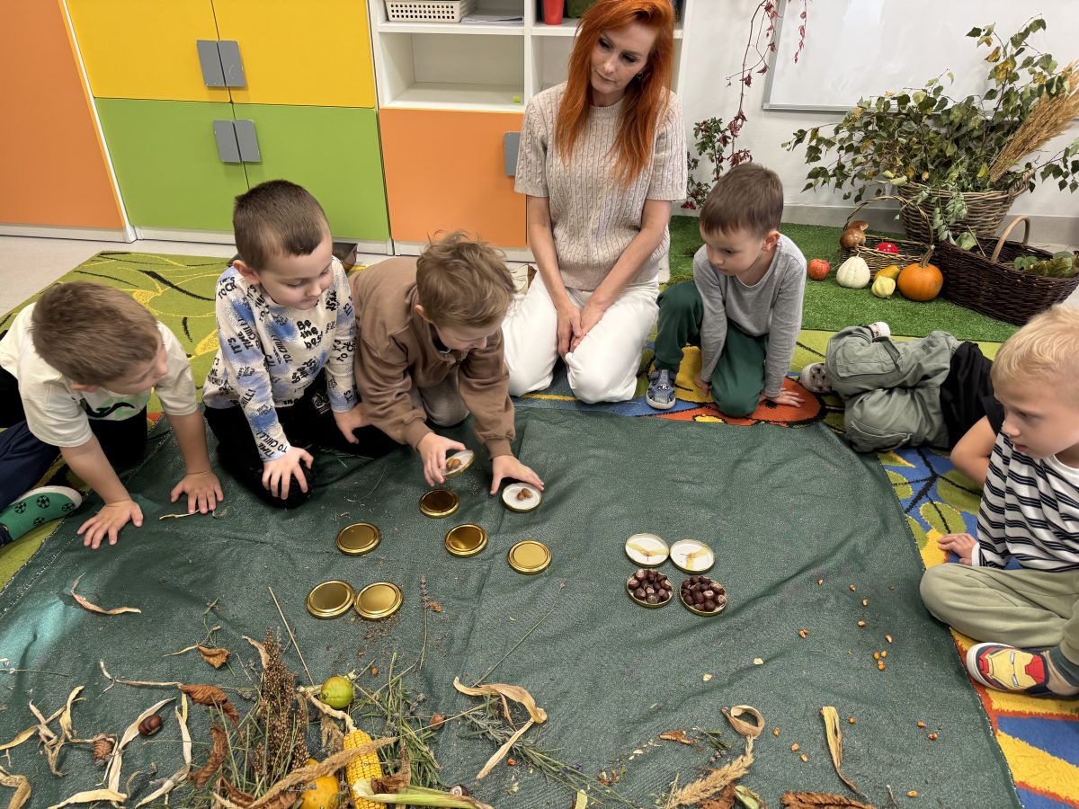Dzisiaj na zajęciach gościliśmy Panią Dyrektor i Panią Małgosię, dzieci na zajęciach używając swoich zmysłów mogły bliżej poznać to czego nam dostarcza jesień.
