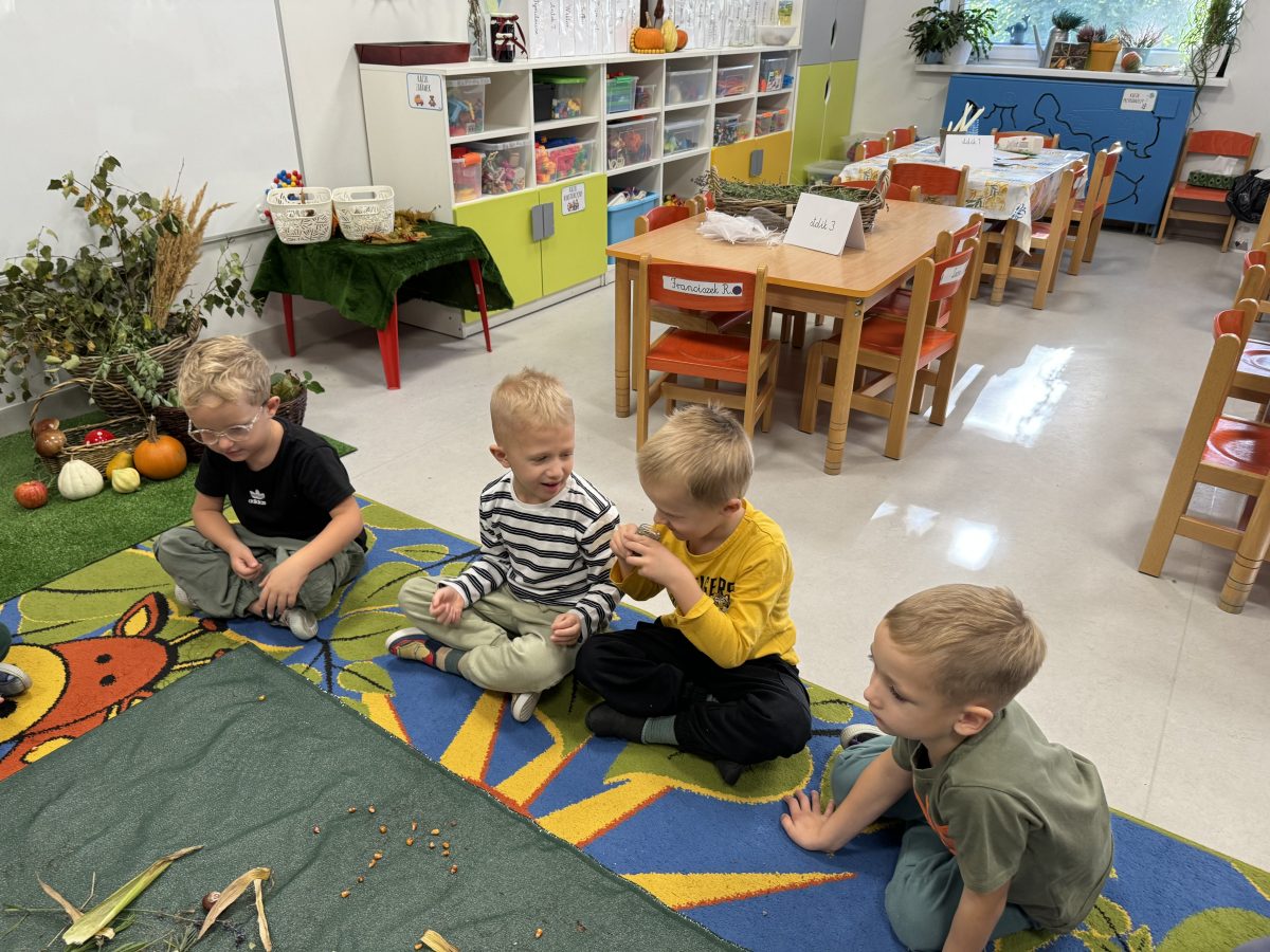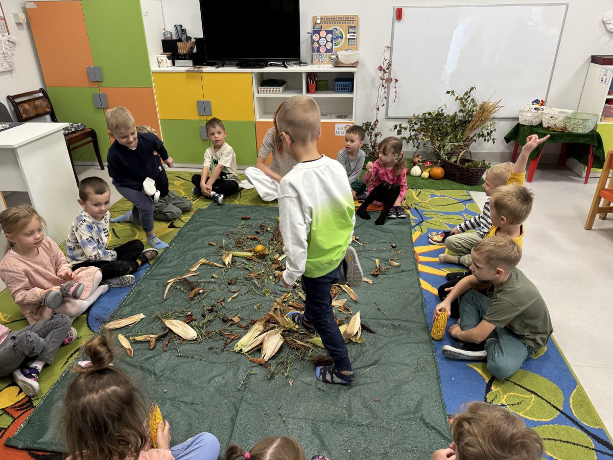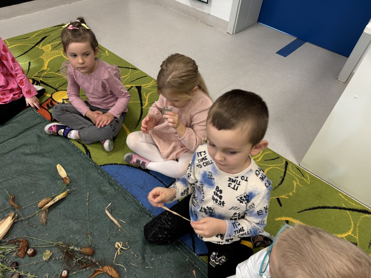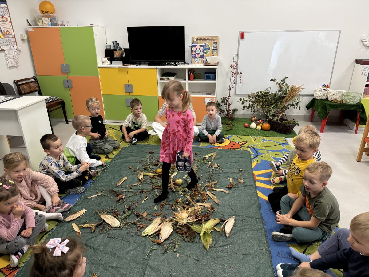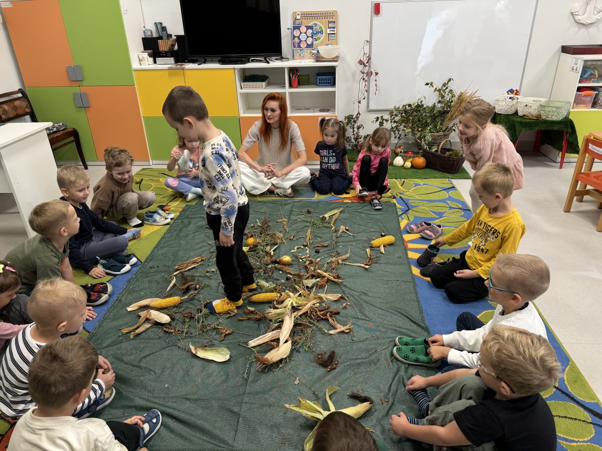 Dzisiaj na zajęciach gościliśmy Panią Dyrektor i Panią Małgosię, dzieci na zajęciach używając swoich zmysłów mogły bliżej poznać to czego nam dostarcza jesień.