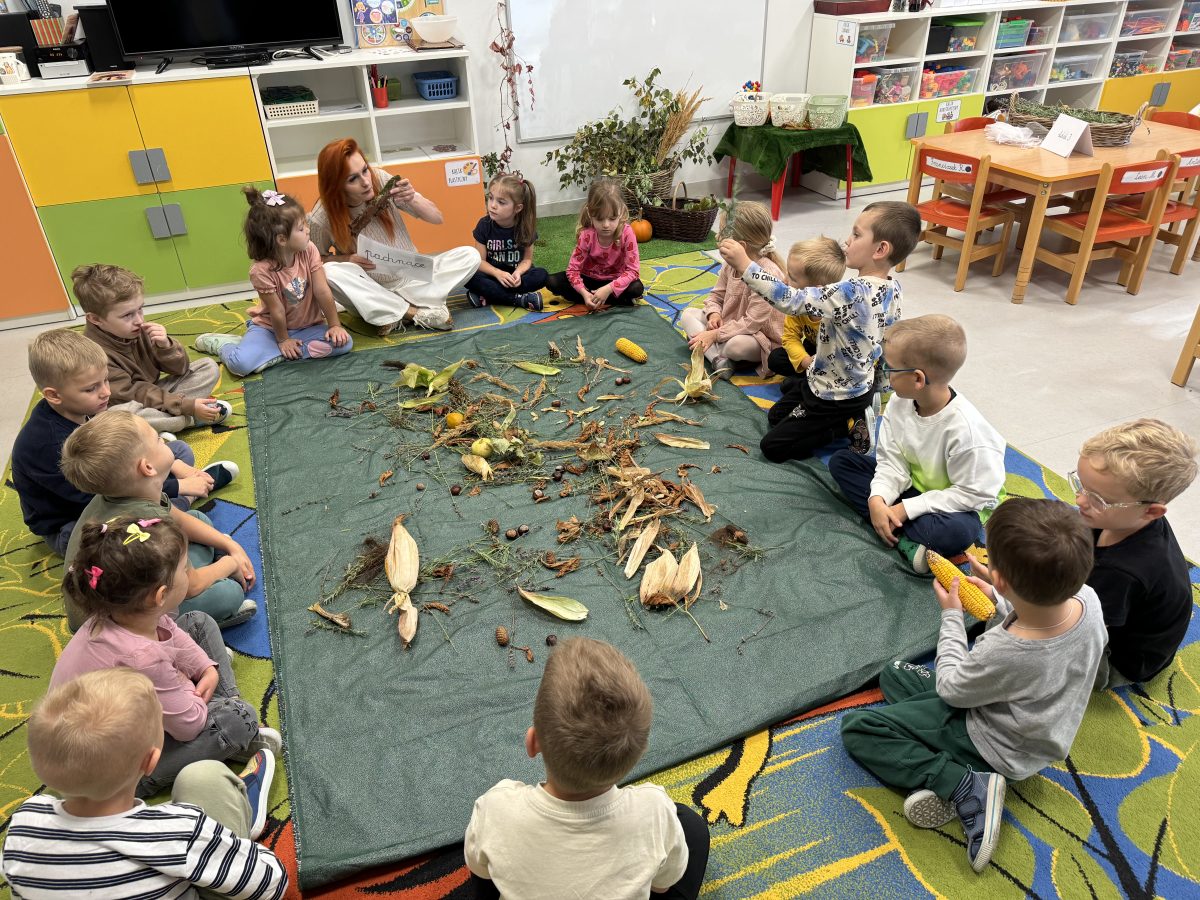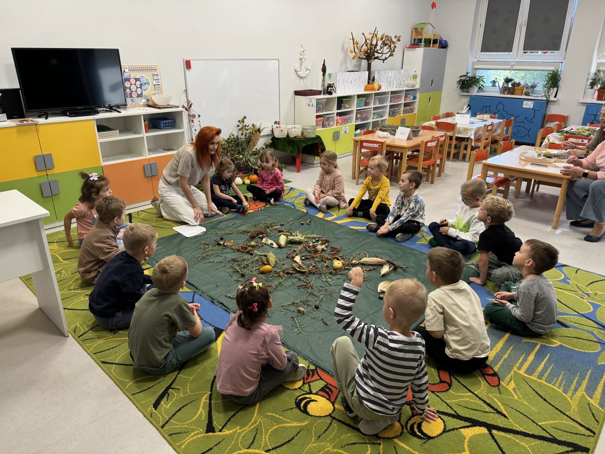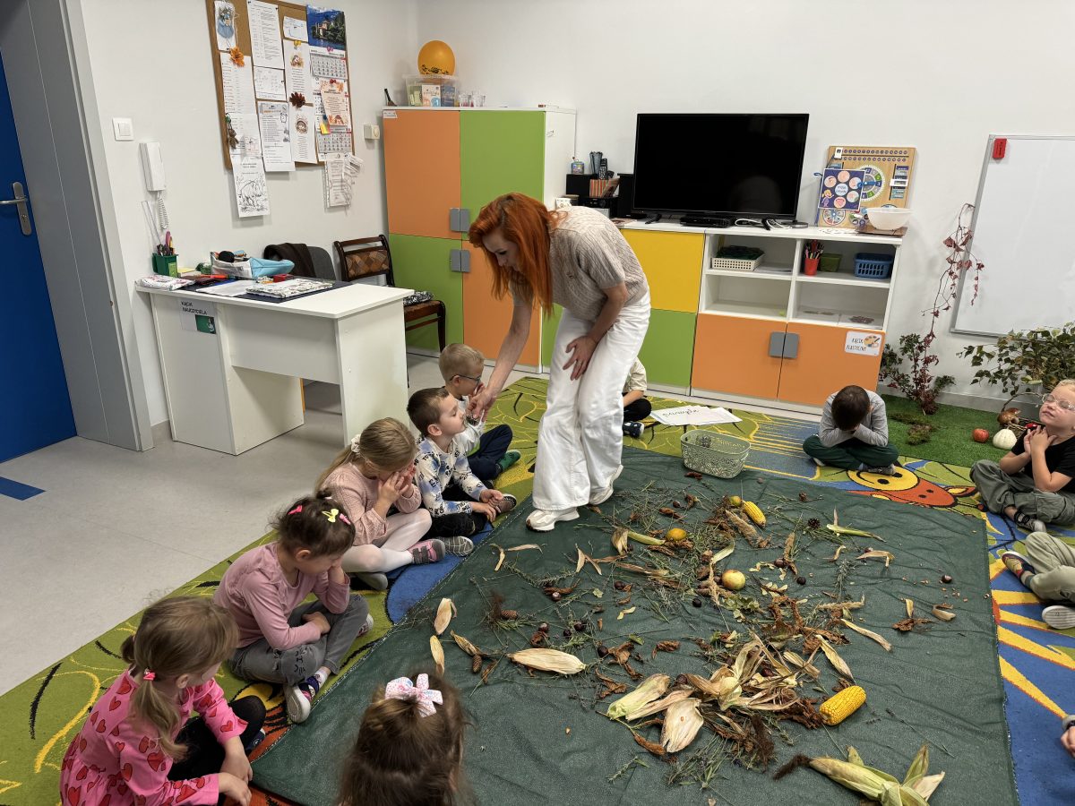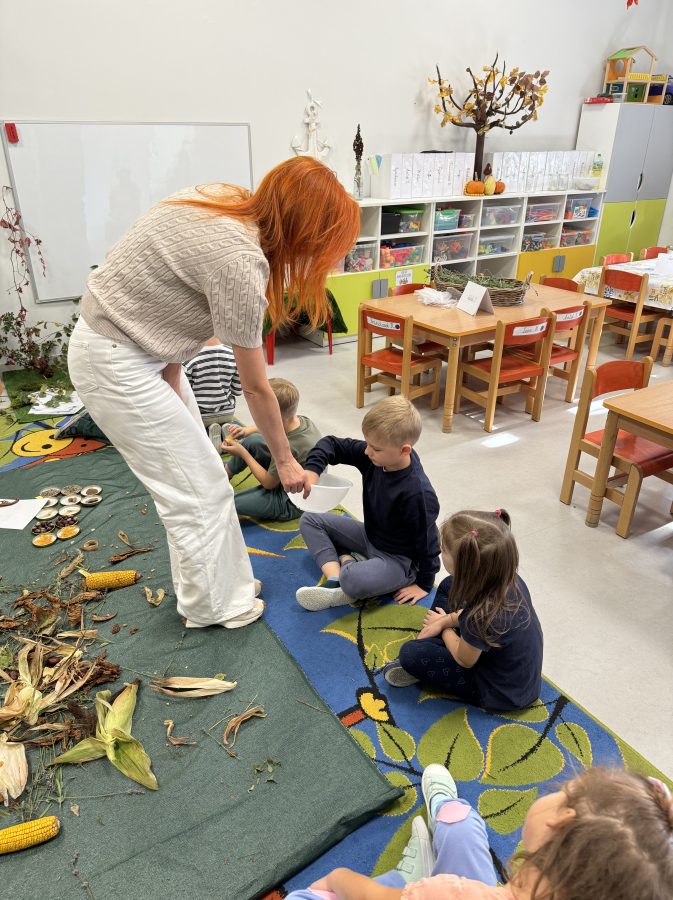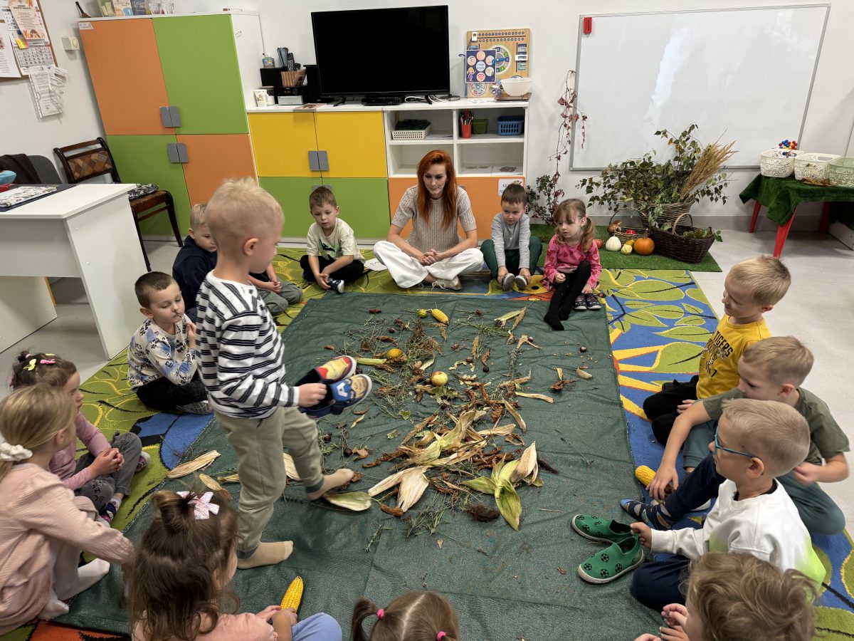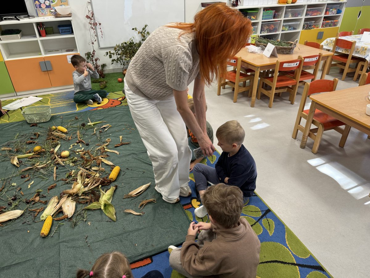 Dzisiaj na zajęciach gościliśmy Panią Dyrektor i Panią Małgosię, dzieci na zajęciach używając swoich zmysłów mogły bliżej poznać to czego nam dostarcza jesień.