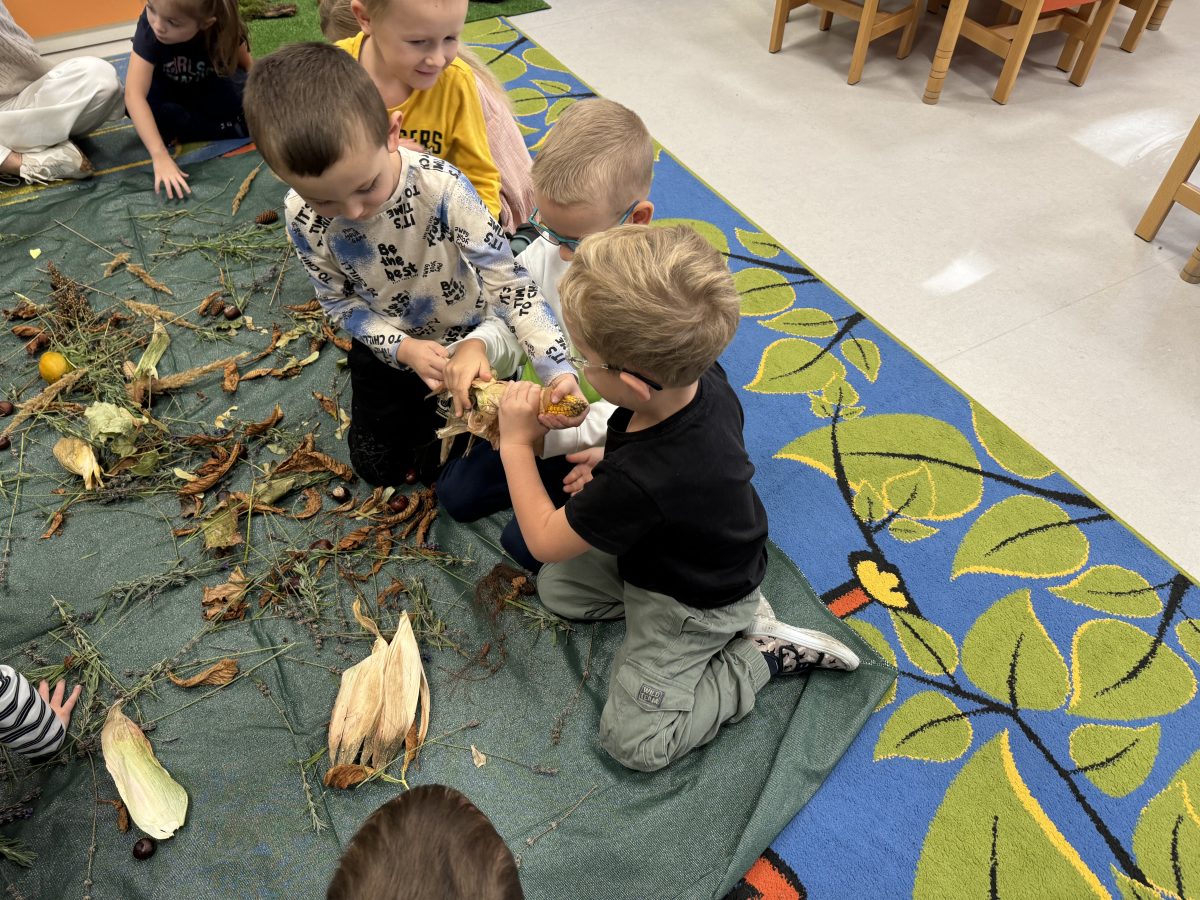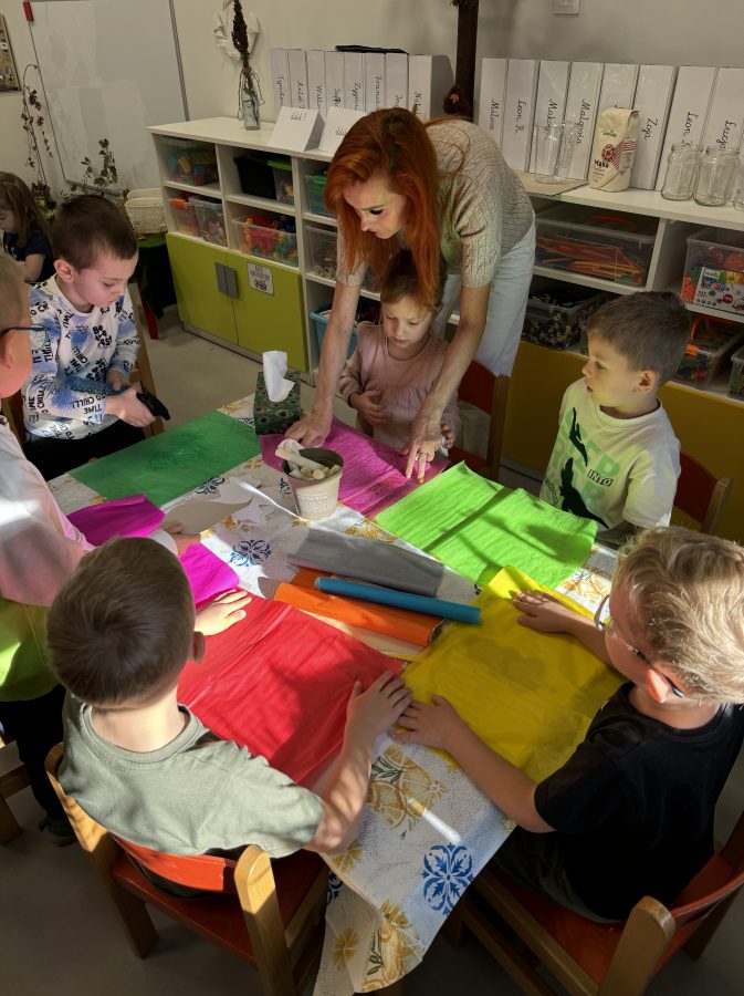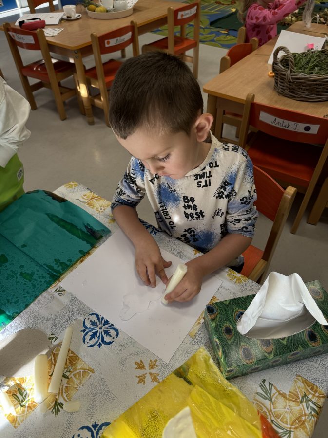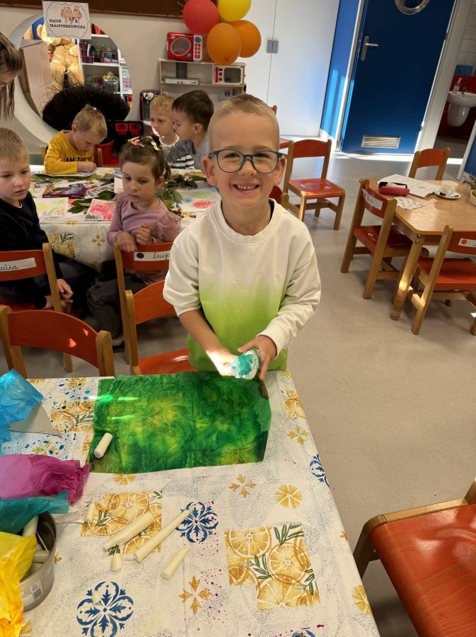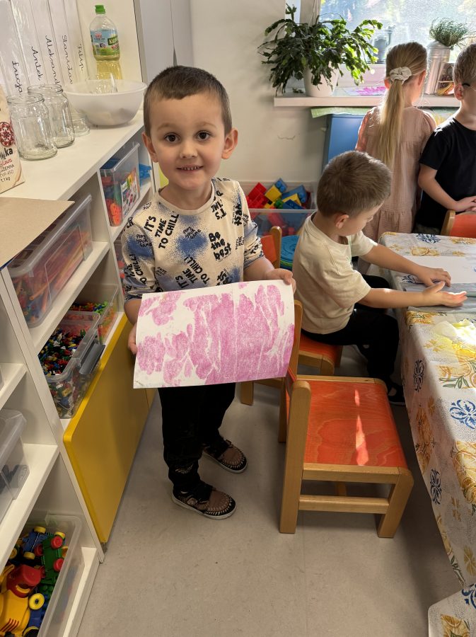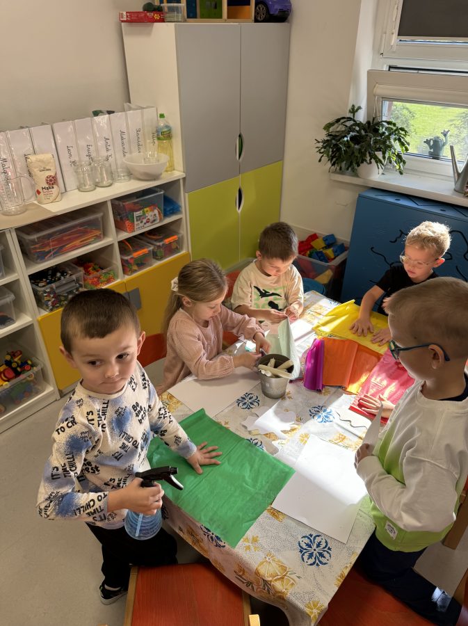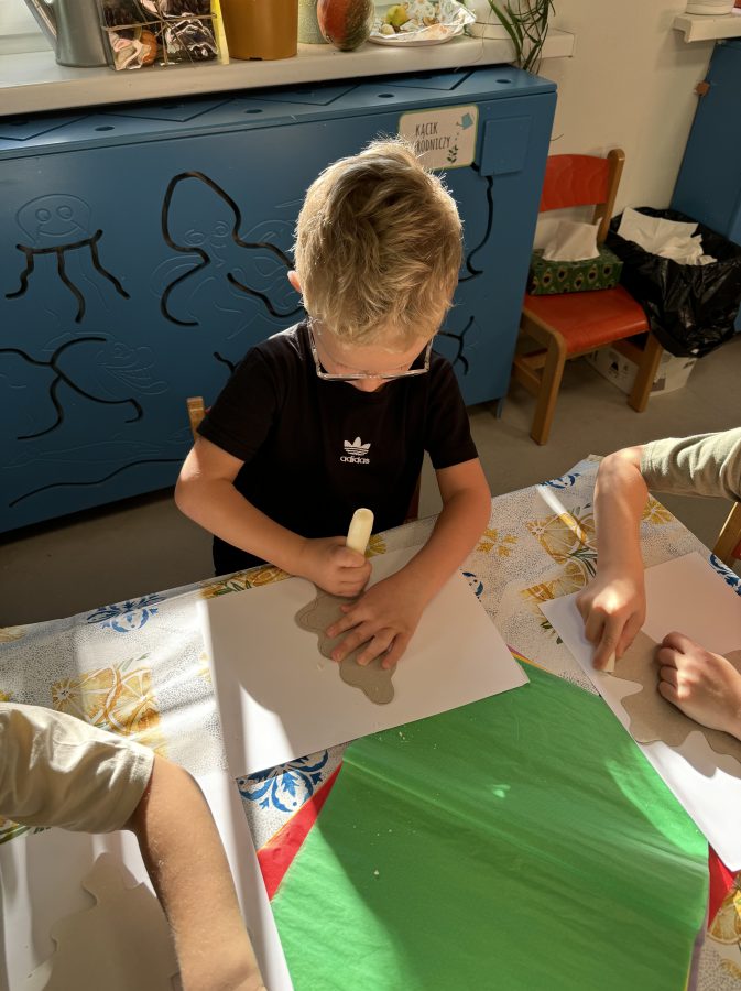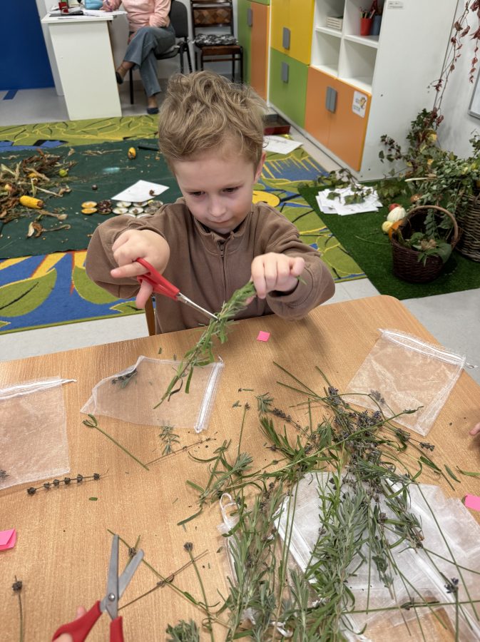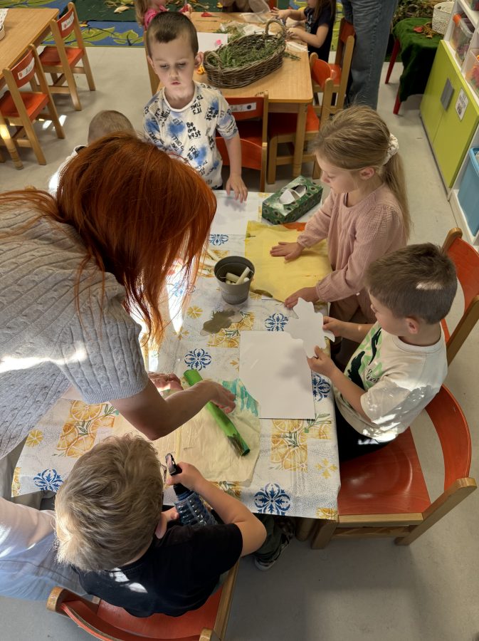 Dzisiaj na zajęciach gościliśmy Panią Dyrektor i Panią Małgosię, dzieci na zajęciach używając swoich zmysłów mogły bliżej poznać to czego nam dostarcza jesień.