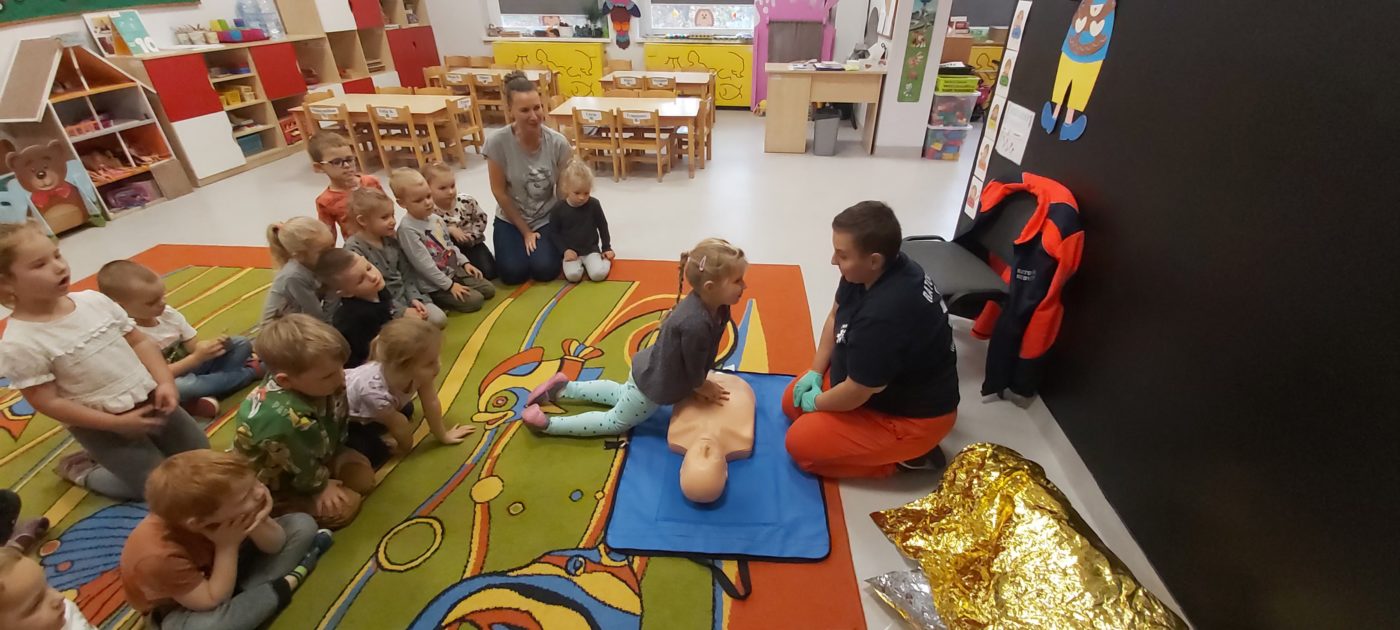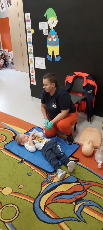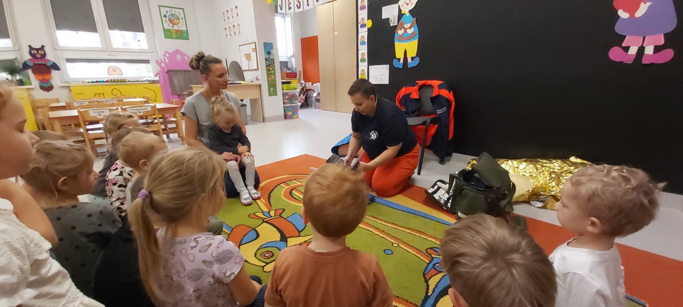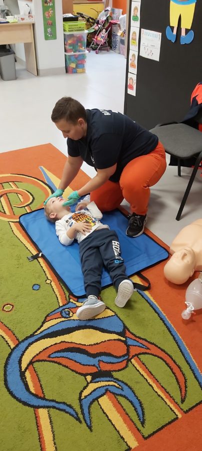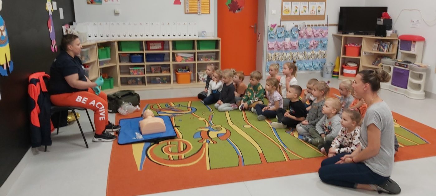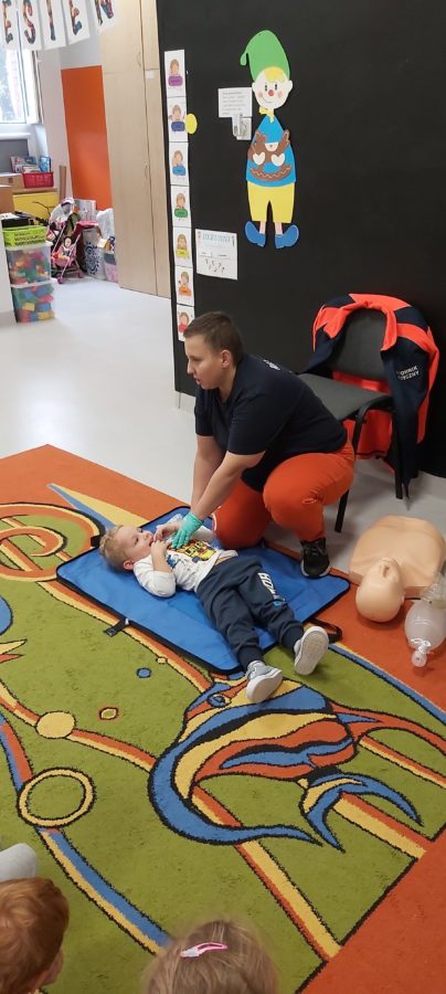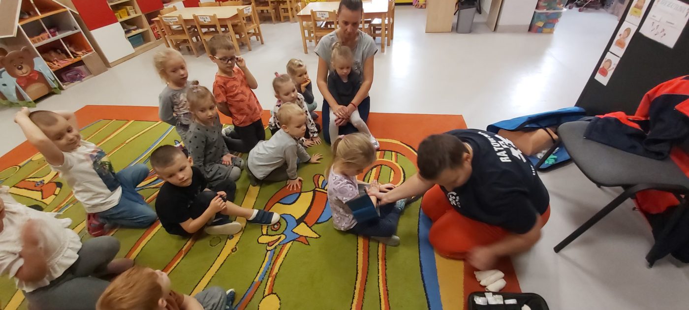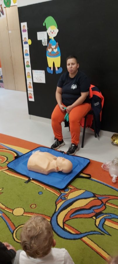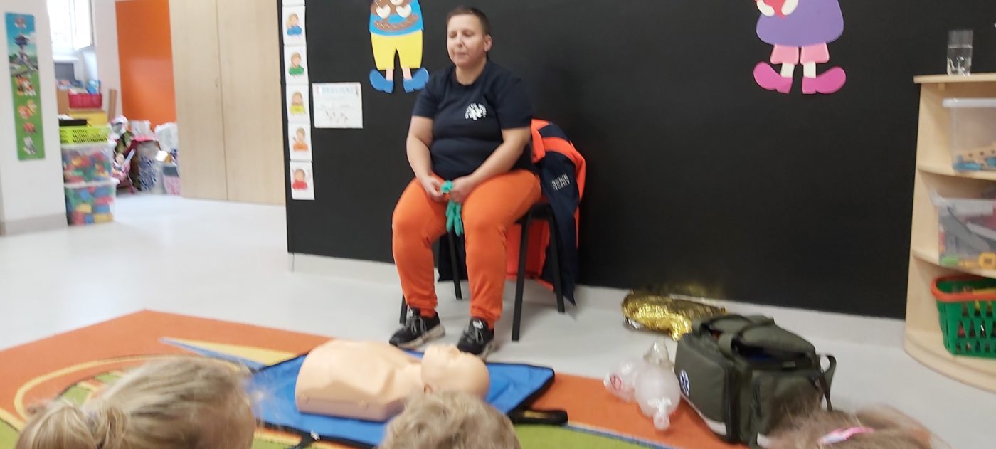 27 października nasze Przedszkole odwiedziła Pani Monika Bąk. Dzieci najpierw miały okazję obejrzeć strój ratownika i wysłuchać informacji na temat udzielania pierwszej pomocy; w jaki sposób można komuś pomóc zanim przyjedzie pogotowie ratunkowe, jak należy sprawdzać przytomność osoby poszkodowanej oraz w jaki sposób wzywać pomoc czyli jak rozmawiać przez telefon z dyspozytorką ( trzeba się przedstawić, powiedzieć ile ma się lat, powiedzieć gdzie się znajduje, co się stało i dlaczego potrzebujemy pomocy). Następnie z wielką uwagą przyglądały się jak pani ratownik demonstrowała sztuczne oddychanie i masaż serca na przywiezionych przez siebie fantomach. Później najdzielniejsze przedszkolaki próbowały same udzielać pierwszej pomocy pod bacznym okiem instruktorki. Dzieci miały też okazję przypomnieć i utrwalić sobie numery telefonów alarmowych.  Podczas tego spotkania dzieci nauczyły się wielu ważnych rzeczy, które w przyszłości być może przyczynią się do uratowania komuś życia. DZIĘKUJEMY ! To była dla nas wszystkich bardzo cenna lekcja.