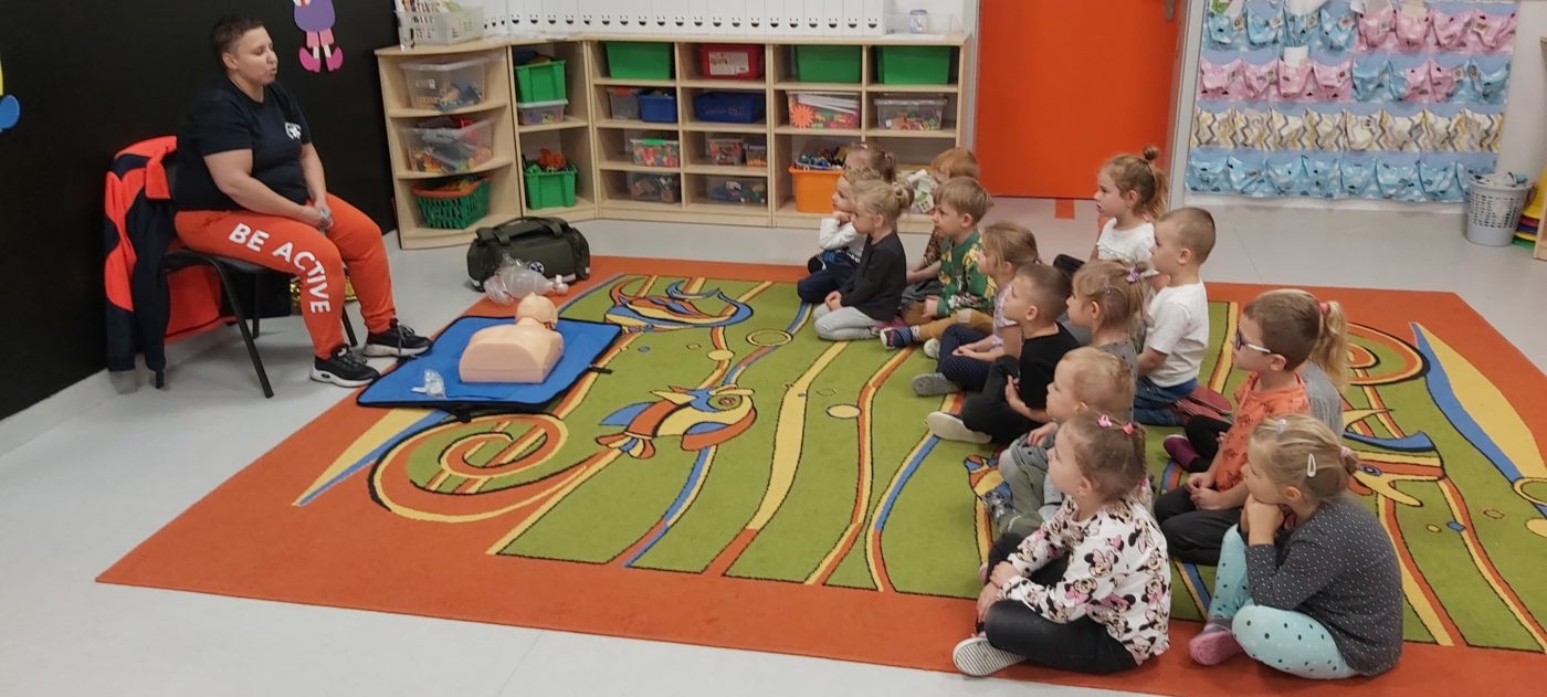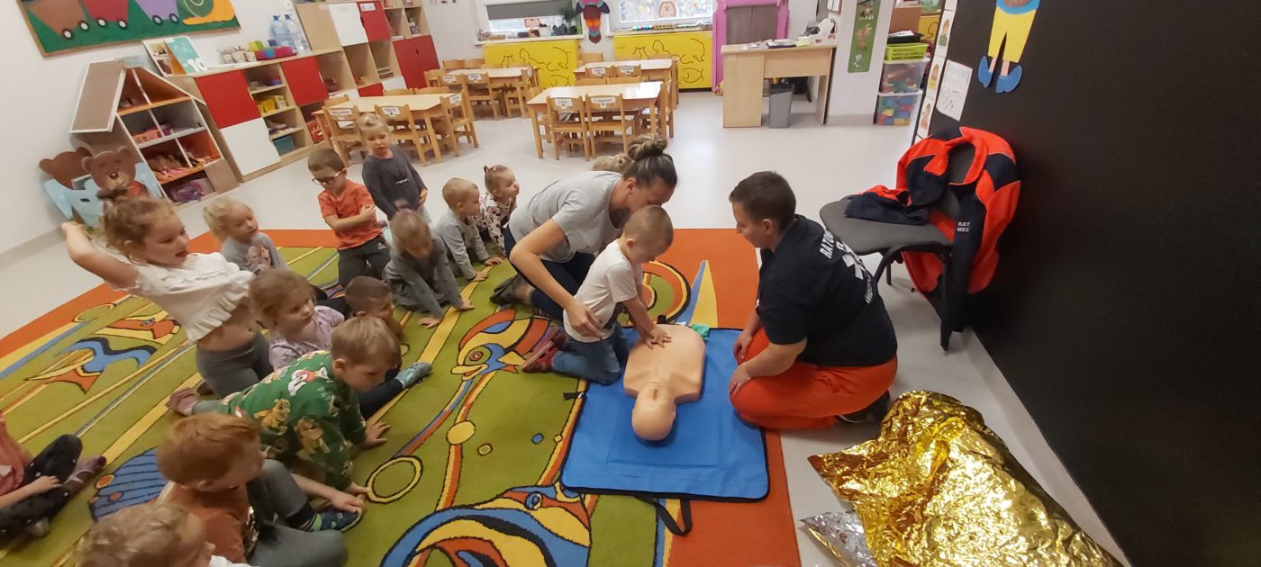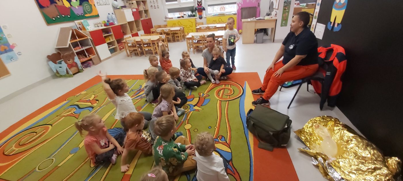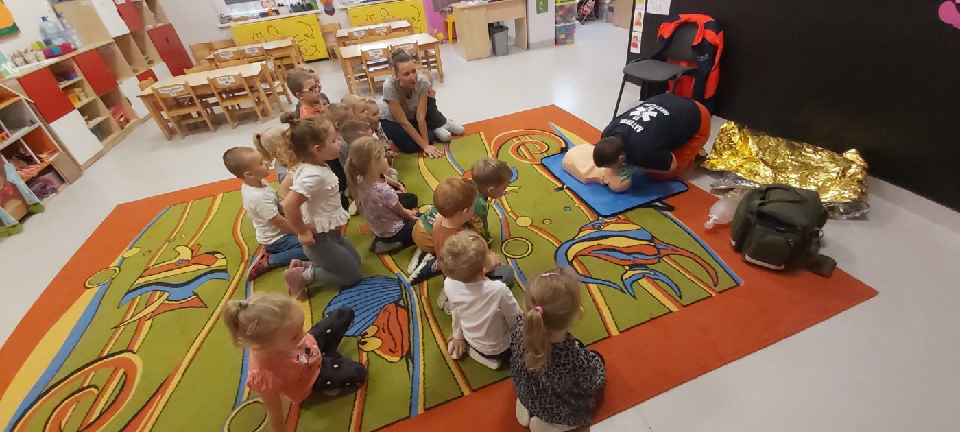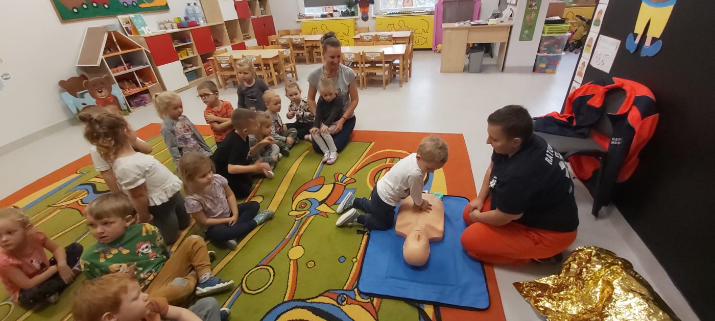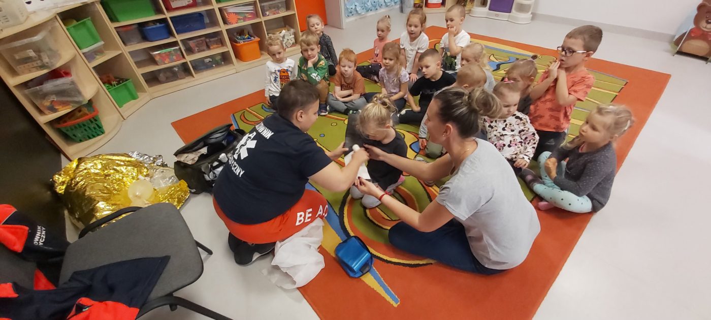 27 października nasze Przedszkole odwiedziła Pani Monika Bąk. Dzieci najpierw miały okazję obejrzeć strój ratownika i wysłuchać informacji na temat udzielania pierwszej pomocy; w jaki sposób można komuś pomóc zanim przyjedzie pogotowie ratunkowe, jak należy sprawdzać przytomność osoby poszkodowanej oraz w jaki sposób wzywać pomoc czyli jak rozmawiać przez telefon z dyspozytorką ( trzeba się przedstawić, powiedzieć ile ma się lat, powiedzieć gdzie się znajduje, co się stało i dlaczego potrzebujemy pomocy). Następnie z wielką uwagą przyglądały się jak pani ratownik demonstrowała sztuczne oddychanie i masaż serca na przywiezionych przez siebie fantomach. Później najdzielniejsze przedszkolaki próbowały same udzielać pierwszej pomocy pod bacznym okiem instruktorki. Dzieci miały też okazję przypomnieć i utrwalić sobie numery telefonów alarmowych.  Podczas tego spotkania dzieci nauczyły się wielu ważnych rzeczy, które w przyszłości być może przyczynią się do uratowania komuś życia. DZIĘKUJEMY ! To była dla nas wszystkich bardzo cenna lekcja.