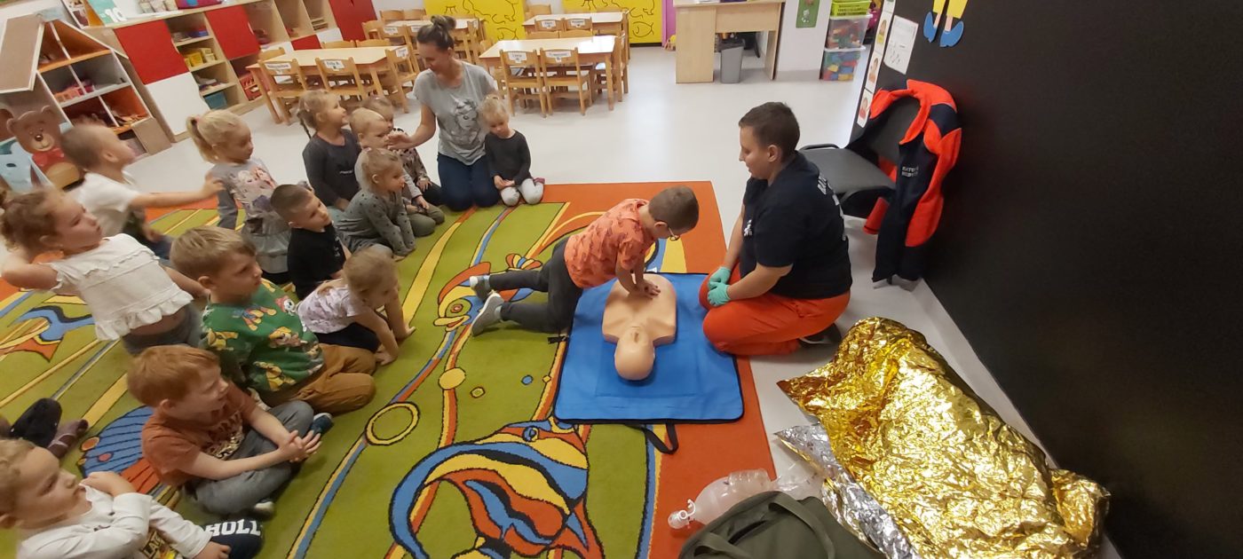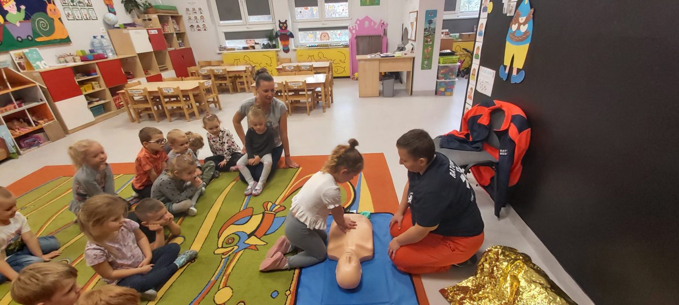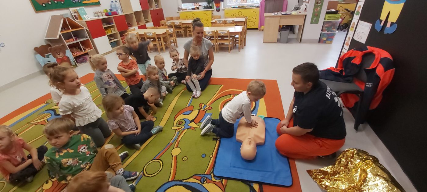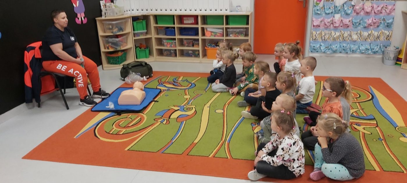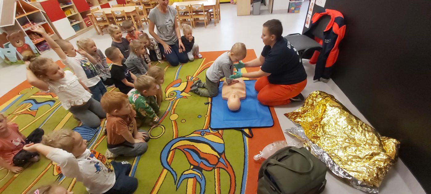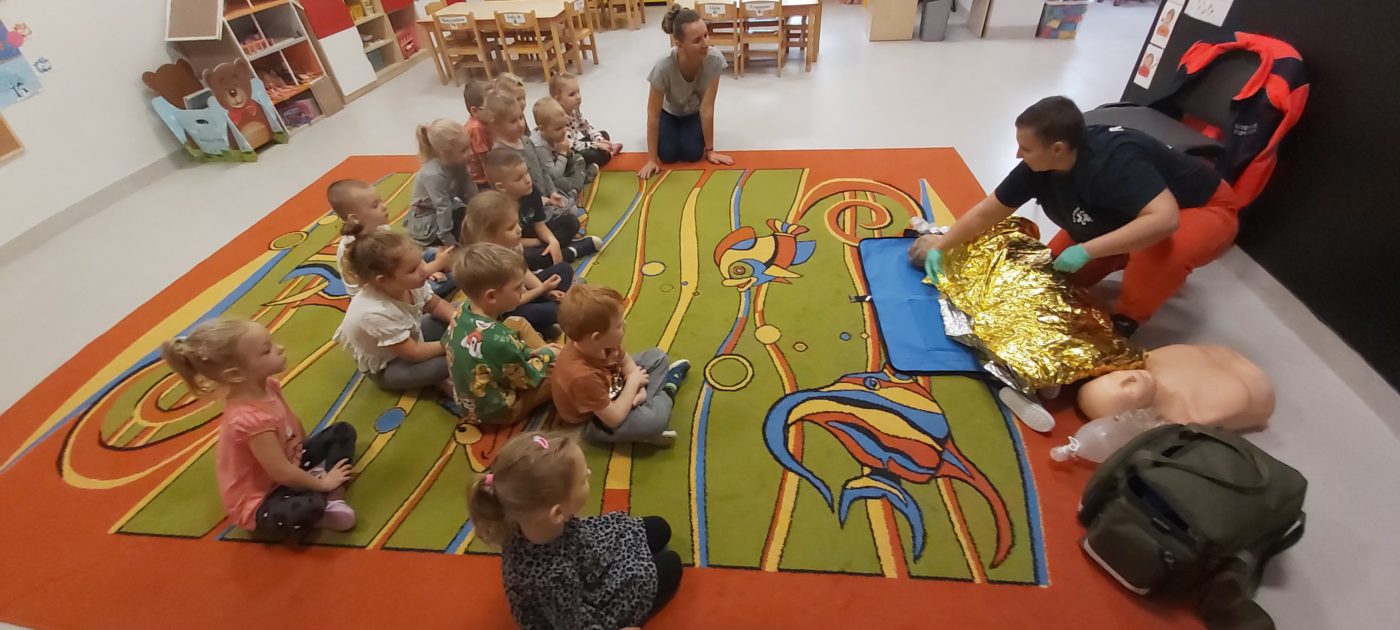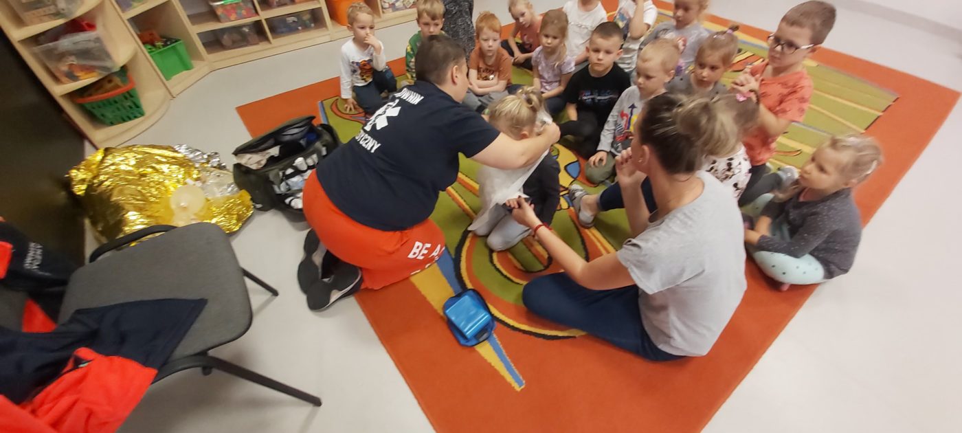 27 października nasze Przedszkole odwiedziła Pani Monika Bąk. Dzieci najpierw miały okazję obejrzeć strój ratownika i wysłuchać informacji na temat udzielania pierwszej pomocy; w jaki sposób można komuś pomóc zanim przyjedzie pogotowie ratunkowe, jak należy sprawdzać przytomność osoby poszkodowanej oraz w jaki sposób wzywać pomoc czyli jak rozmawiać przez telefon z dyspozytorką ( trzeba się przedstawić, powiedzieć ile ma się lat, powiedzieć gdzie się znajduje, co się stało i dlaczego potrzebujemy pomocy). Następnie z wielką uwagą przyglądały się jak pani ratownik demonstrowała sztuczne oddychanie i masaż serca na przywiezionych przez siebie fantomach. Później najdzielniejsze przedszkolaki próbowały same udzielać pierwszej pomocy pod bacznym okiem instruktorki. Dzieci miały też okazję przypomnieć i utrwalić sobie numery telefonów alarmowych.  Podczas tego spotkania dzieci nauczyły się wielu ważnych rzeczy, które w przyszłości być może przyczynią się do uratowania komuś życia. DZIĘKUJEMY ! To była dla nas wszystkich bardzo cenna lekcja.