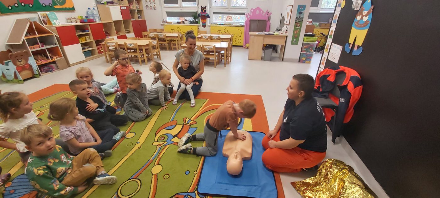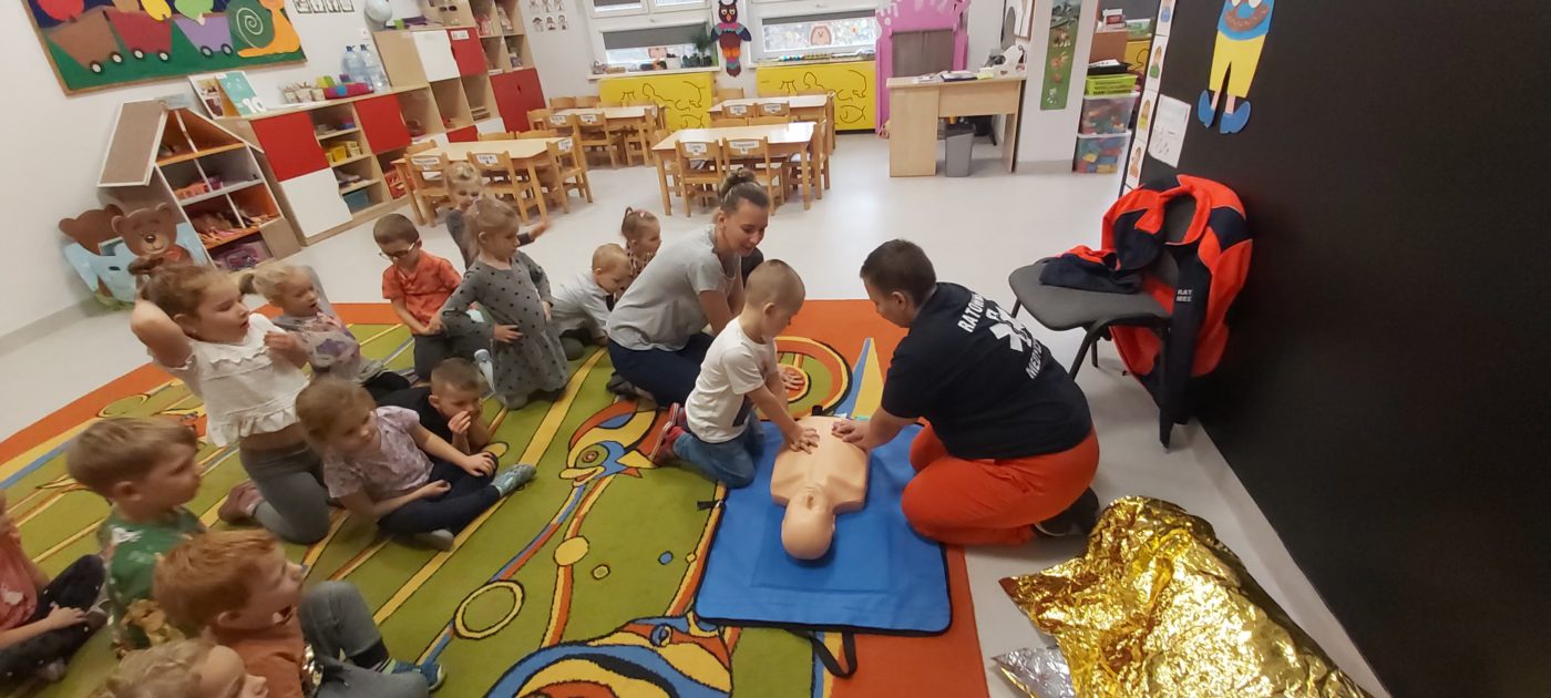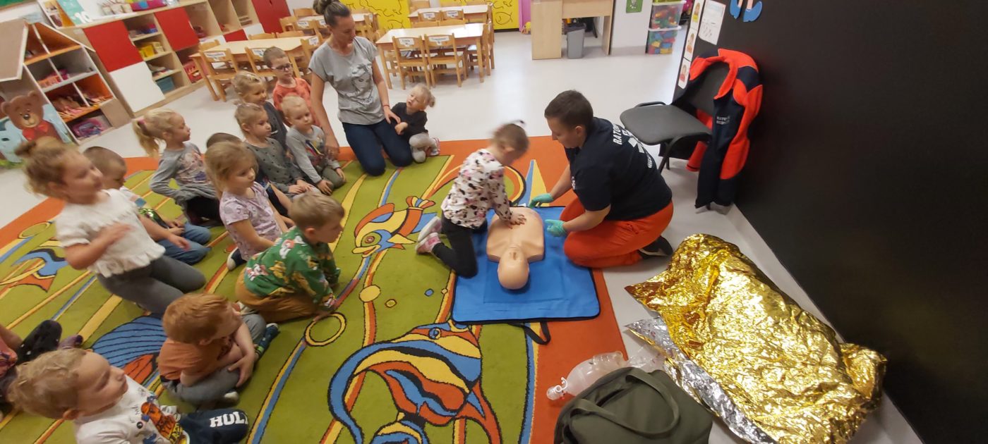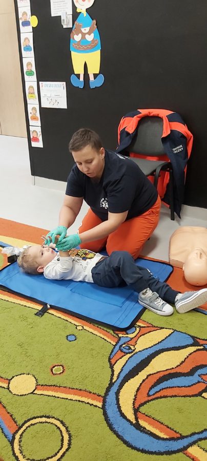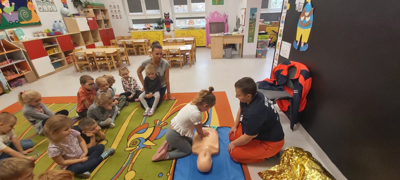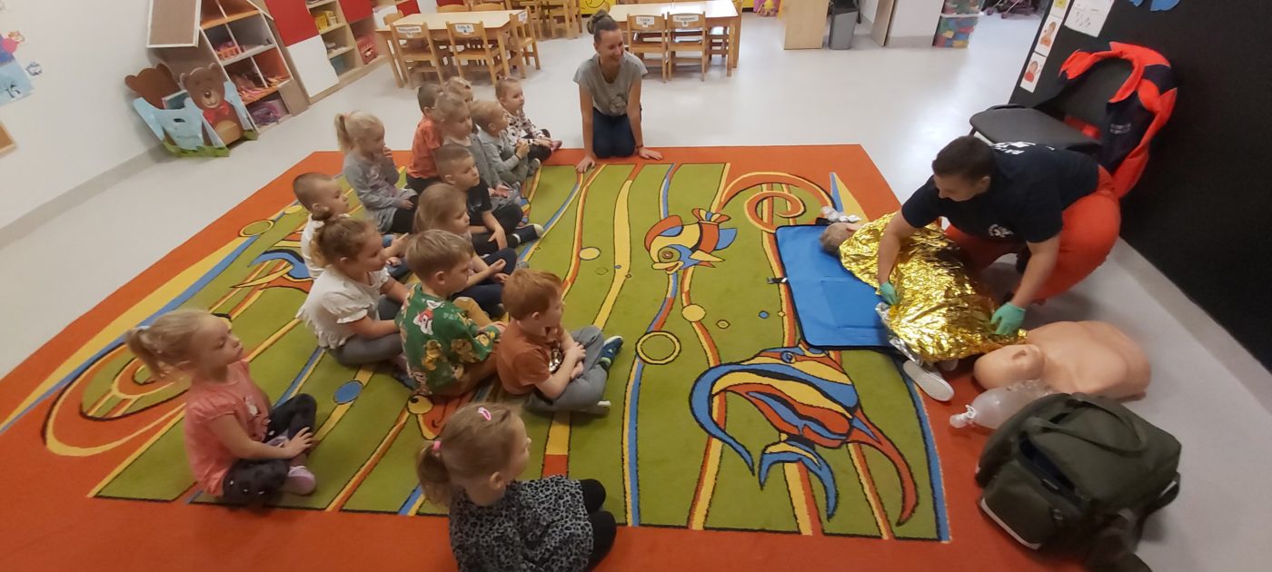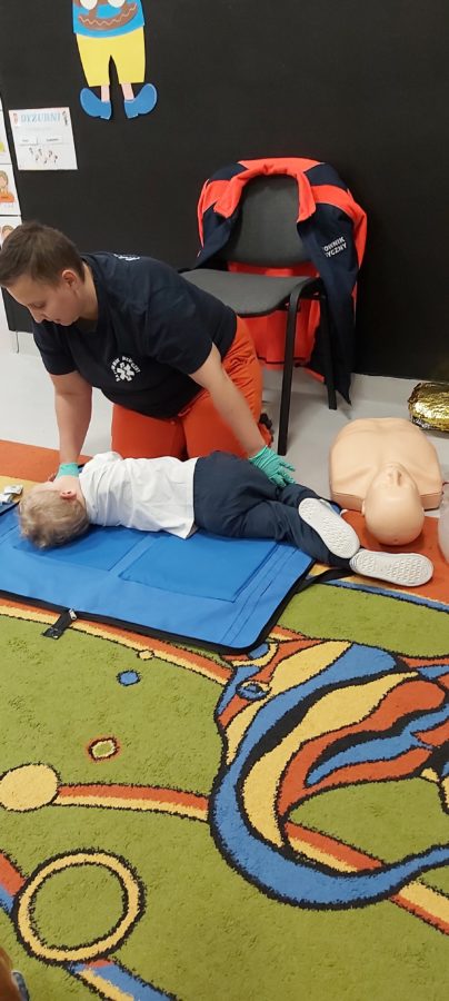 27 października nasze Przedszkole odwiedziła Pani Monika Bąk. Dzieci najpierw miały okazję obejrzeć strój ratownika i wysłuchać informacji na temat udzielania pierwszej pomocy; w jaki sposób można komuś pomóc zanim przyjedzie pogotowie ratunkowe, jak należy sprawdzać przytomność osoby poszkodowanej oraz w jaki sposób wzywać pomoc czyli jak rozmawiać przez telefon z dyspozytorką ( trzeba się przedstawić, powiedzieć ile ma się lat, powiedzieć gdzie się znajduje, co się stało i dlaczego potrzebujemy pomocy). Następnie z wielką uwagą przyglądały się jak pani ratownik demonstrowała sztuczne oddychanie i masaż serca na przywiezionych przez siebie fantomach. Później najdzielniejsze przedszkolaki próbowały same udzielać pierwszej pomocy pod bacznym okiem instruktorki. Dzieci miały też okazję przypomnieć i utrwalić sobie numery telefonów alarmowych.  Podczas tego spotkania dzieci nauczyły się wielu ważnych rzeczy, które w przyszłości być może przyczynią się do uratowania komuś życia. DZIĘKUJEMY ! To była dla nas wszystkich bardzo cenna lekcja.