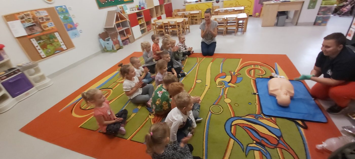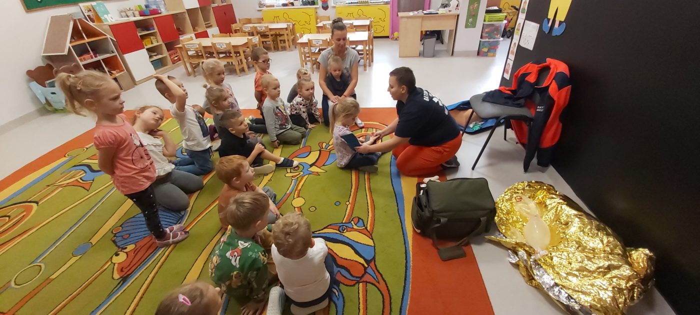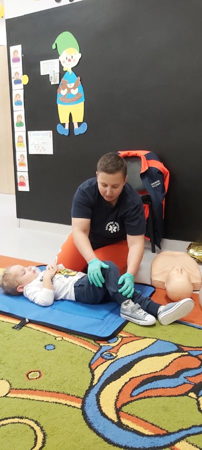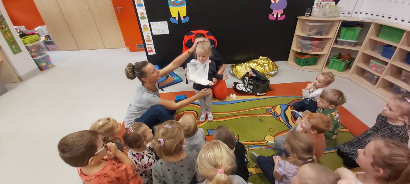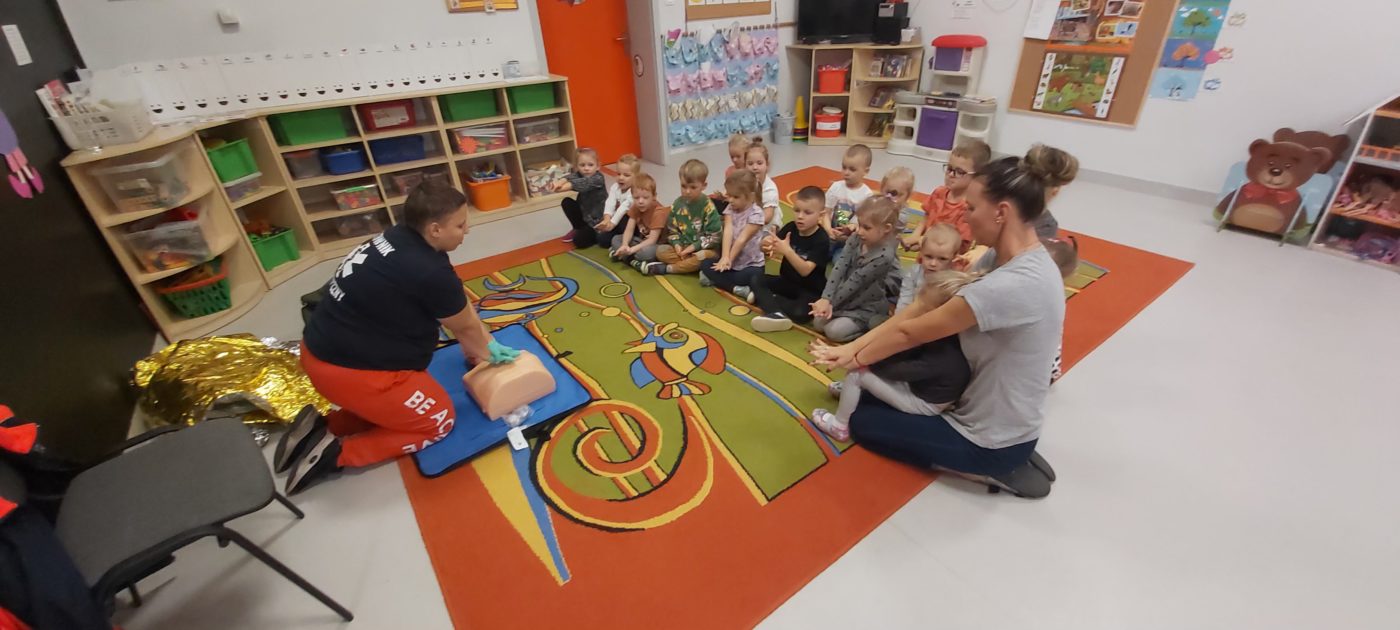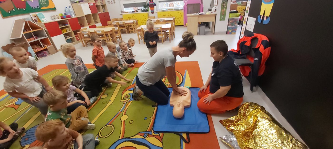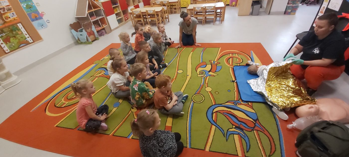 27 października nasze Przedszkole odwiedziła Pani Monika Bąk. Dzieci najpierw miały okazję obejrzeć strój ratownika i wysłuchać informacji na temat udzielania pierwszej pomocy; w jaki sposób można komuś pomóc zanim przyjedzie pogotowie ratunkowe, jak należy sprawdzać przytomność osoby poszkodowanej oraz w jaki sposób wzywać pomoc czyli jak rozmawiać przez telefon z dyspozytorką ( trzeba się przedstawić, powiedzieć ile ma się lat, powiedzieć gdzie się znajduje, co się stało i dlaczego potrzebujemy pomocy). Następnie z wielką uwagą przyglądały się jak pani ratownik demonstrowała sztuczne oddychanie i masaż serca na przywiezionych przez siebie fantomach. Później najdzielniejsze przedszkolaki próbowały same udzielać pierwszej pomocy pod bacznym okiem instruktorki. Dzieci miały też okazję przypomnieć i utrwalić sobie numery telefonów alarmowych.  Podczas tego spotkania dzieci nauczyły się wielu ważnych rzeczy, które w przyszłości być może przyczynią się do uratowania komuś życia. DZIĘKUJEMY ! To była dla nas wszystkich bardzo cenna lekcja.
