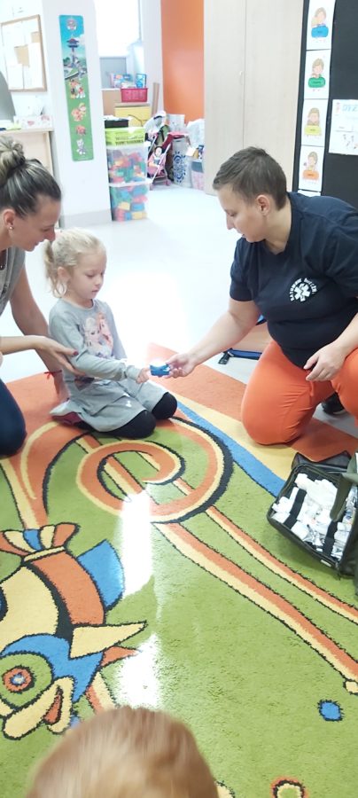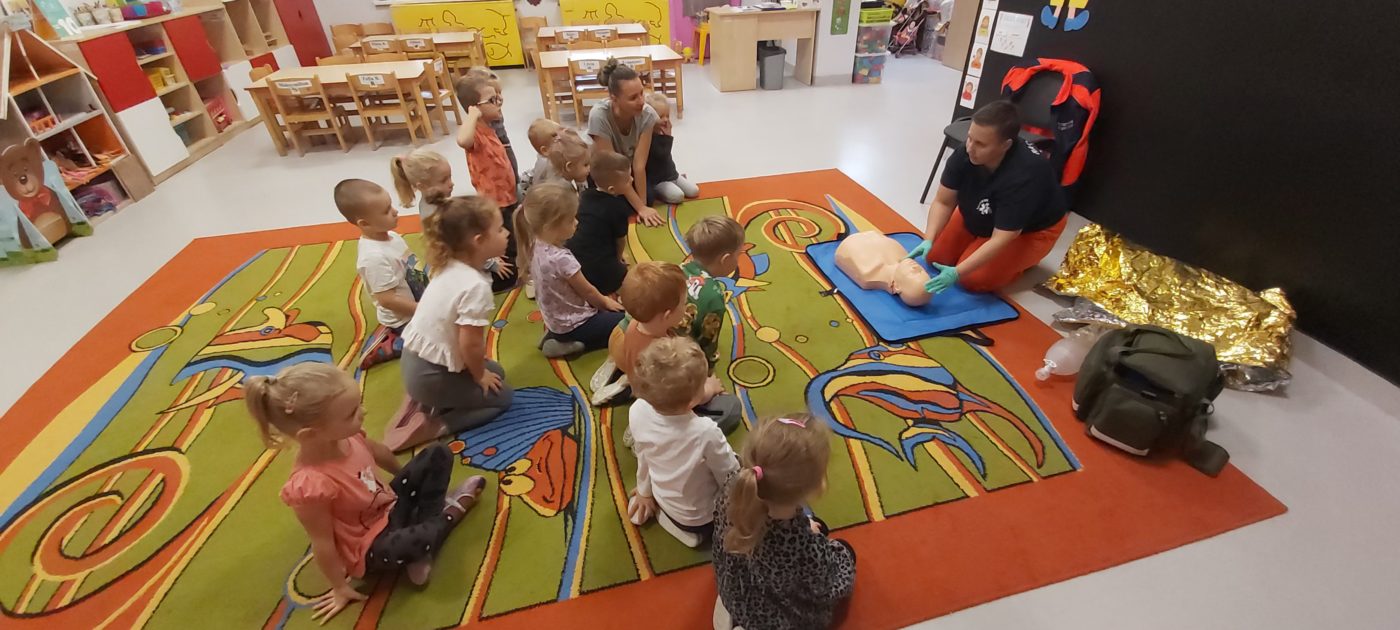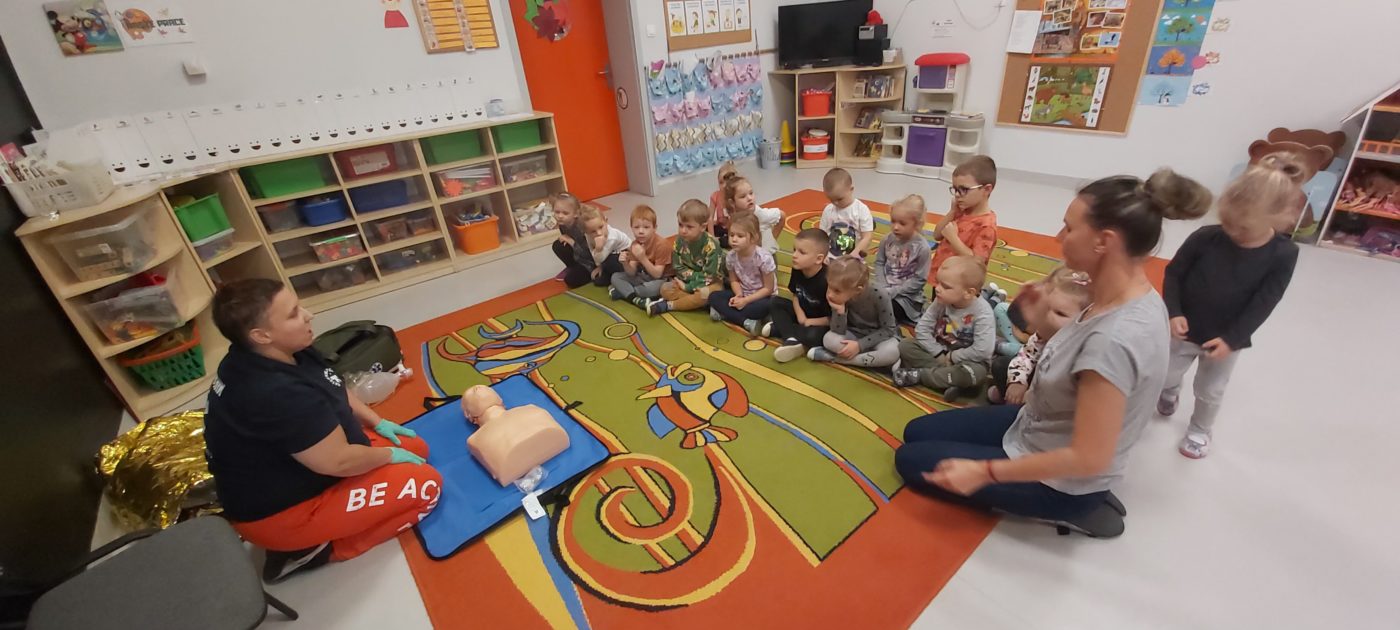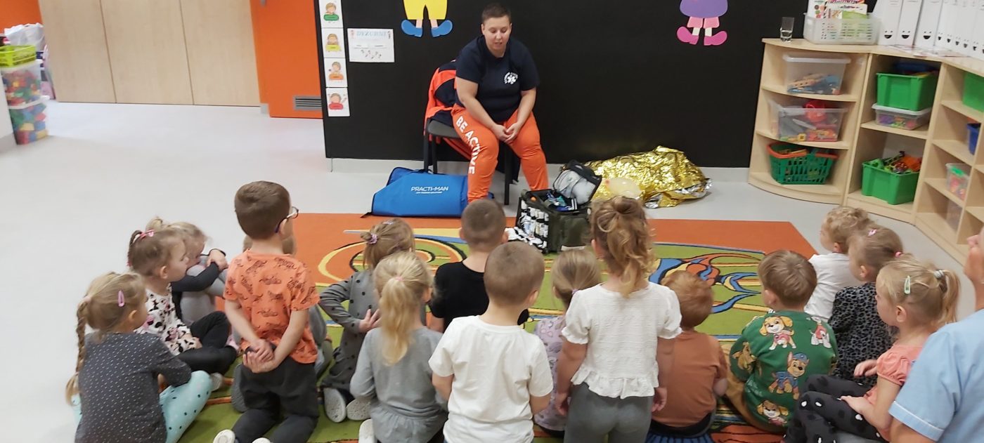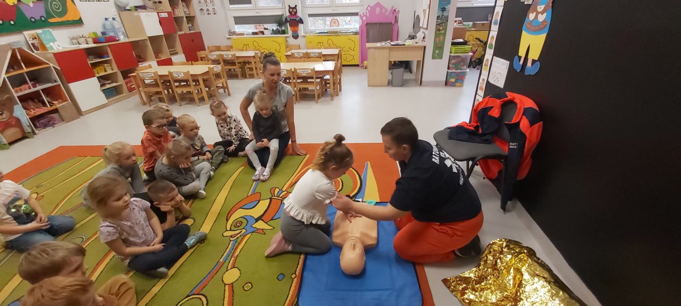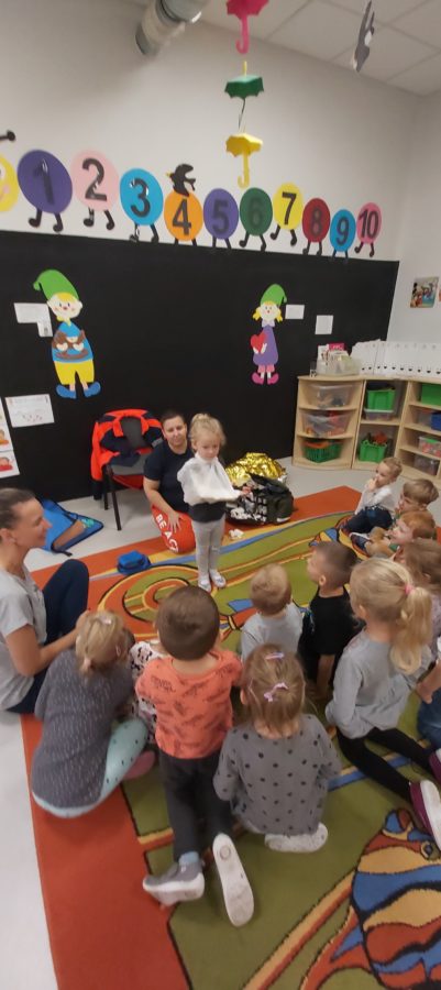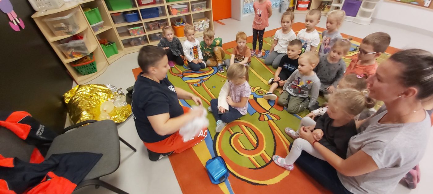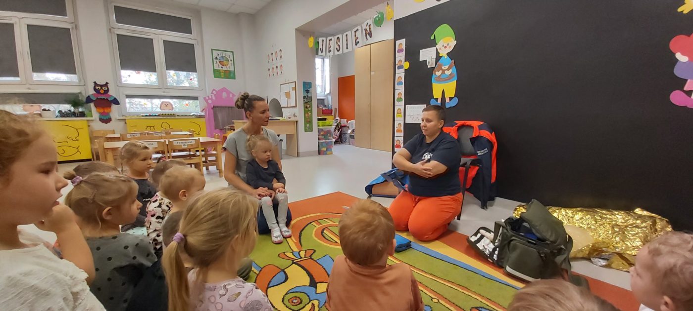 27 października nasze Przedszkole odwiedziła Pani Monika Bąk. Dzieci najpierw miały okazję obejrzeć strój ratownika i wysłuchać informacji na temat udzielania pierwszej pomocy; w jaki sposób można komuś pomóc zanim przyjedzie pogotowie ratunkowe, jak należy sprawdzać przytomność osoby poszkodowanej oraz w jaki sposób wzywać pomoc czyli jak rozmawiać przez telefon z dyspozytorką ( trzeba się przedstawić, powiedzieć ile ma się lat, powiedzieć gdzie się znajduje, co się stało i dlaczego potrzebujemy pomocy). Następnie z wielką uwagą przyglądały się jak pani ratownik demonstrowała sztuczne oddychanie i masaż serca na przywiezionych przez siebie fantomach. Później najdzielniejsze przedszkolaki próbowały same udzielać pierwszej pomocy pod bacznym okiem instruktorki. Dzieci miały też okazję przypomnieć i utrwalić sobie numery telefonów alarmowych.  Podczas tego spotkania dzieci nauczyły się wielu ważnych rzeczy, które w przyszłości być może przyczynią się do uratowania komuś życia. DZIĘKUJEMY ! To była dla nas wszystkich bardzo cenna lekcja.