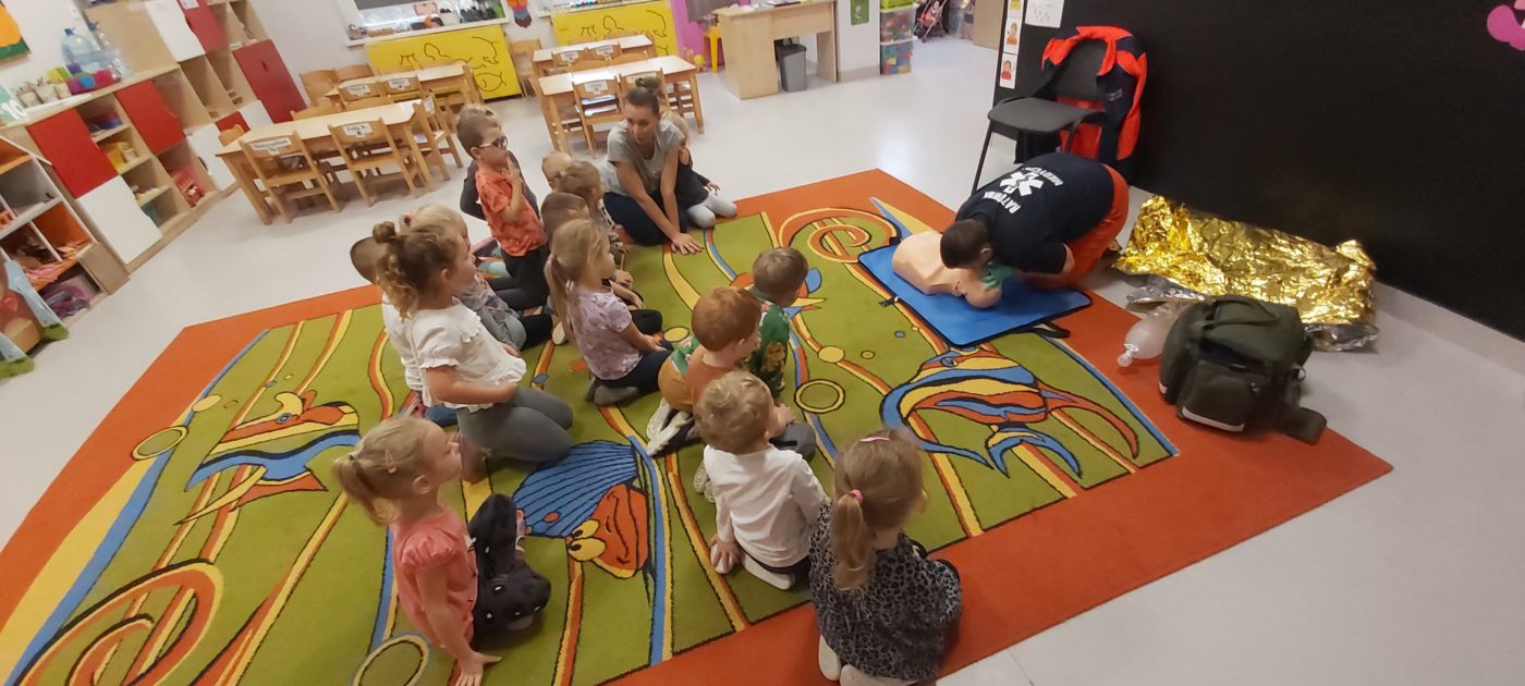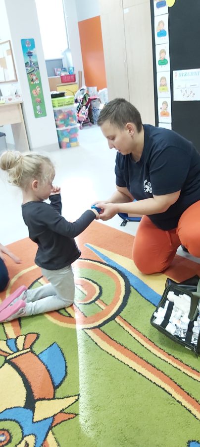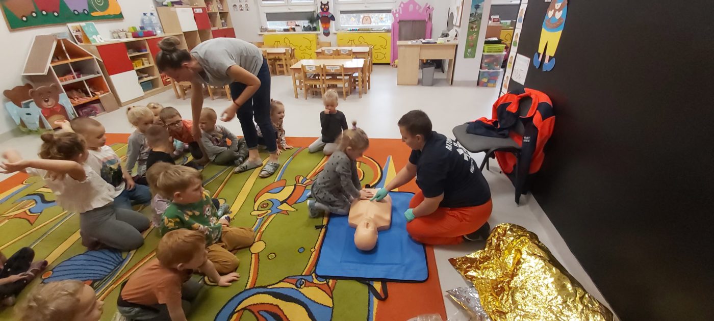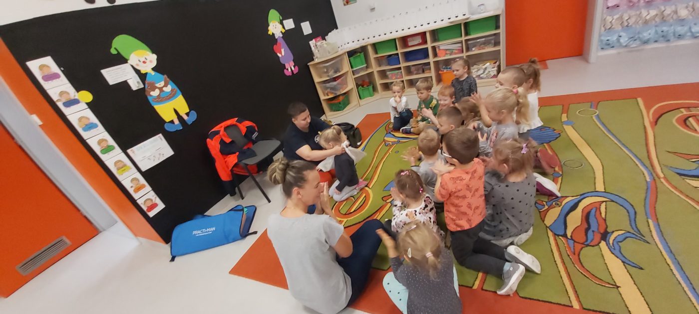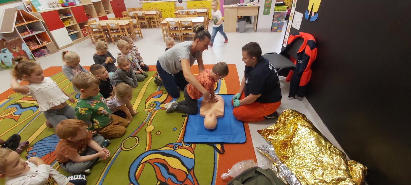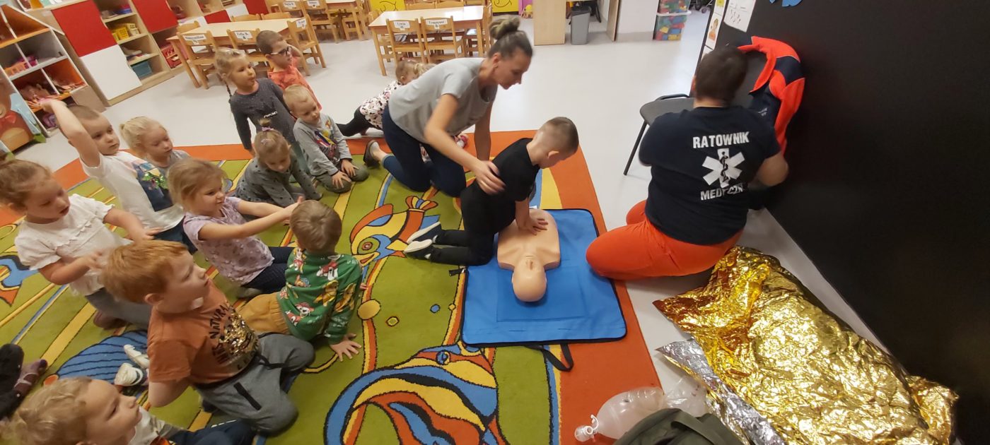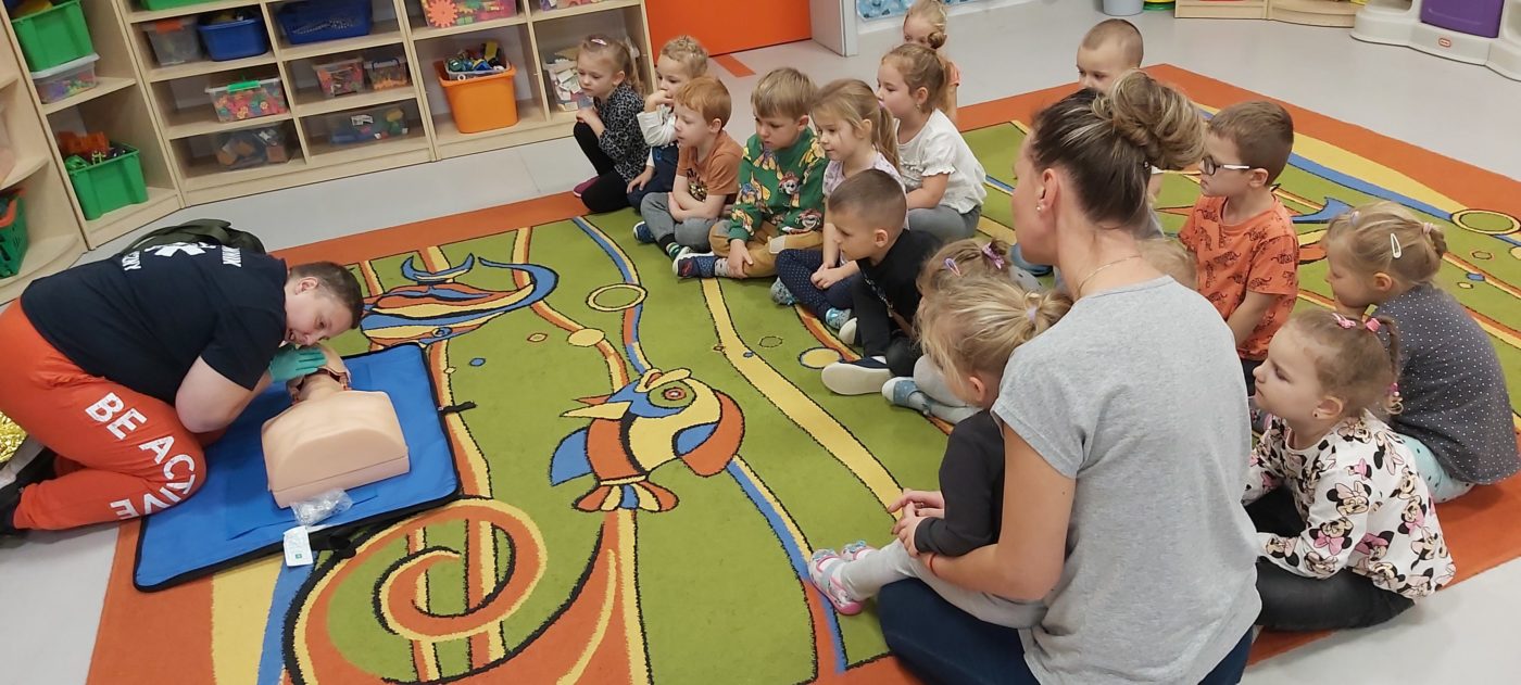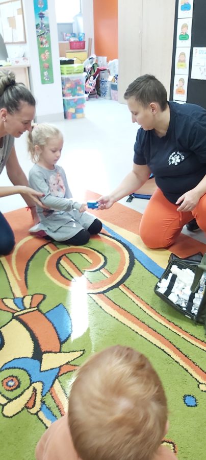 27 października nasze Przedszkole odwiedziła Pani Monika Bąk. Dzieci najpierw miały okazję obejrzeć strój ratownika i wysłuchać informacji na temat udzielania pierwszej pomocy; w jaki sposób można komuś pomóc zanim przyjedzie pogotowie ratunkowe, jak należy sprawdzać przytomność osoby poszkodowanej oraz w jaki sposób wzywać pomoc czyli jak rozmawiać przez telefon z dyspozytorką ( trzeba się przedstawić, powiedzieć ile ma się lat, powiedzieć gdzie się znajduje, co się stało i dlaczego potrzebujemy pomocy). Następnie z wielką uwagą przyglądały się jak pani ratownik demonstrowała sztuczne oddychanie i masaż serca na przywiezionych przez siebie fantomach. Później najdzielniejsze przedszkolaki próbowały same udzielać pierwszej pomocy pod bacznym okiem instruktorki. Dzieci miały też okazję przypomnieć i utrwalić sobie numery telefonów alarmowych.  Podczas tego spotkania dzieci nauczyły się wielu ważnych rzeczy, które w przyszłości być może przyczynią się do uratowania komuś życia. DZIĘKUJEMY ! To była dla nas wszystkich bardzo cenna lekcja.