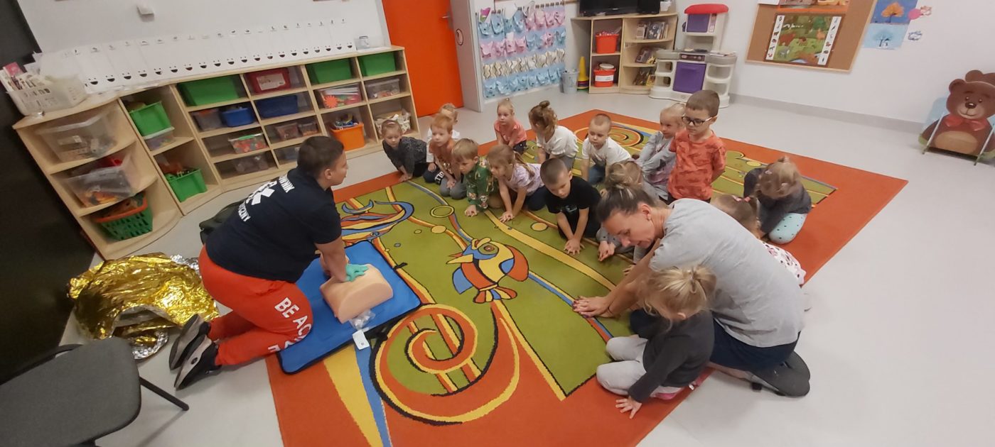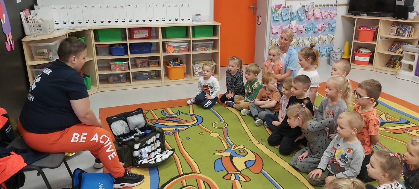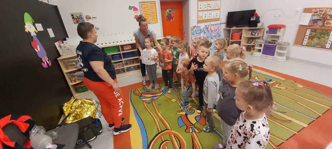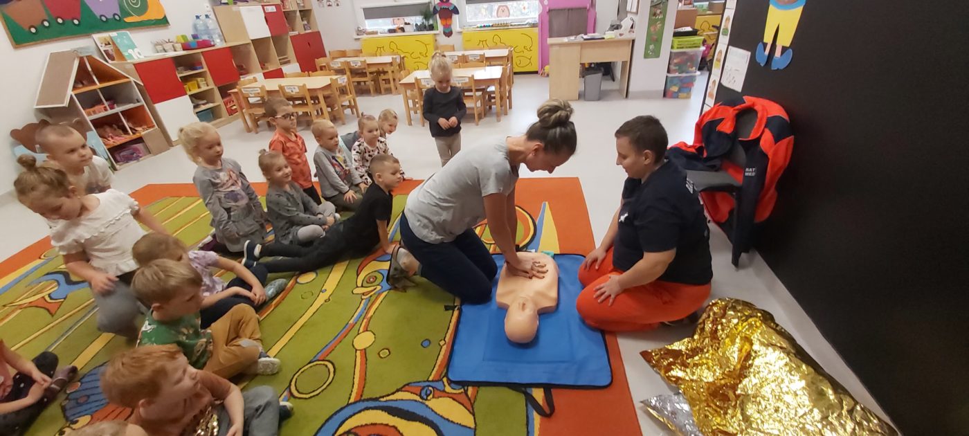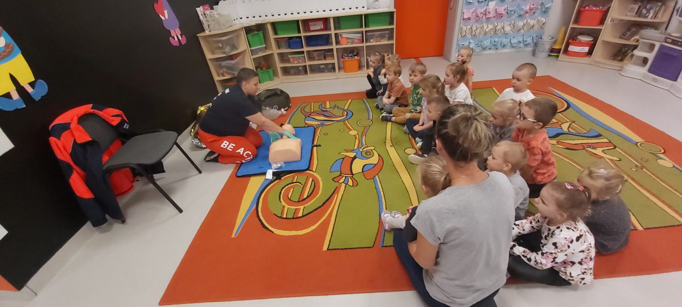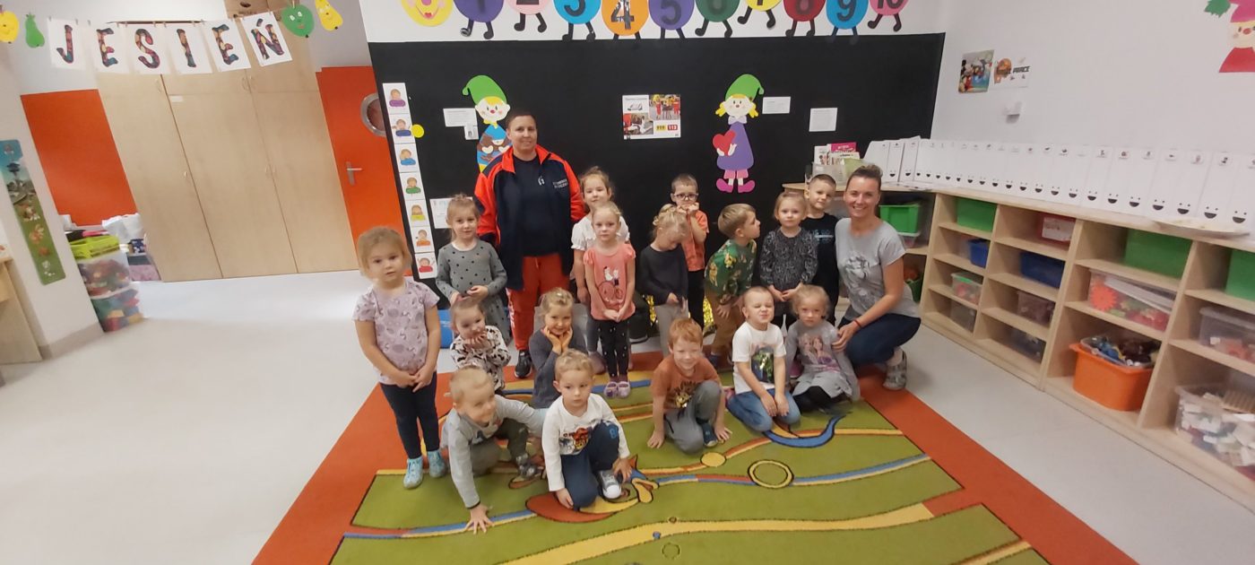 27 października nasze Przedszkole odwiedziła Pani Monika Bąk. Dzieci najpierw miały okazję obejrzeć strój ratownika i wysłuchać informacji na temat udzielania pierwszej pomocy; w jaki sposób można komuś pomóc zanim przyjedzie pogotowie ratunkowe, jak należy sprawdzać przytomność osoby poszkodowanej oraz w jaki sposób wzywać pomoc czyli jak rozmawiać przez telefon z dyspozytorką ( trzeba się przedstawić, powiedzieć ile ma się lat, powiedzieć gdzie się znajduje, co się stało i dlaczego potrzebujemy pomocy). Następnie z wielką uwagą przyglądały się jak pani ratownik demonstrowała sztuczne oddychanie i masaż serca na przywiezionych przez siebie fantomach. Później najdzielniejsze przedszkolaki próbowały same udzielać pierwszej pomocy pod bacznym okiem instruktorki. Dzieci miały też okazję przypomnieć i utrwalić sobie numery telefonów alarmowych.  Podczas tego spotkania dzieci nauczyły się wielu ważnych rzeczy, które w przyszłości być może przyczynią się do uratowania komuś życia. DZIĘKUJEMY ! To była dla nas wszystkich bardzo cenna lekcja.