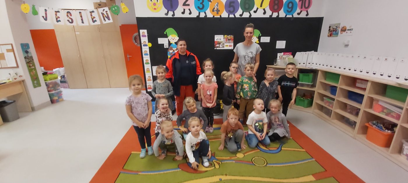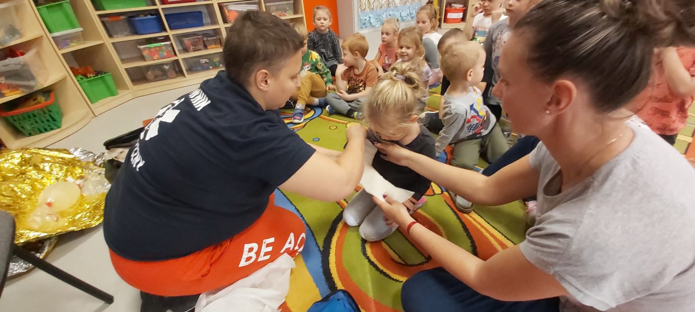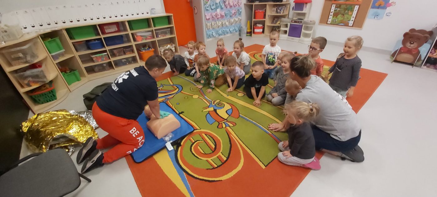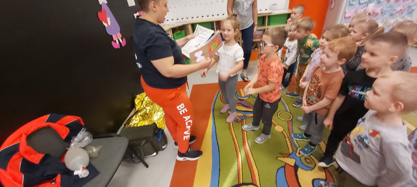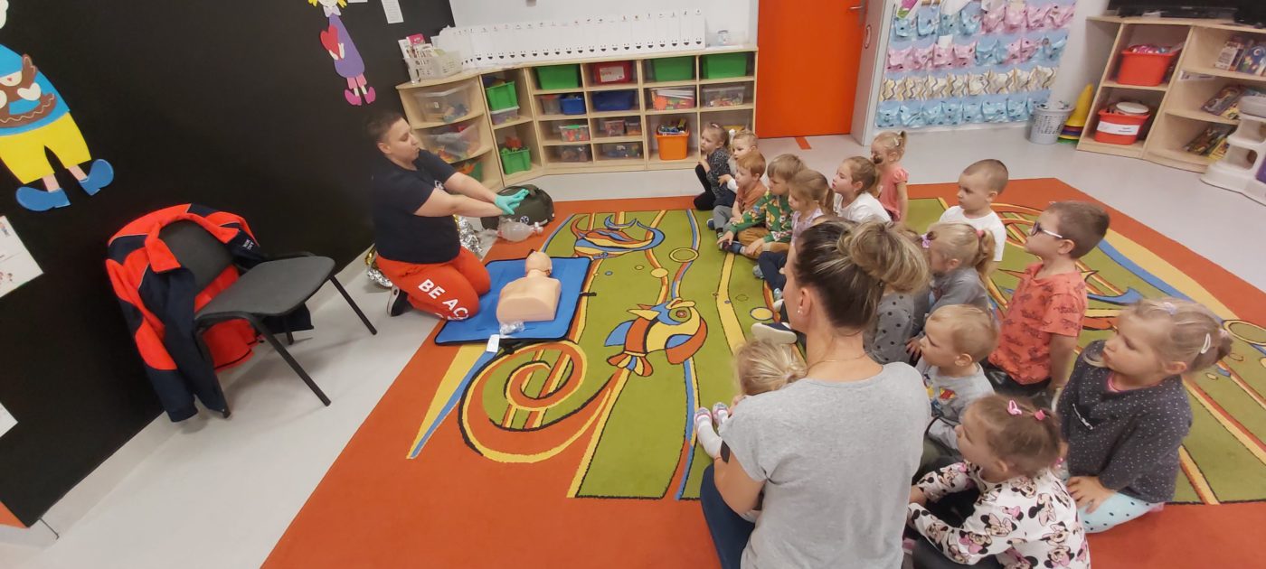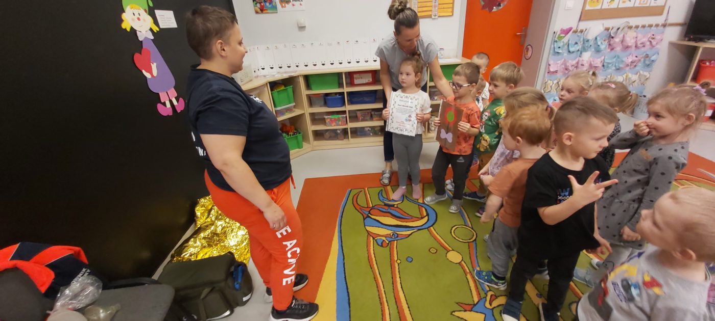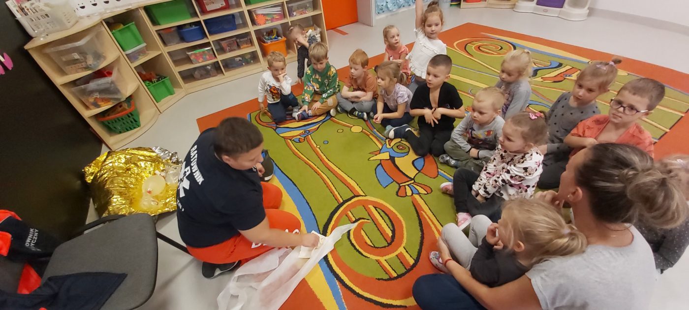 27 października nasze Przedszkole odwiedziła Pani Monika Bąk. Dzieci najpierw miały okazję obejrzeć strój ratownika i wysłuchać informacji na temat udzielania pierwszej pomocy; w jaki sposób można komuś pomóc zanim przyjedzie pogotowie ratunkowe, jak należy sprawdzać przytomność osoby poszkodowanej oraz w jaki sposób wzywać pomoc czyli jak rozmawiać przez telefon z dyspozytorką ( trzeba się przedstawić, powiedzieć ile ma się lat, powiedzieć gdzie się znajduje, co się stało i dlaczego potrzebujemy pomocy). Następnie z wielką uwagą przyglądały się jak pani ratownik demonstrowała sztuczne oddychanie i masaż serca na przywiezionych przez siebie fantomach. Później najdzielniejsze przedszkolaki próbowały same udzielać pierwszej pomocy pod bacznym okiem instruktorki. Dzieci miały też okazję przypomnieć i utrwalić sobie numery telefonów alarmowych.  Podczas tego spotkania dzieci nauczyły się wielu ważnych rzeczy, które w przyszłości być może przyczynią się do uratowania komuś życia. DZIĘKUJEMY ! To była dla nas wszystkich bardzo cenna lekcja.