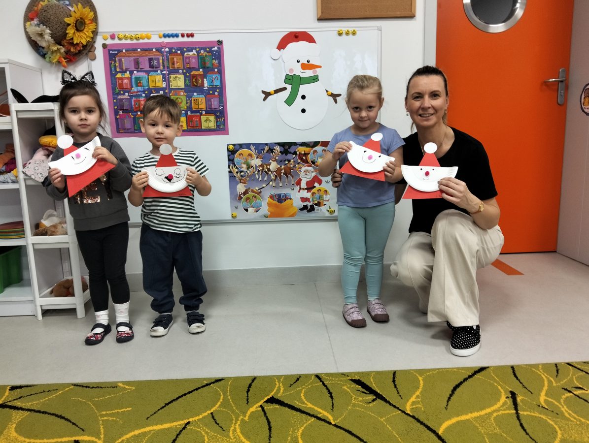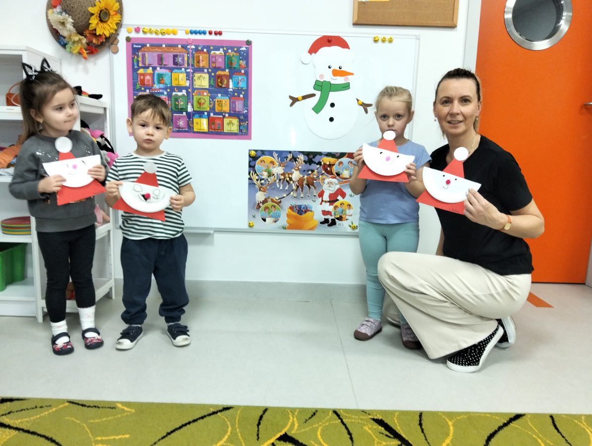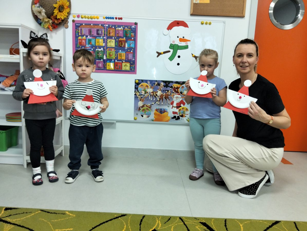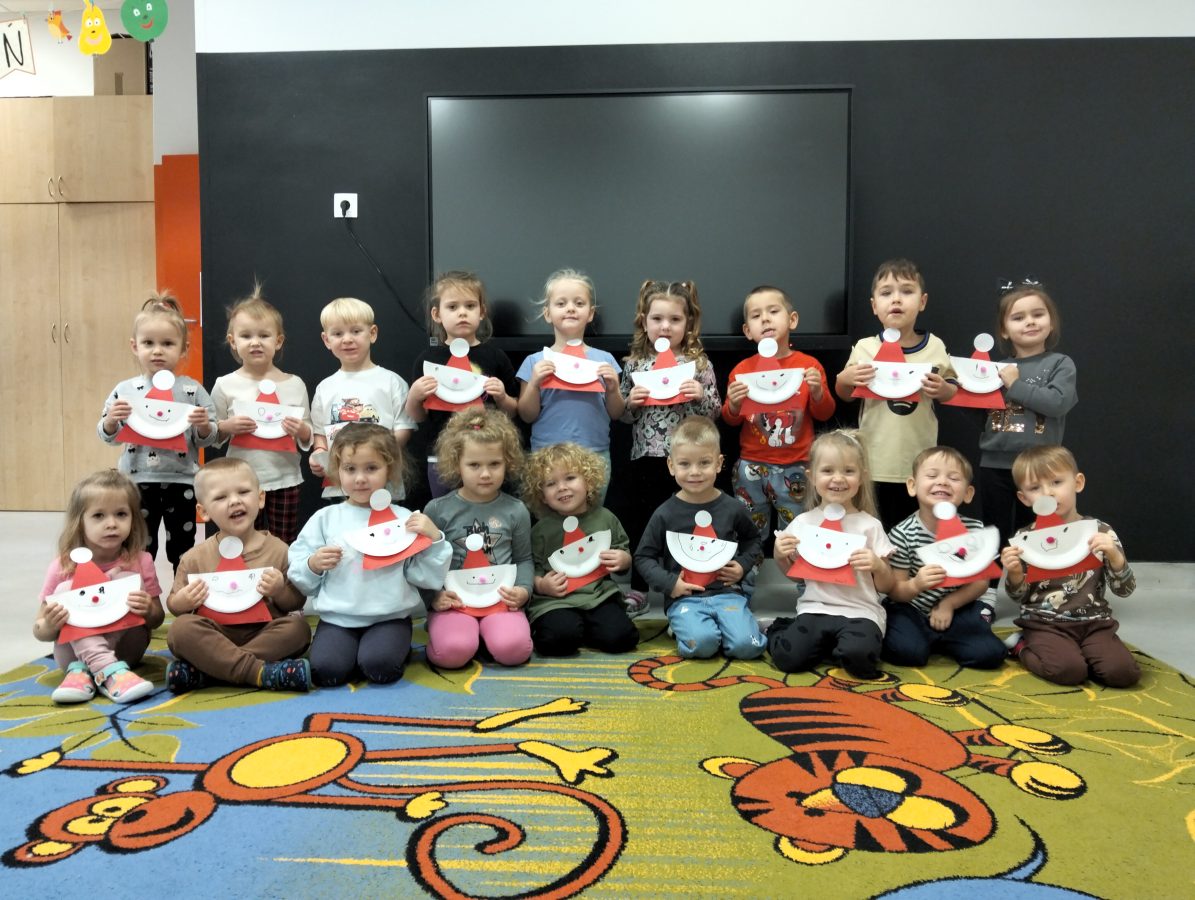 Przed przyjściem Mikołaja dzieci z naszej grupy wykonały pracę plastyczną „Mikołaj” na jego przybycie wkrótce… Wykorzystały trójkąt wycięty z czerwonego papieru oraz połówkę papierowego talerzyka jako brodę. Same narysowały oczy i buzię, a następnie przykleiły czerwony nos. Praca pozwoliła im ćwiczyć sprawność manualną, kreatywność oraz umiejętność komponowania elementów.