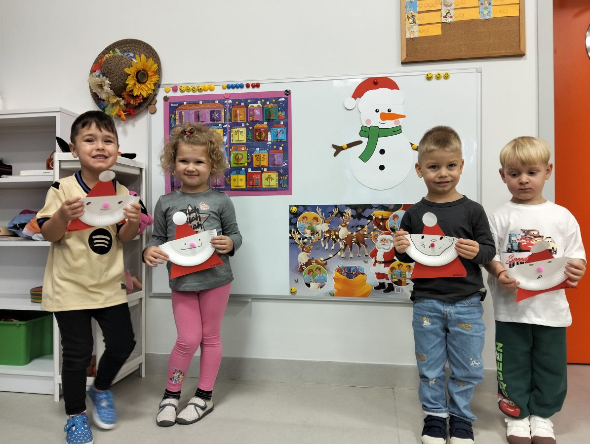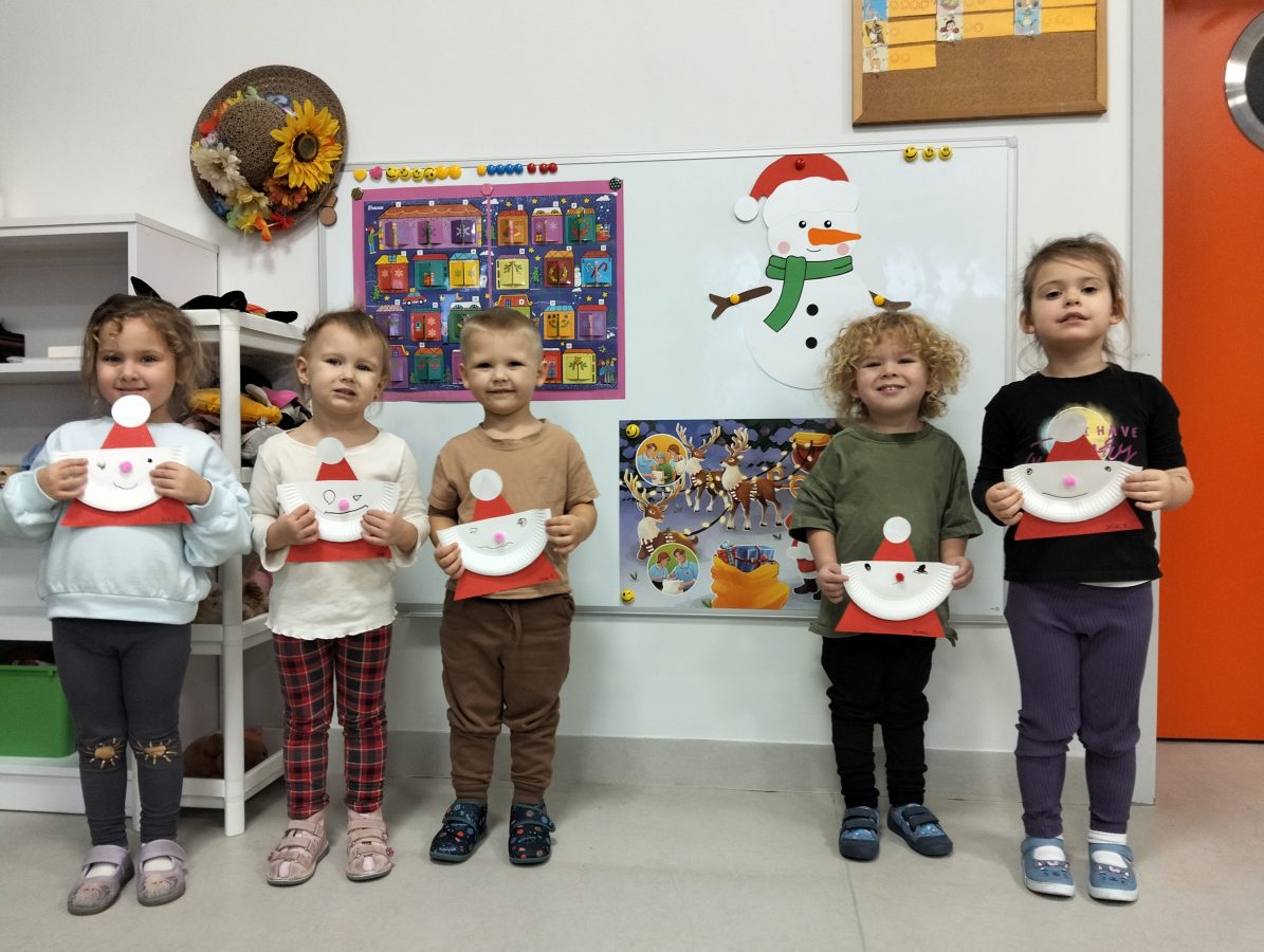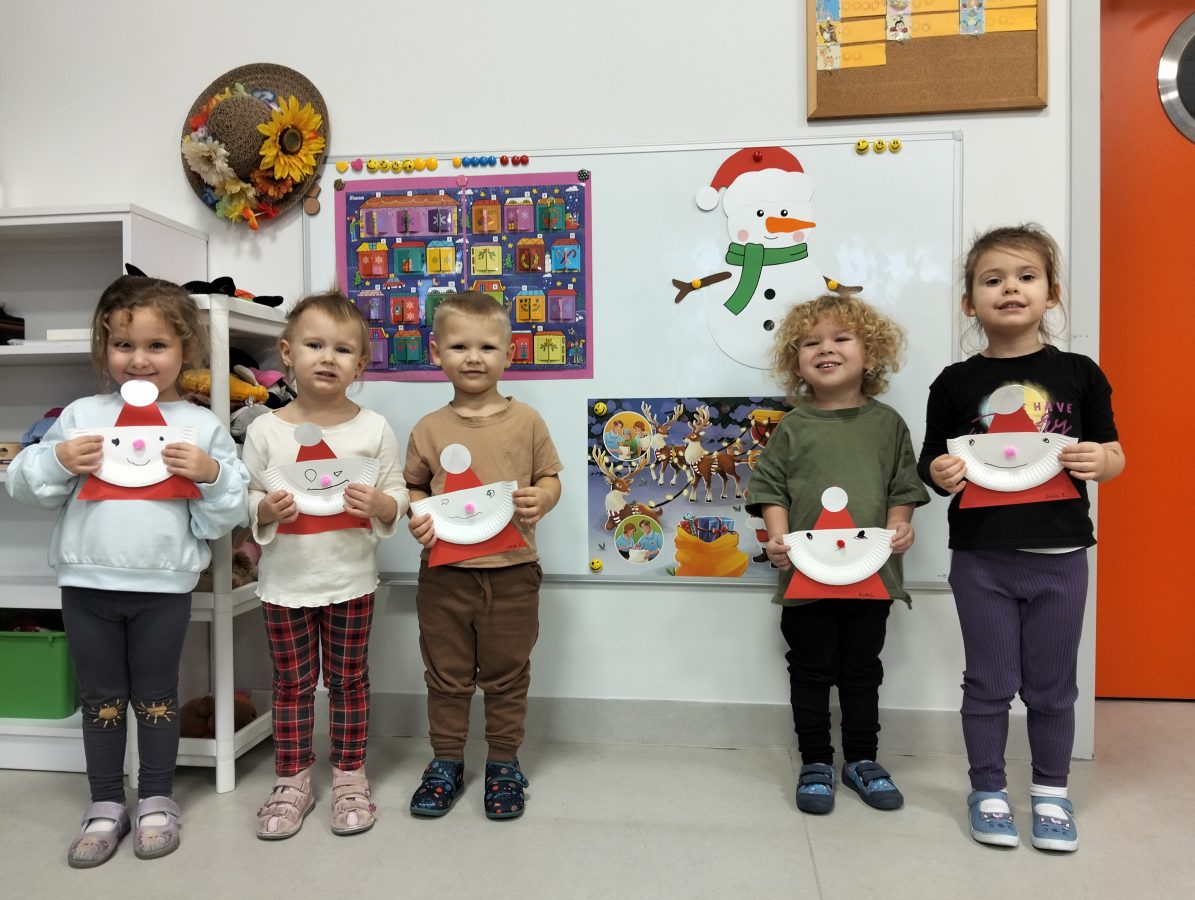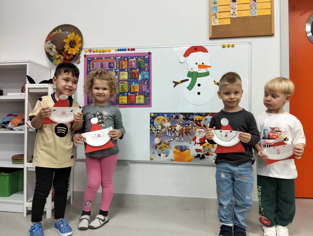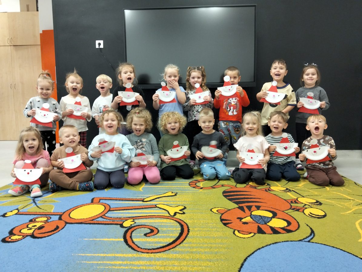 Przed przyjściem Mikołaja dzieci z naszej grupy wykonały pracę plastyczną „Mikołaj” na jego przybycie wkrótce… Wykorzystały trójkąt wycięty z czerwonego papieru oraz połówkę papierowego talerzyka jako brodę. Same narysowały oczy i buzię, a następnie przykleiły czerwony nos. Praca pozwoliła im ćwiczyć sprawność manualną, kreatywność oraz umiejętność komponowania elementów.