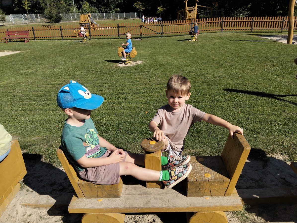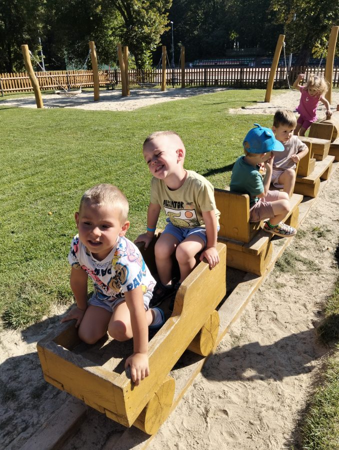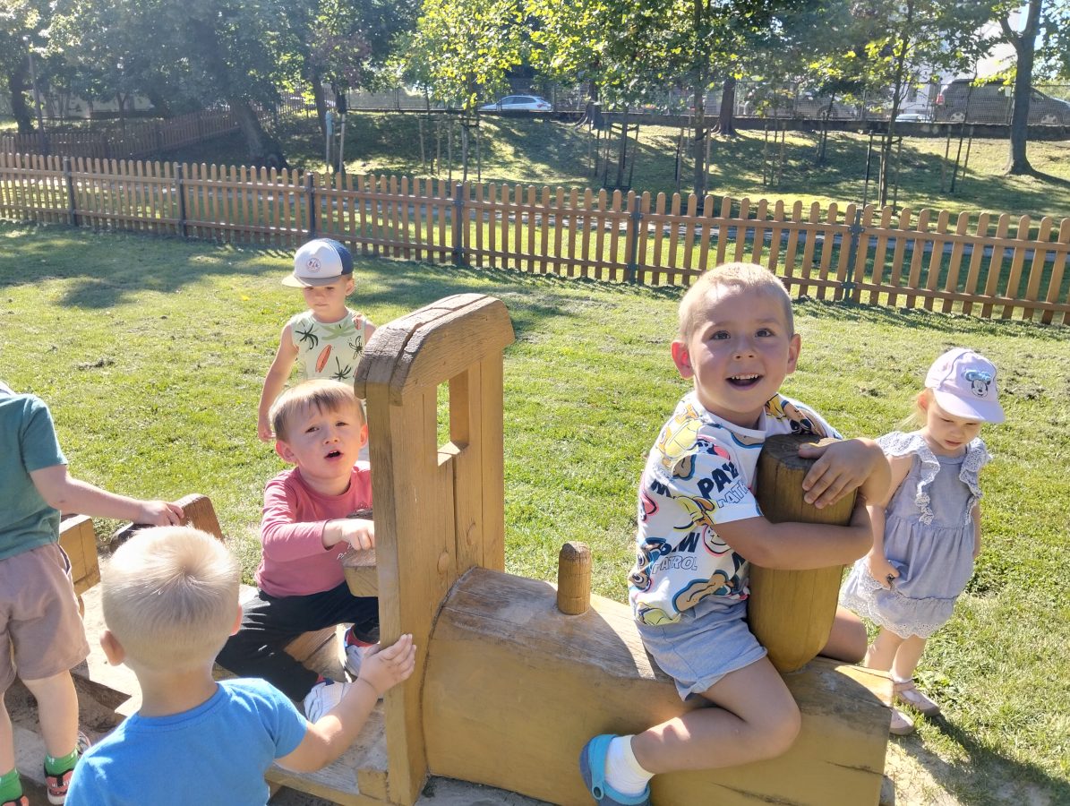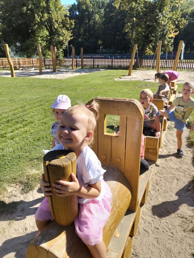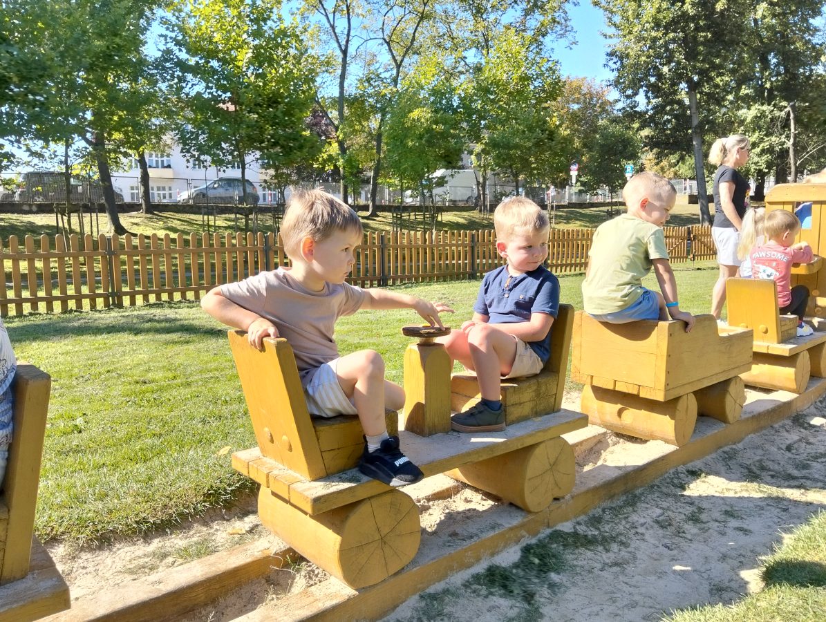 Nasze najmłodsze przedszkolaki po raz pierwszy wybrały się na plac zabaw. Największym zainteresowaniem cieszyła się drewniana ciuchcia, do której dzieci chętnie wsiadały i udawały małych maszynistów. Sporo radości sprawiły im także przejażdżki na bujakach – kolorowej biedronce i autku. Choć były to pierwsze chwile poza salą, dzieci od razu odnalazły się w nowych zabawach. Towarzyszyło im mnóstwo uśmiechu, radosnych okrzyków i pierwszych prób wspólnej integracji. To dopiero początek ich przygody na świeżym powietrzu, a my z radością będziemy obserwować, jak każdego dnia odkrywają coś nowego! 🌳✨