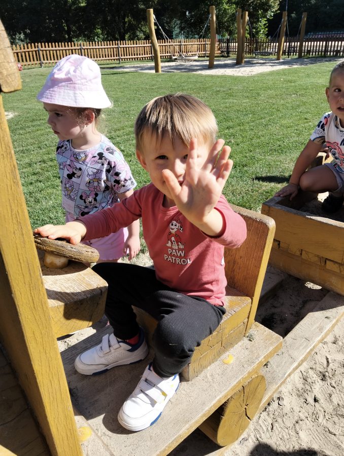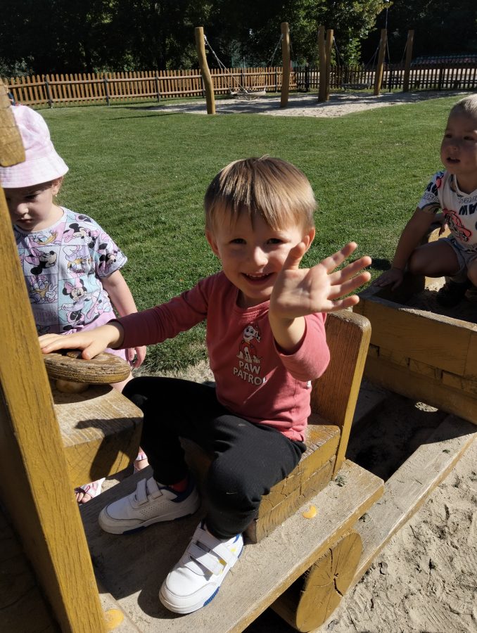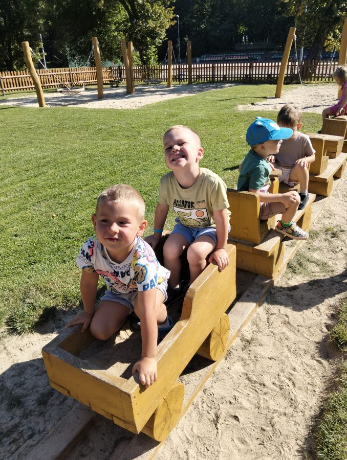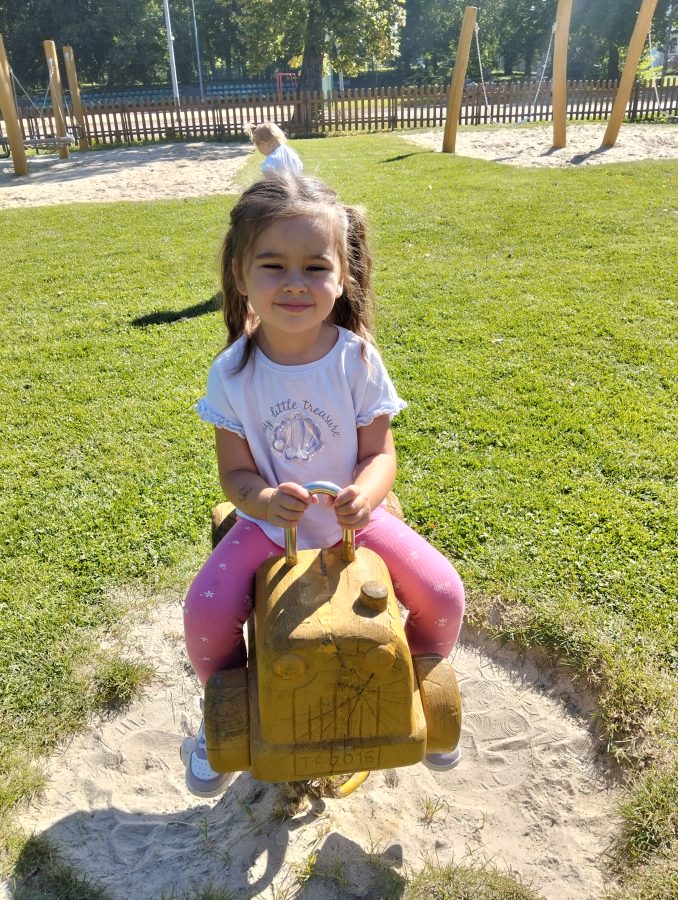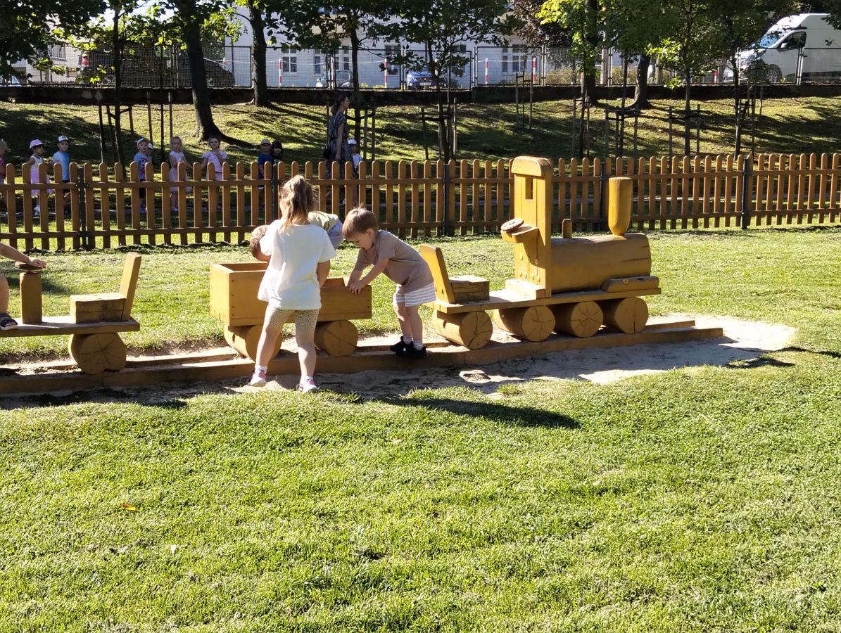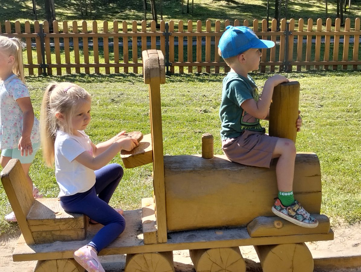 Nasze najmłodsze przedszkolaki po raz pierwszy wybrały się na plac zabaw. Największym zainteresowaniem cieszyła się drewniana ciuchcia, do której dzieci chętnie wsiadały i udawały małych maszynistów. Sporo radości sprawiły im także przejażdżki na bujakach – kolorowej biedronce i autku. Choć były to pierwsze chwile poza salą, dzieci od razu odnalazły się w nowych zabawach. Towarzyszyło im mnóstwo uśmiechu, radosnych okrzyków i pierwszych prób wspólnej integracji. To dopiero początek ich przygody na świeżym powietrzu, a my z radością będziemy obserwować, jak każdego dnia odkrywają coś nowego! 🌳✨