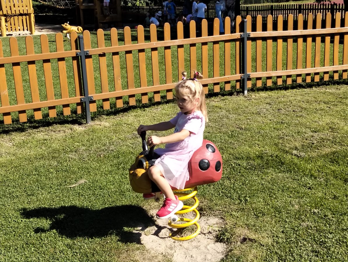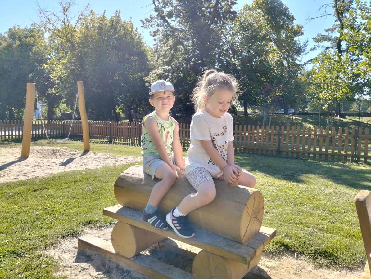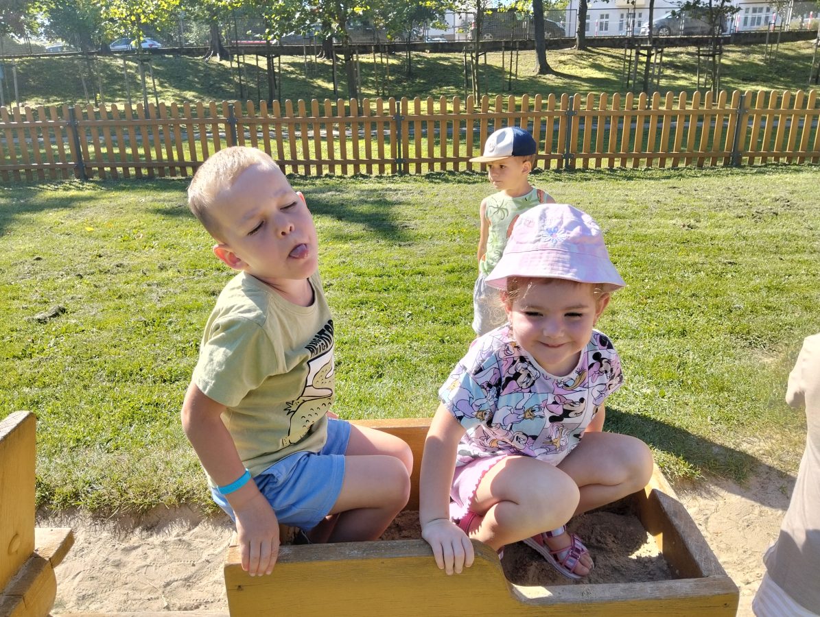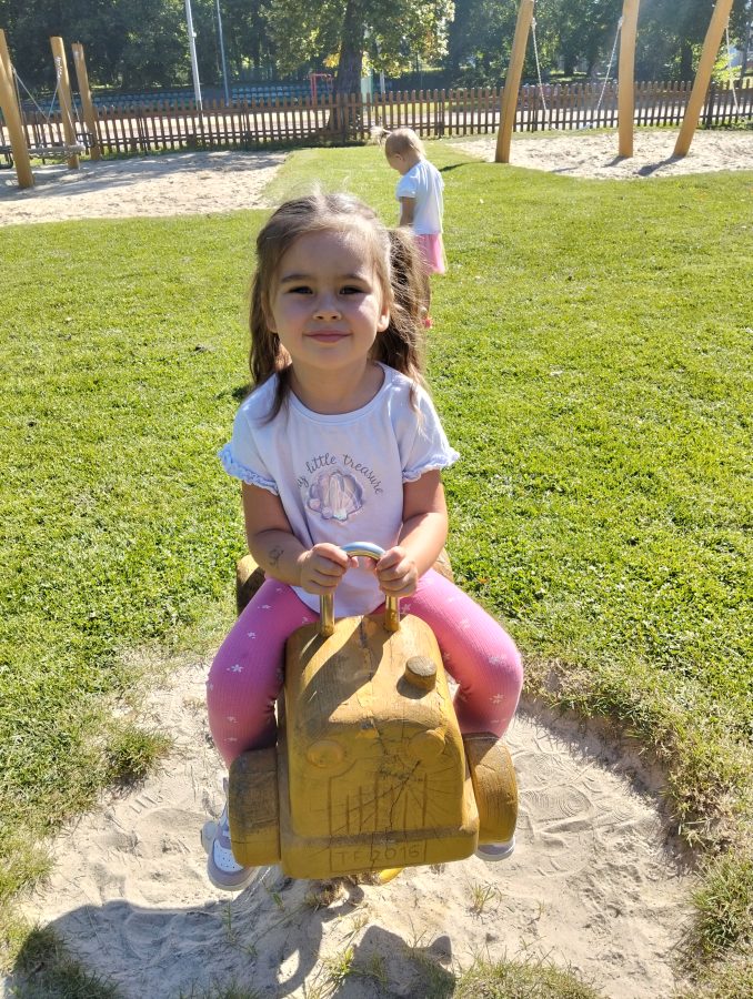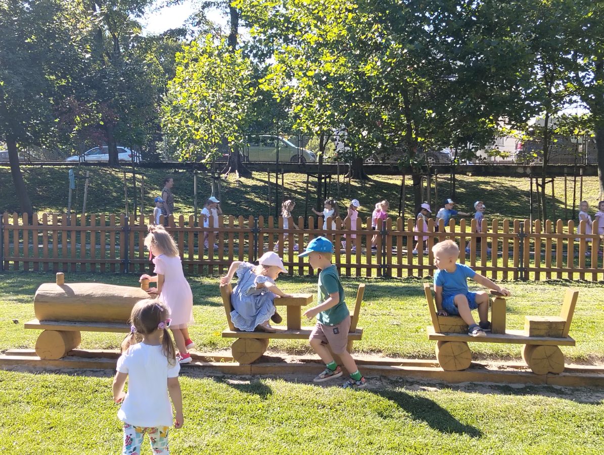 Nasze najmłodsze przedszkolaki po raz pierwszy wybrały się na plac zabaw. Największym zainteresowaniem cieszyła się drewniana ciuchcia, do której dzieci chętnie wsiadały i udawały małych maszynistów. Sporo radości sprawiły im także przejażdżki na bujakach – kolorowej biedronce i autku. Choć były to pierwsze chwile poza salą, dzieci od razu odnalazły się w nowych zabawach. Towarzyszyło im mnóstwo uśmiechu, radosnych okrzyków i pierwszych prób wspólnej integracji. To dopiero początek ich przygody na świeżym powietrzu, a my z radością będziemy obserwować, jak każdego dnia odkrywają coś nowego! 🌳✨