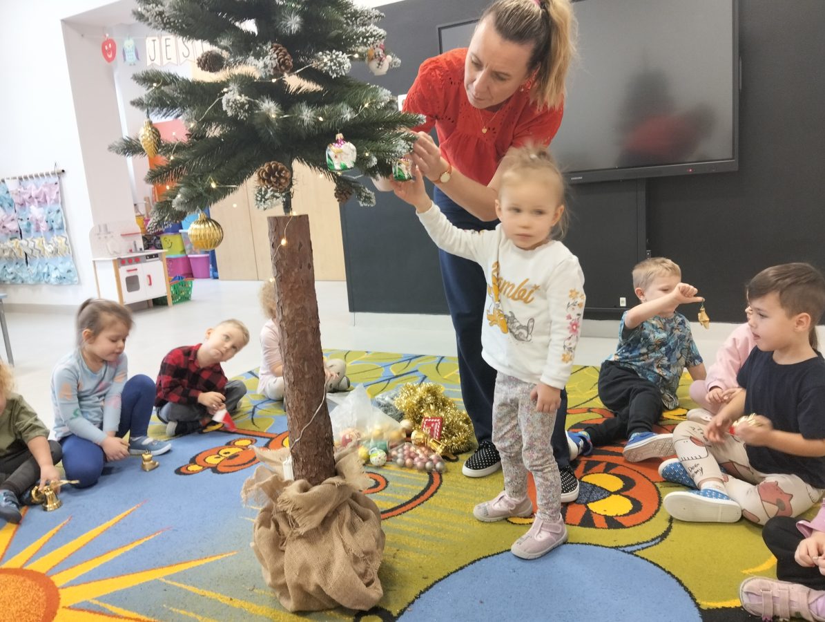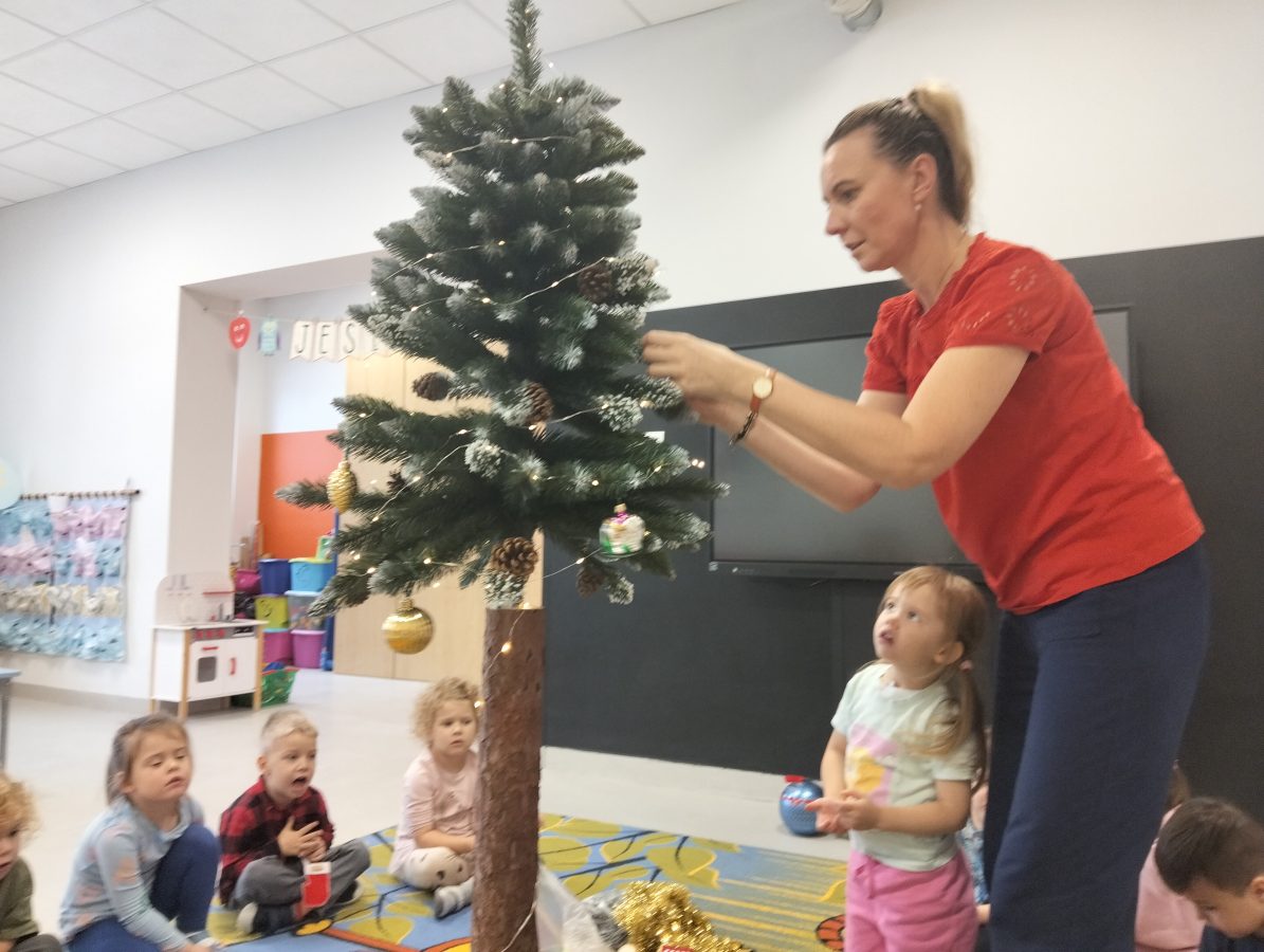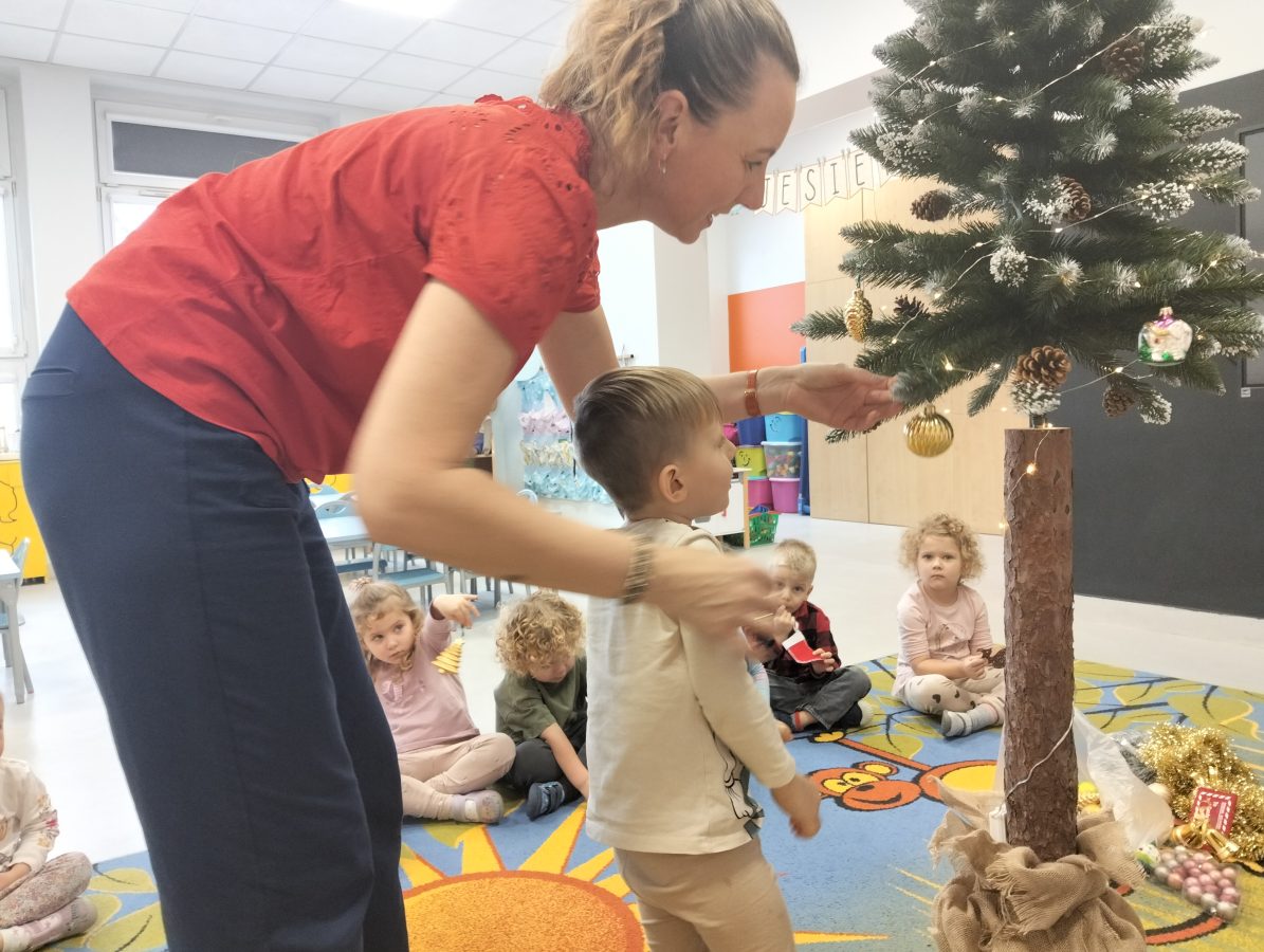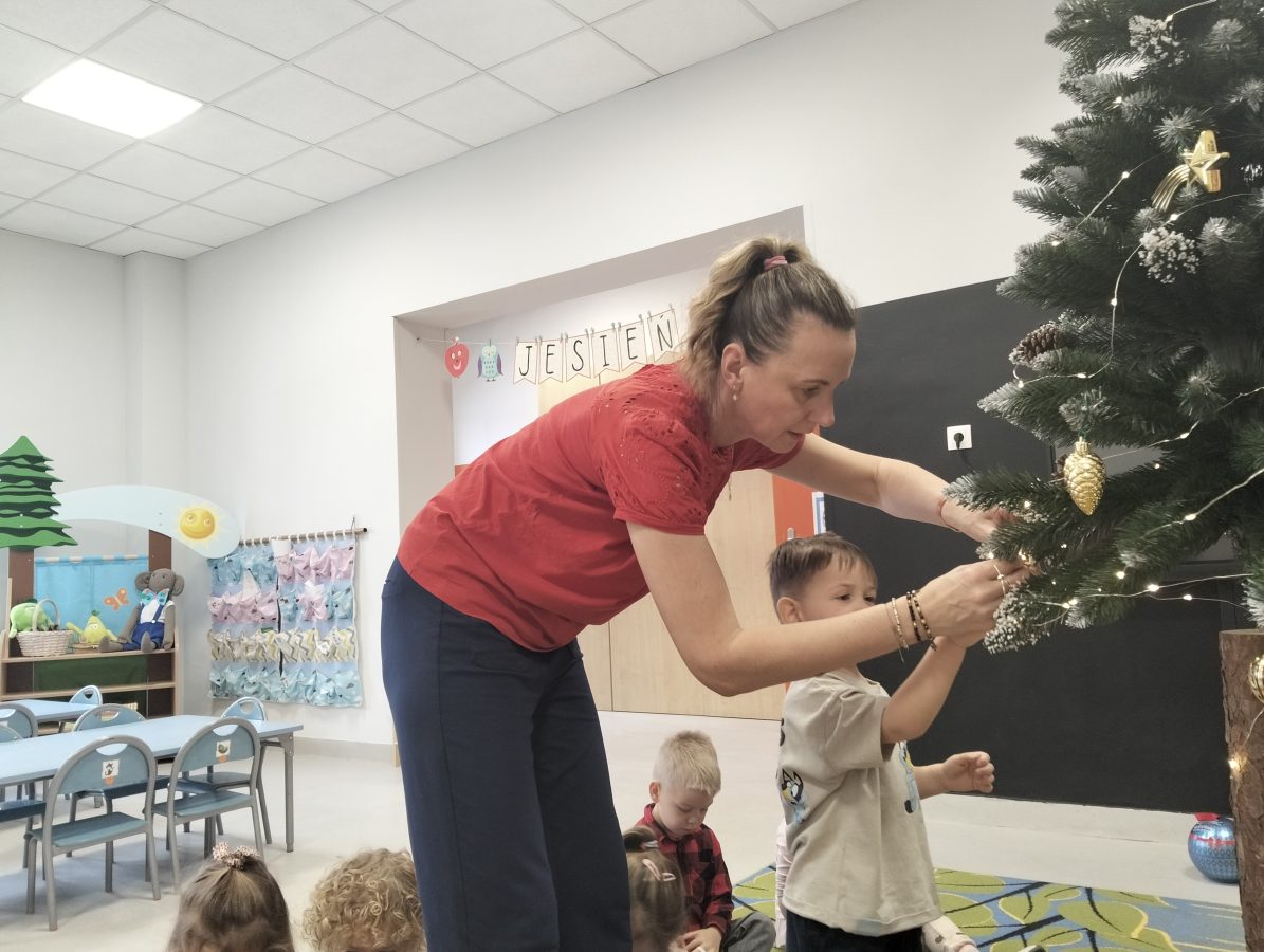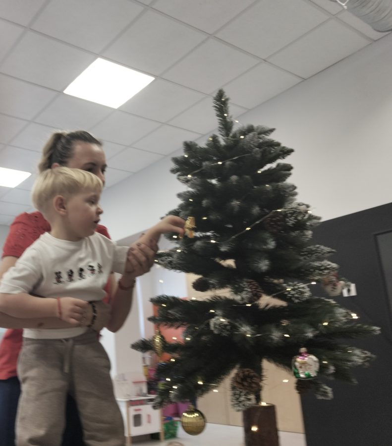 Dziś w naszej grupie wspólnie ubieraliśmy choinkę!🎄Trzylatki z ogromnym zaangażowaniem wybierały ozdoby i wieszały je na dolnych gałązkach, tworząc wyjątkowy, pełen dziecięcej radości świąteczny wystrój. Atmosfera była pełna uśmiechów i podekscytowania. Nasza choinka prezentuje się pięknie — dziękujemy dzieciom za wspaniałą współpracę!🥰 🎄✨