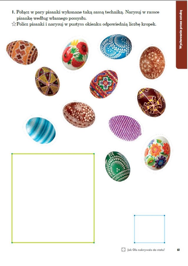 1.„Wielkanocny stół” – rozmowa zainspirowana wierszem E. Skarżyskiej „Wielkanocny stół”, poznanie tradycji i zwyczajów wielkanocnych panujących w domach rodzinnych dzieci, przypomnienie zasad kultury i potrzeby okazywania szacunku osobom starszym.