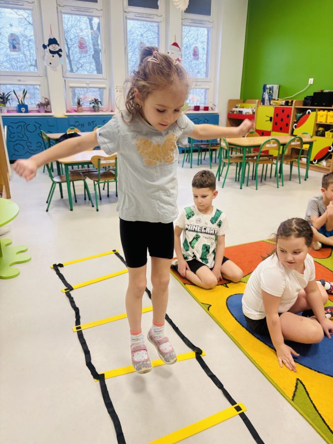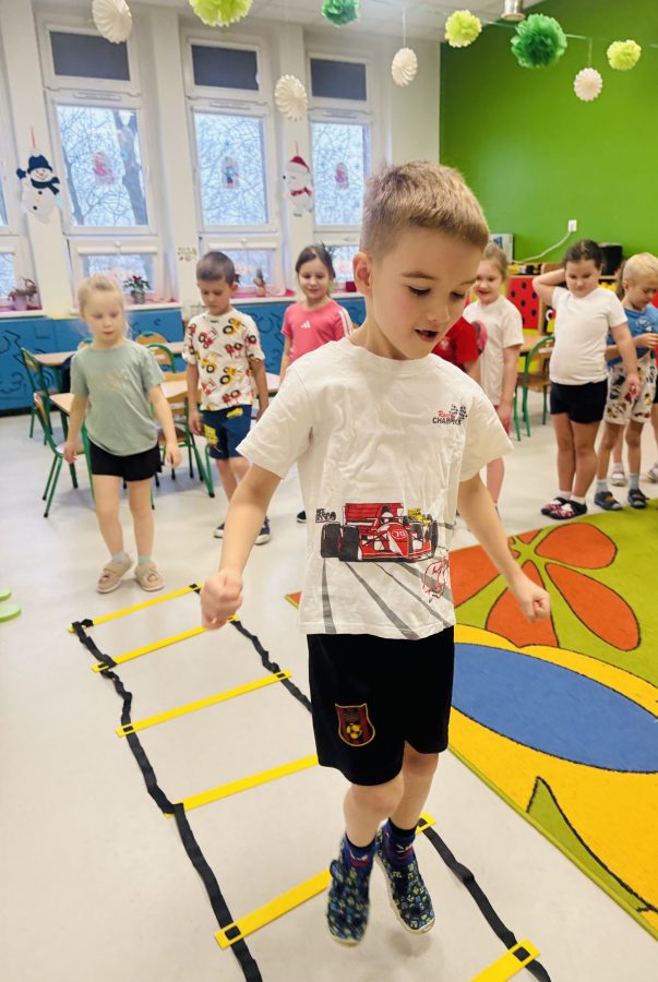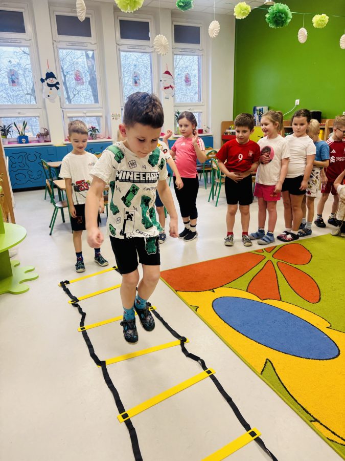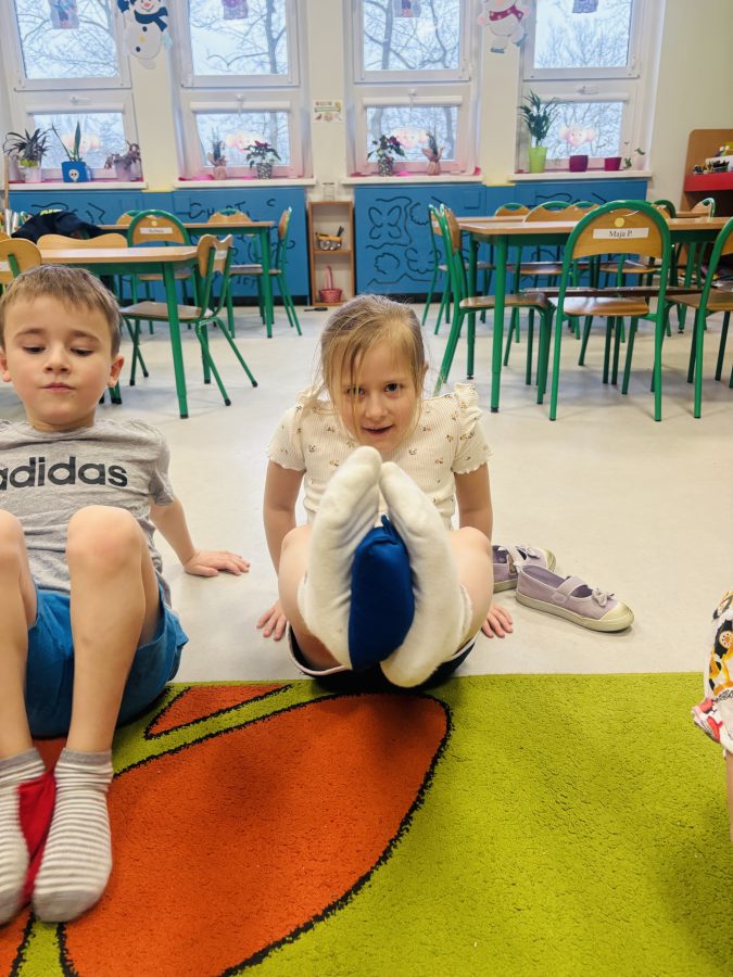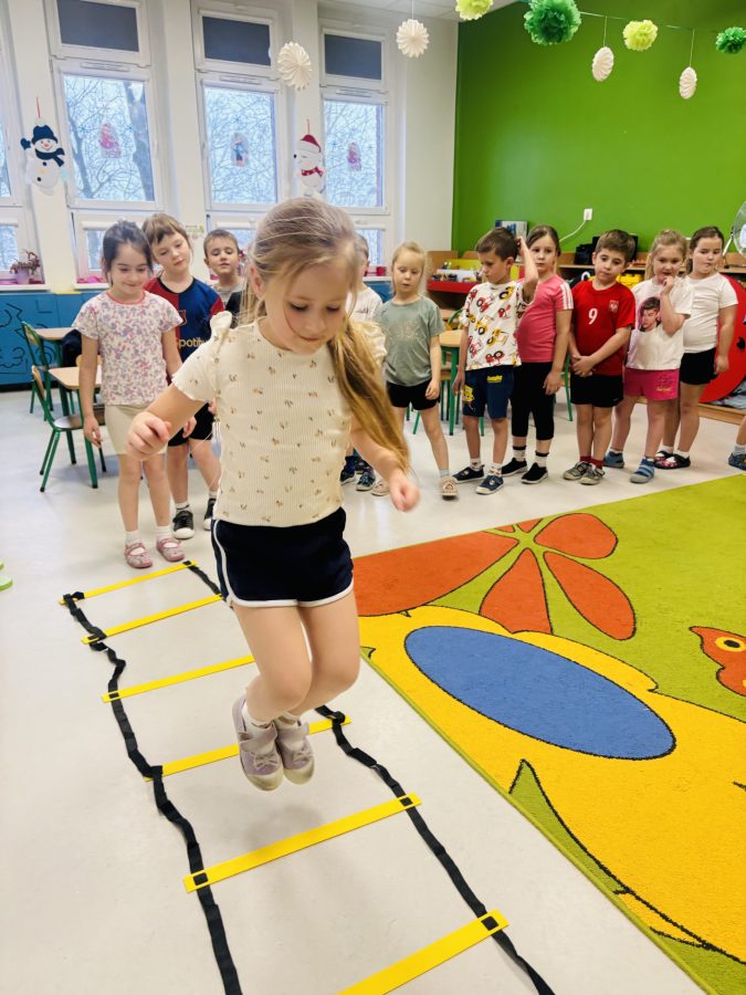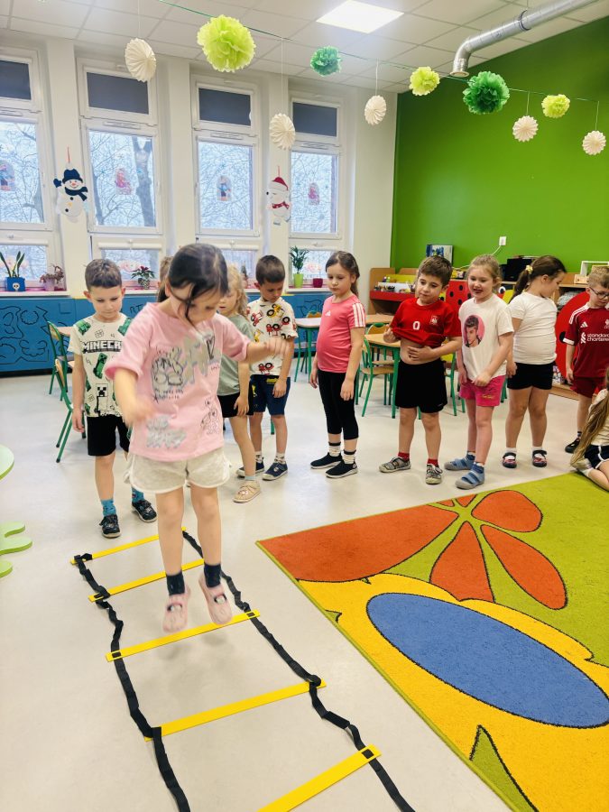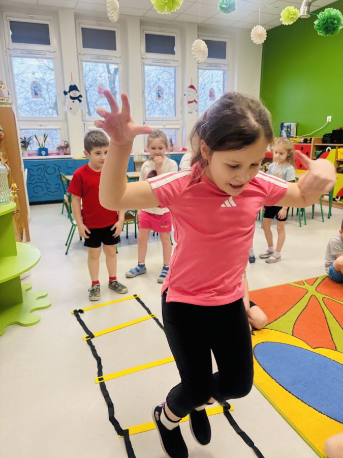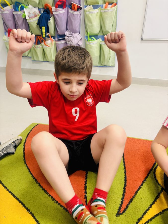 Gimnastyka 馃じ „Gimnastyka to podstawa, sport dla zdrowia wa偶na sprawa, r臋ce w g贸r臋, w prz贸d i w bok, sk艂on do przodu, przysiad, skok”.