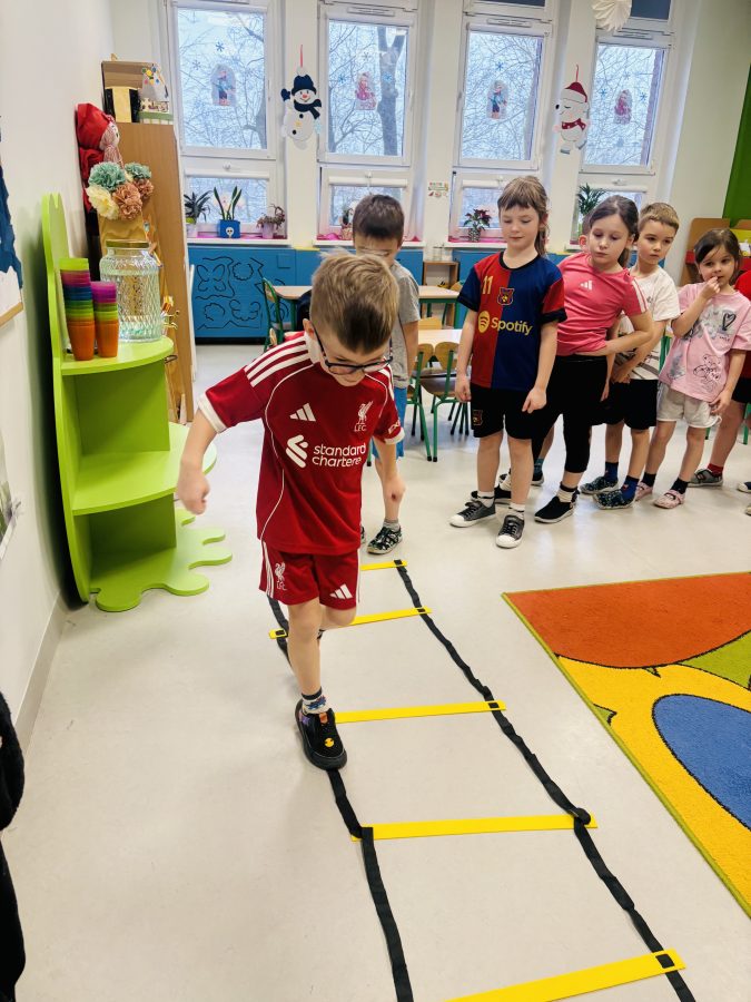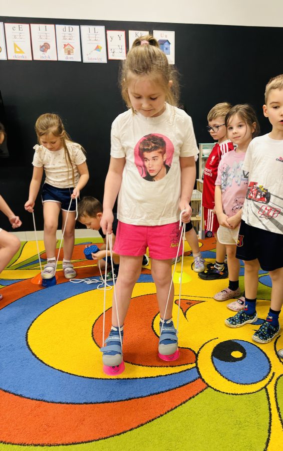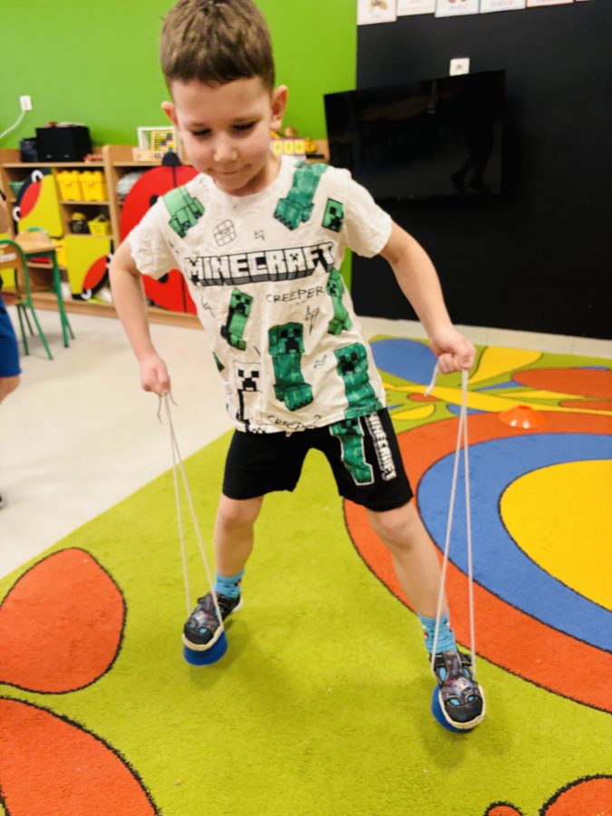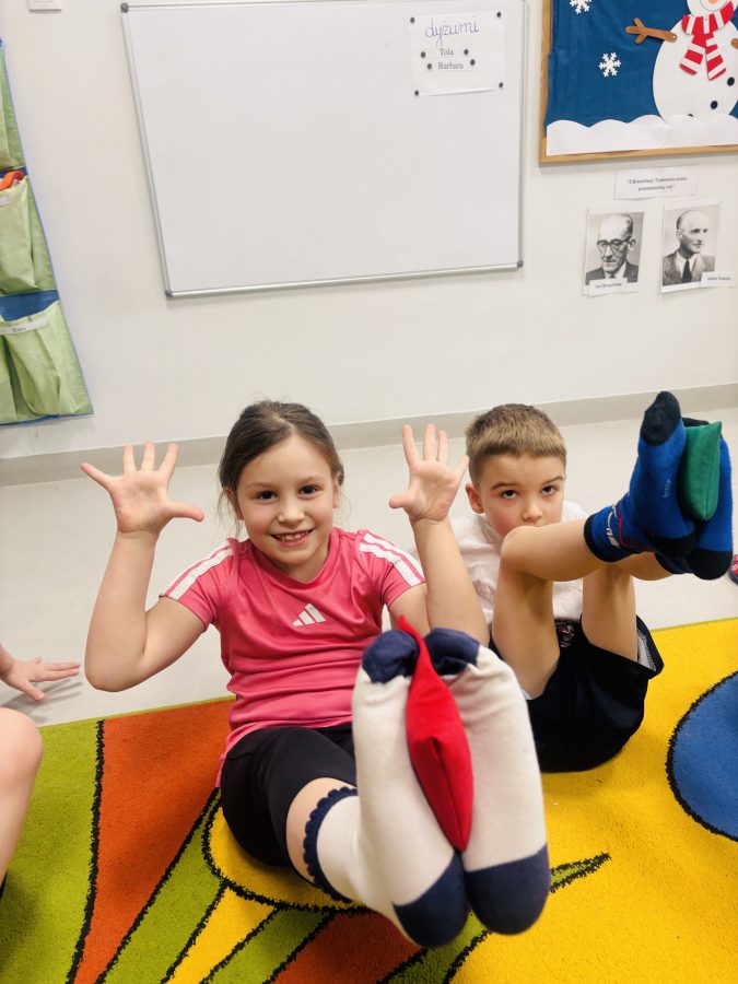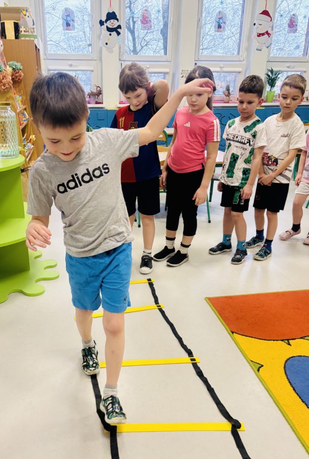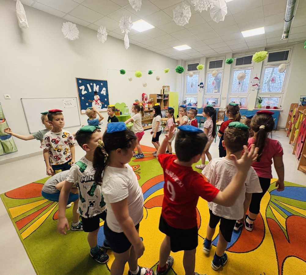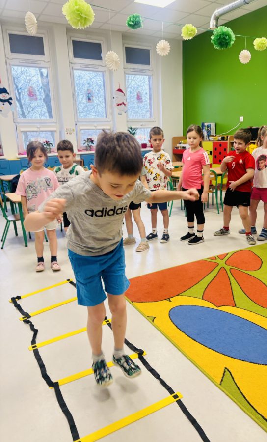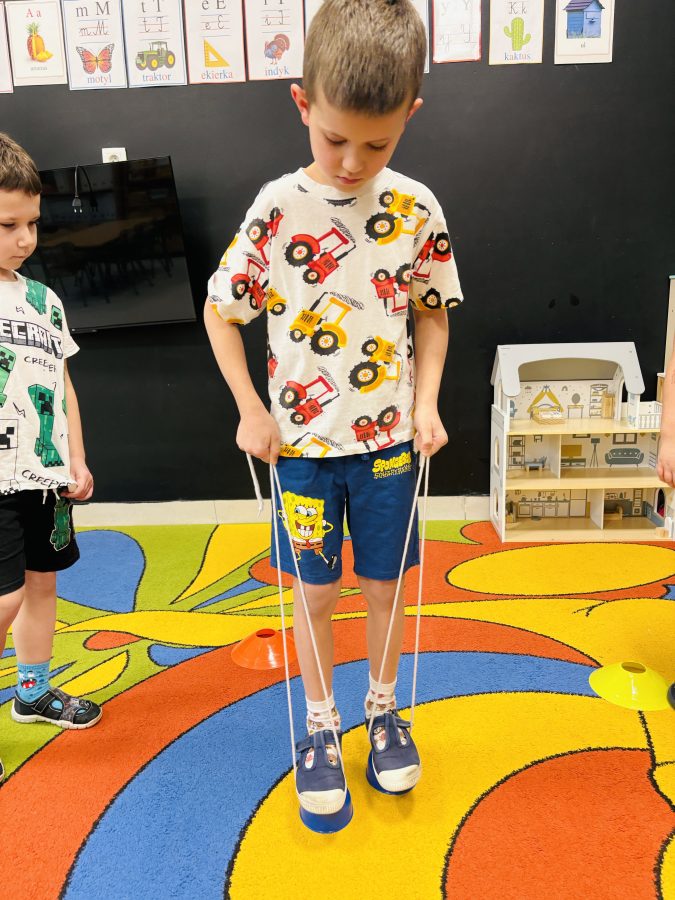 Gimnastyka 馃じ „Gimnastyka to podstawa, sport dla zdrowia wa偶na sprawa, r臋ce w g贸r臋, w prz贸d i w bok, sk艂on do przodu, przysiad, skok”.