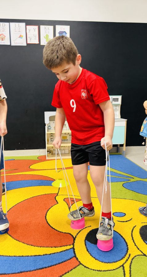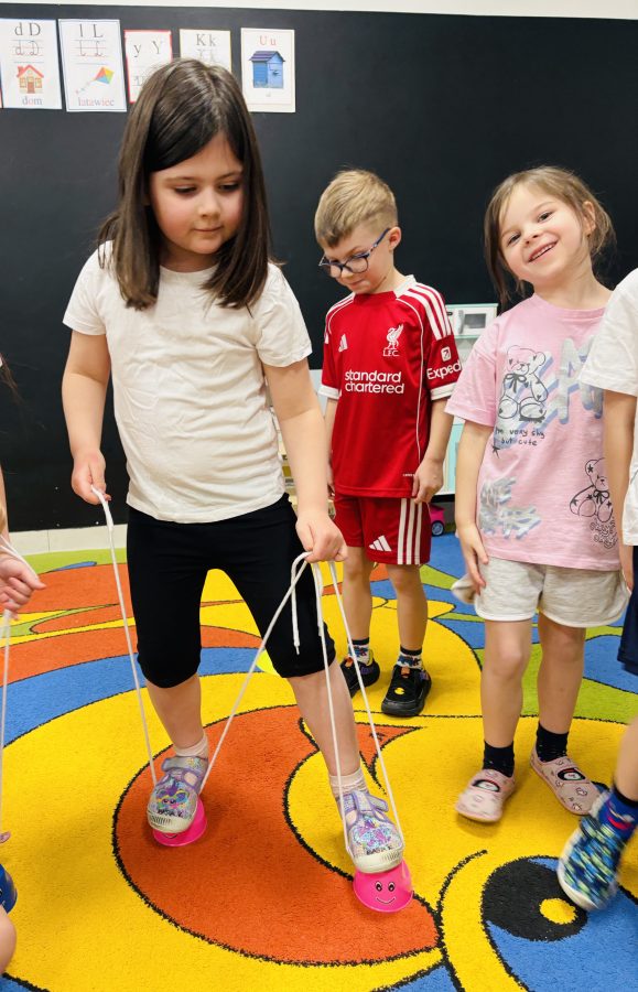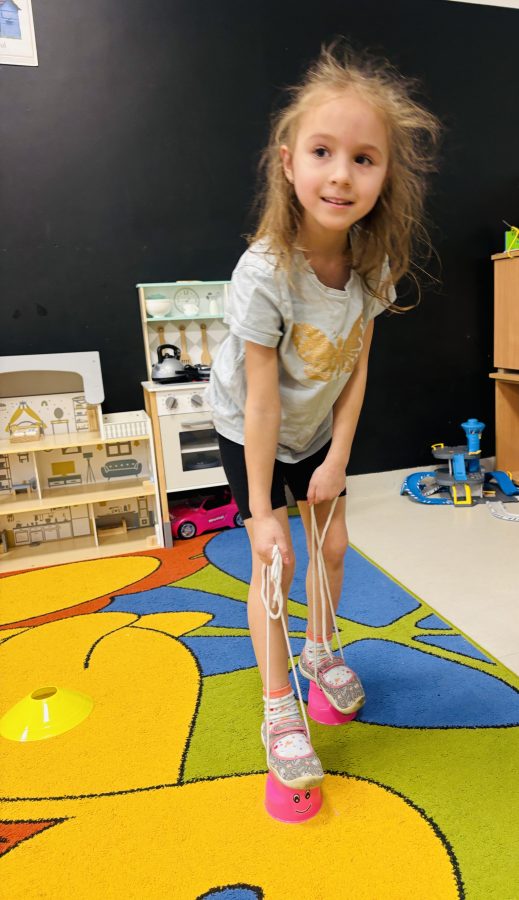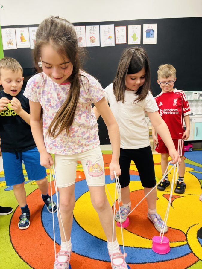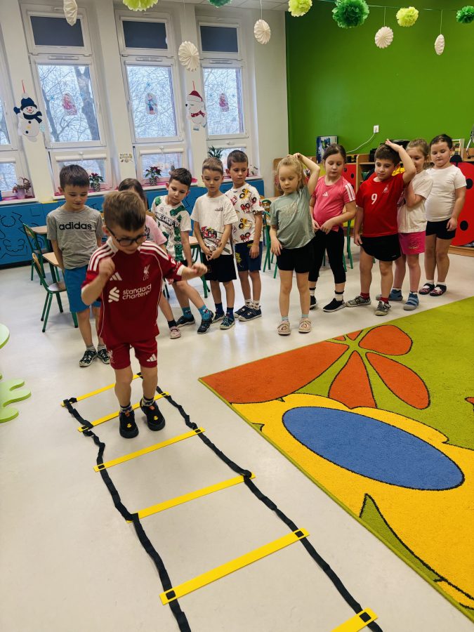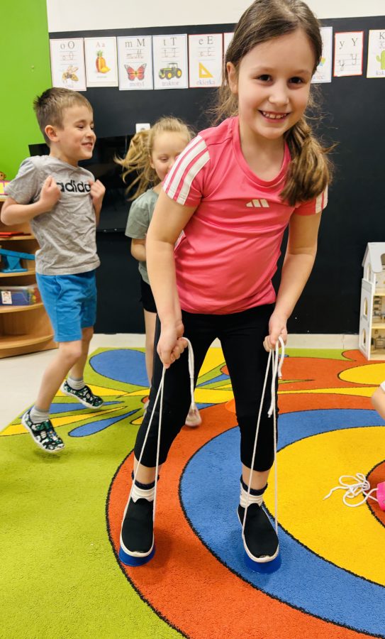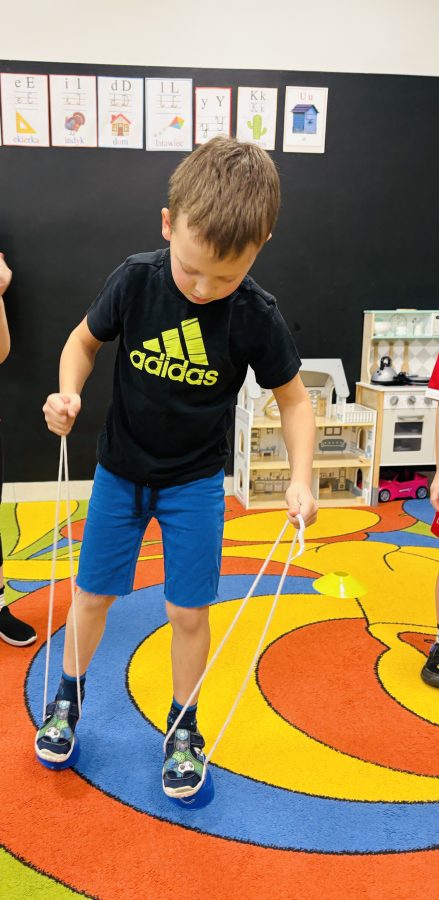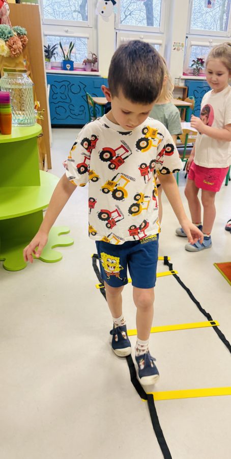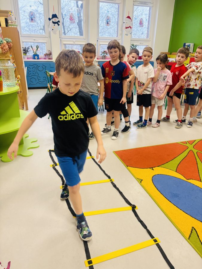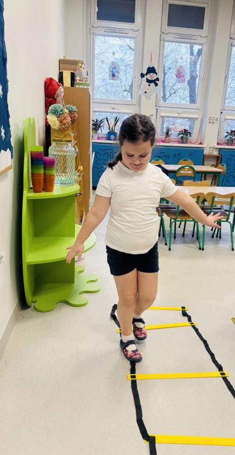 Gimnastyka 馃じ „Gimnastyka to podstawa, sport dla zdrowia wa偶na sprawa, r臋ce w g贸r臋, w prz贸d i w bok, sk艂on do przodu, przysiad, skok”.