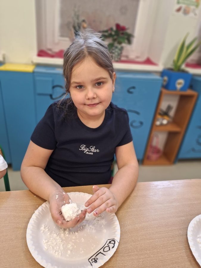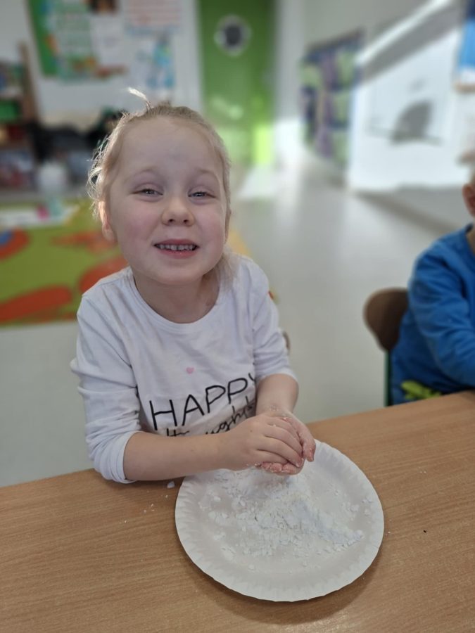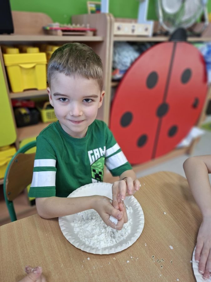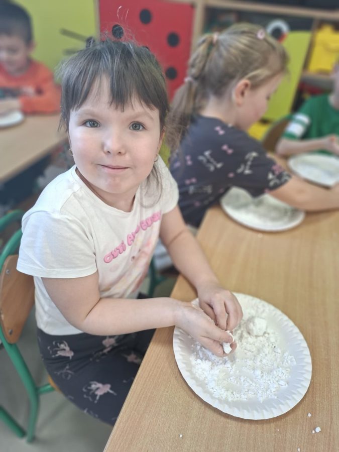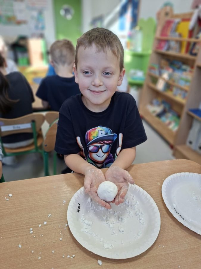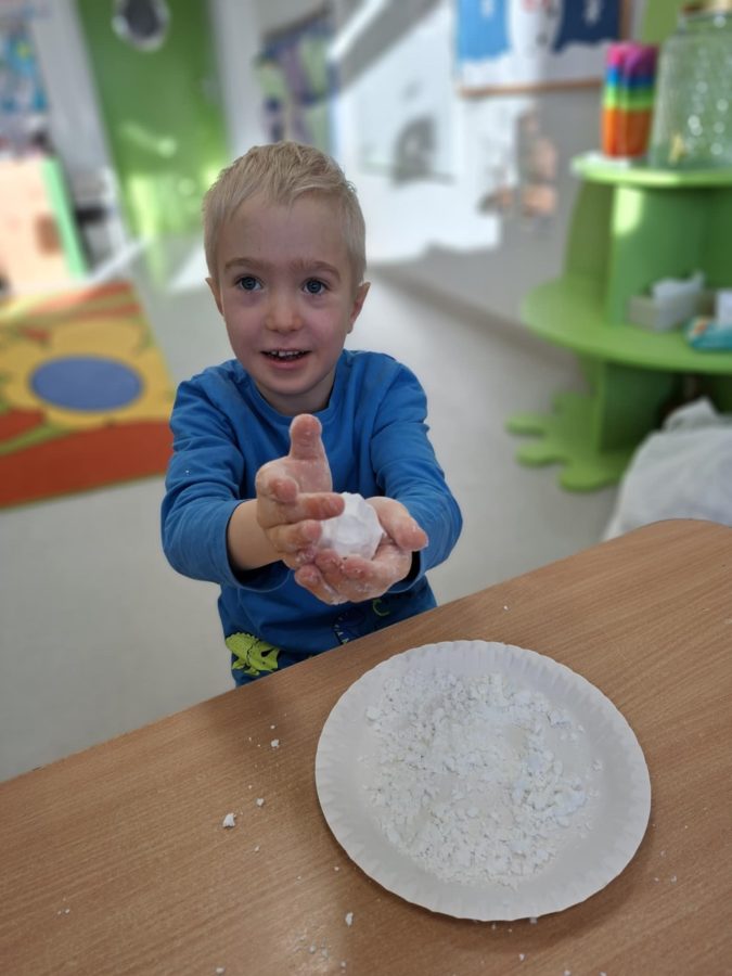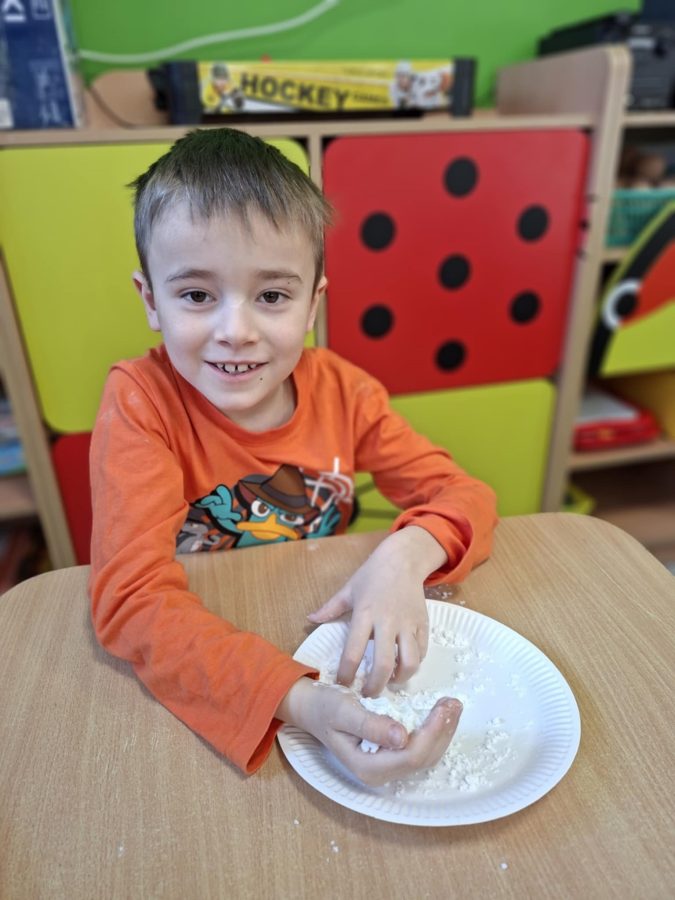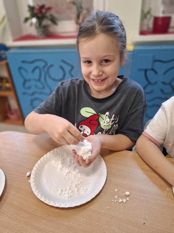 Na zakończenie zajęć dzieci przygotowały sztuczny śnieg z mąki ziemniaczanej i wody – zabawy było co niemiara!