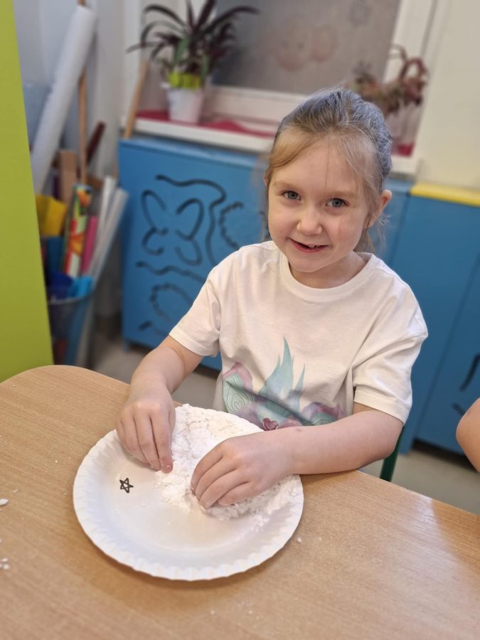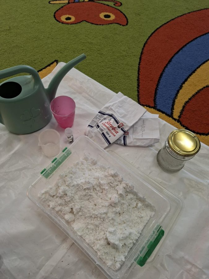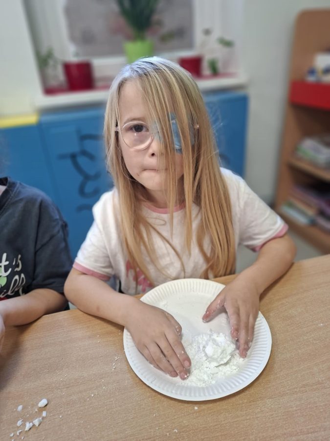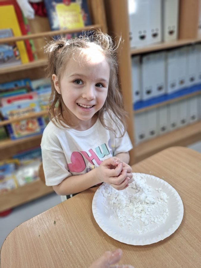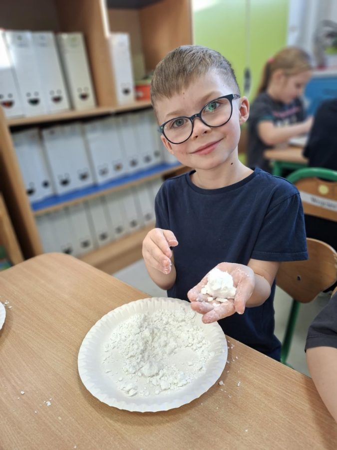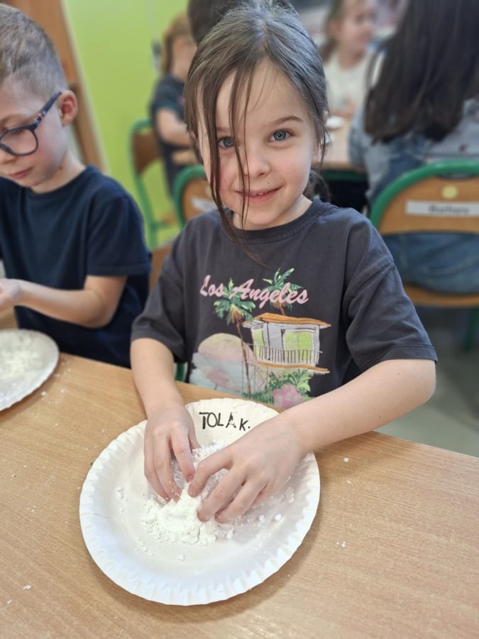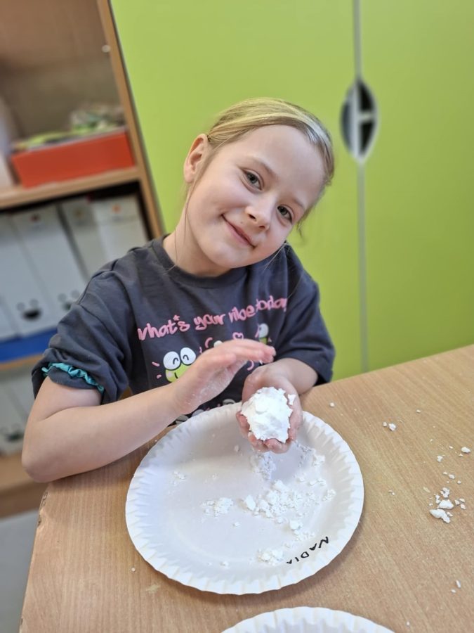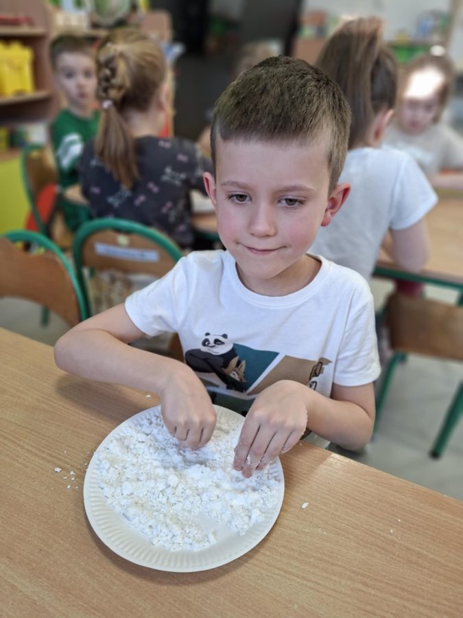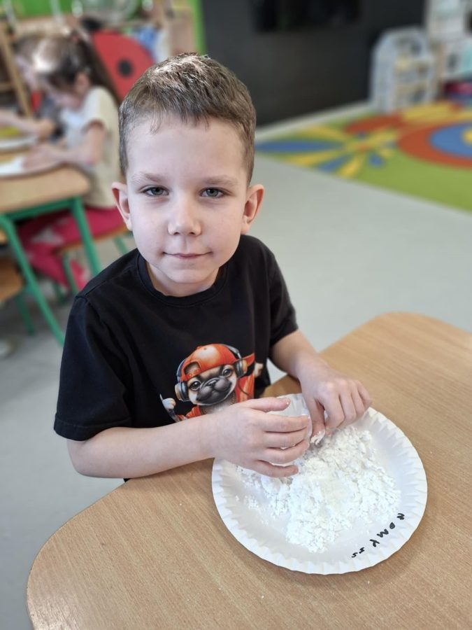 Na zakończenie zajęć dzieci przygotowały sztuczny śnieg z mąki ziemniaczanej i wody – zabawy było co niemiara!