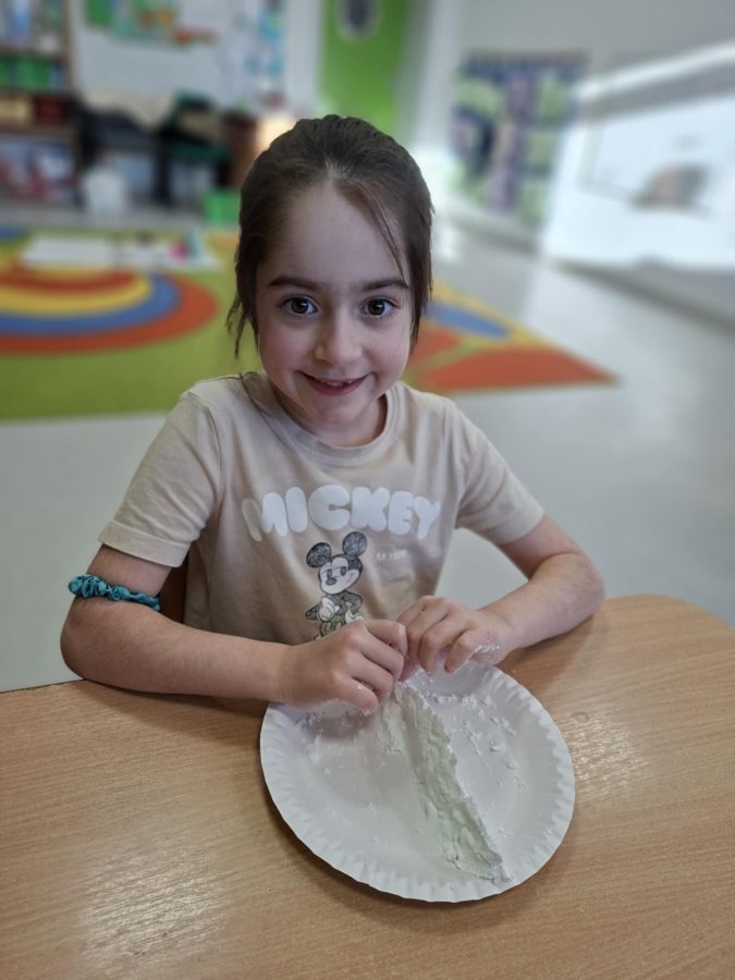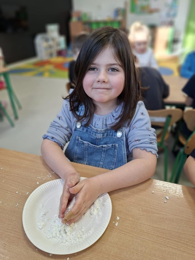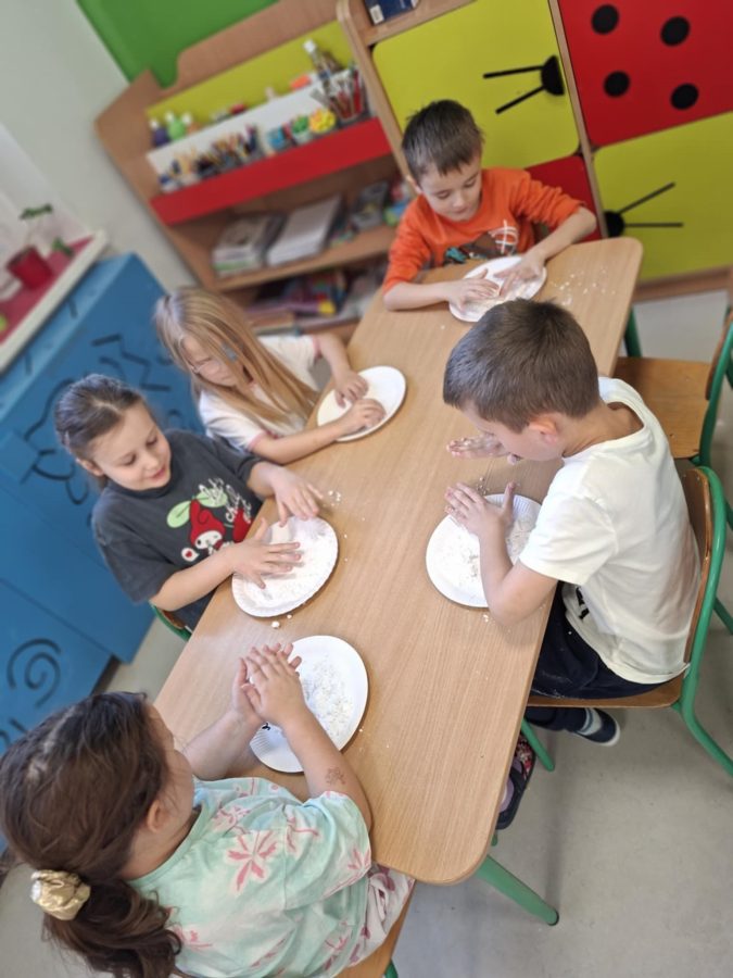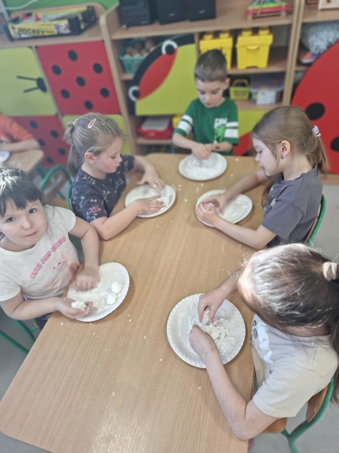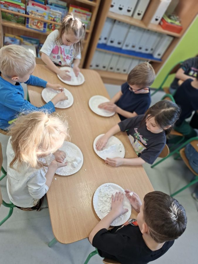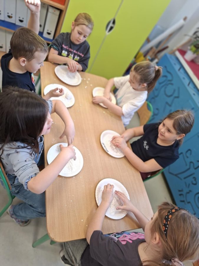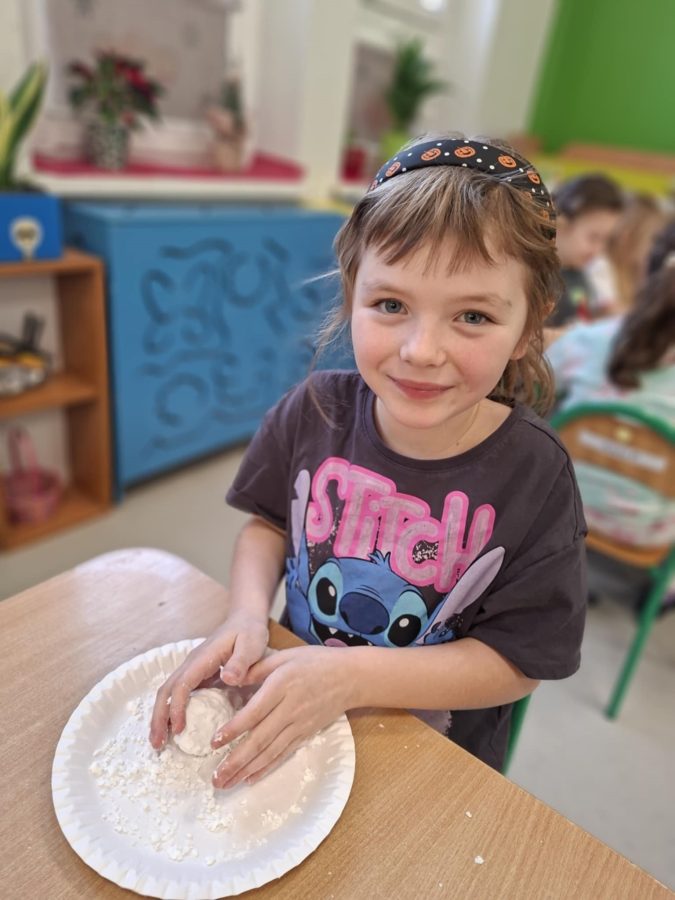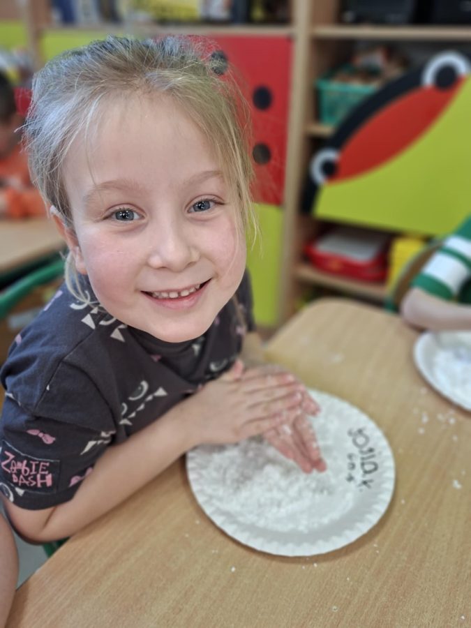 Na zakończenie zajęć dzieci przygotowały sztuczny śnieg z mąki ziemniaczanej i wody – zabawy było co niemiara!