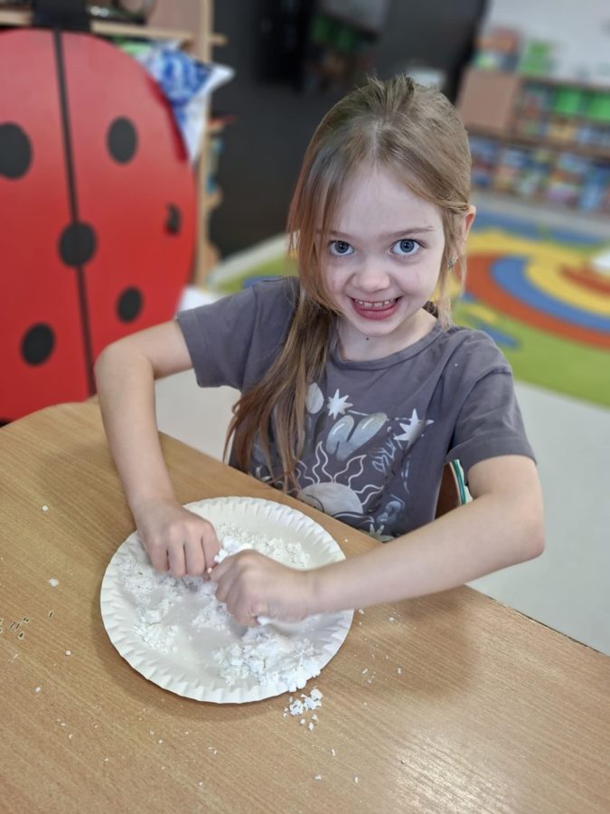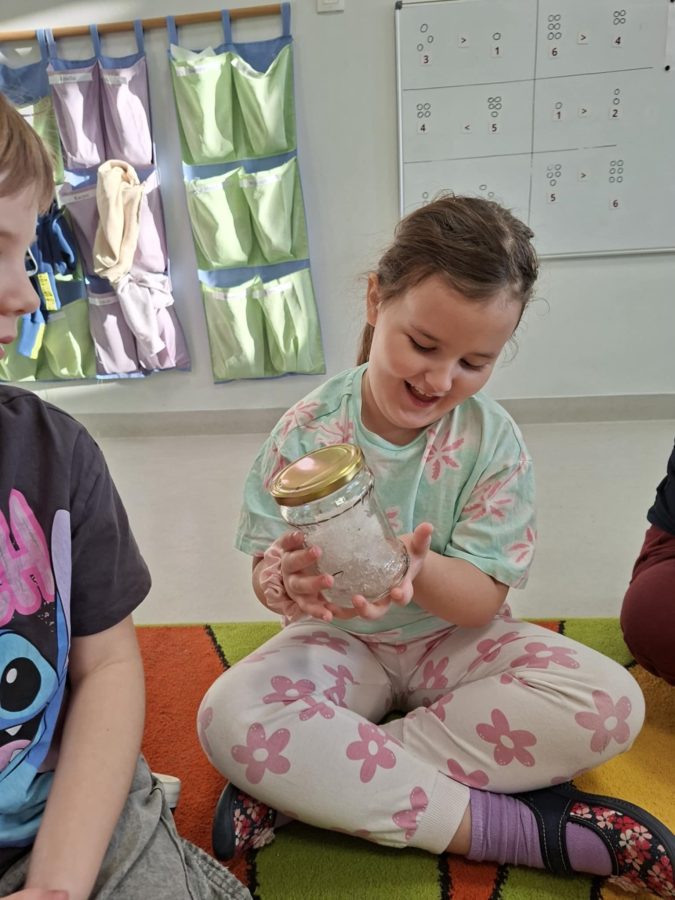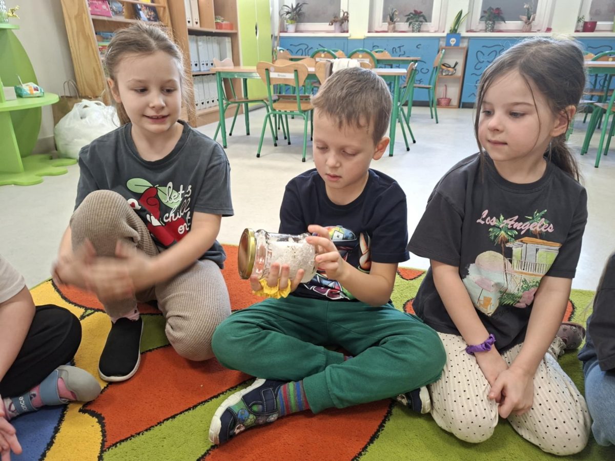 Dzieci przeprowadziły obserwację przyrodniczą – „śnieg w słoiku”, podczas której mogły zaobserwować zmianę stanu skupienia wody ze stałego na ciekły oraz  przekonać się, że śnieg wcale nie jest taki czysty.