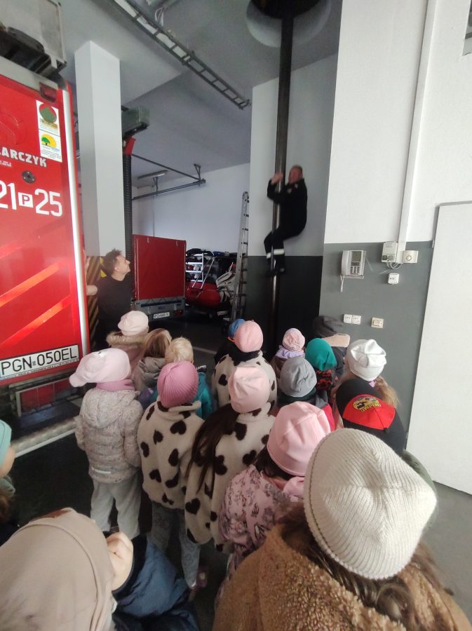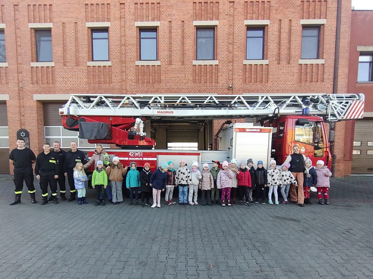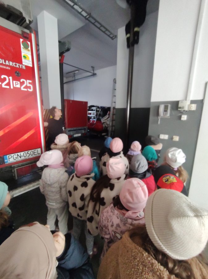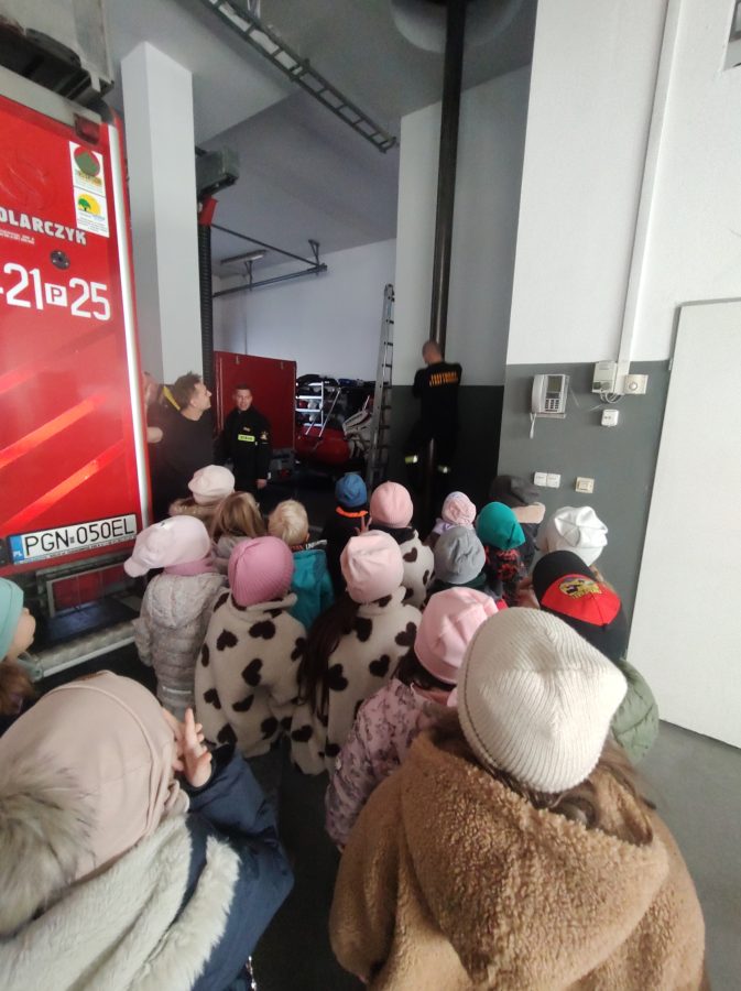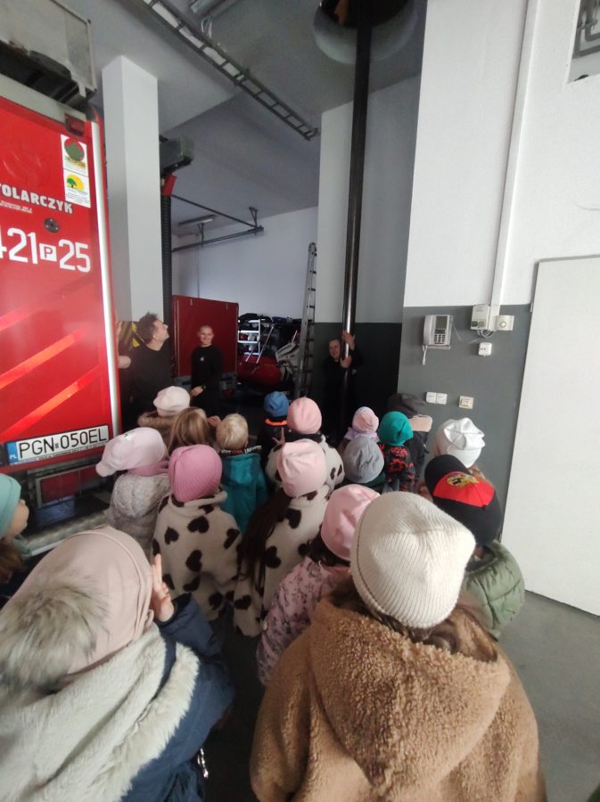 Dzisiaj przedszkolaki udały się z wizytą do pobliskiej Straży Pożarnej. Na miejscu przywitał nas strażak, który oprowadził dzieci po komendzie. Przedszkolaki dowiedziały się na czym polega praca strażaka, kiedy należy wzywać pomoc, jak przestrzegać bezpieczeństwa w domu oraz środowisku wodnym. Panowie strażacy pokazali dzieciom podstawowe sprzęty strażackie i mundury. Największe wrażenie zrobiły na dzieciach ogromne wozy strażackie z syrenami i błyszczącymi światłami oraz zjazdy strażaków po rurze. Przedszkolakom bardzo się podobało i wielu z nich stwierdziło, że w przyszłości chciałoby zostać strażakiem.